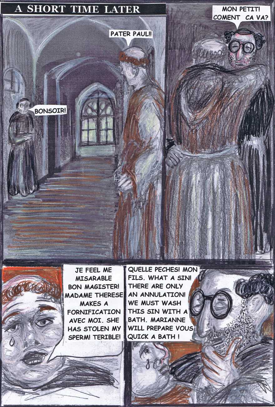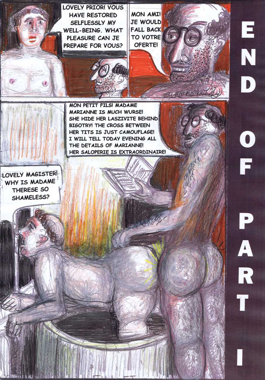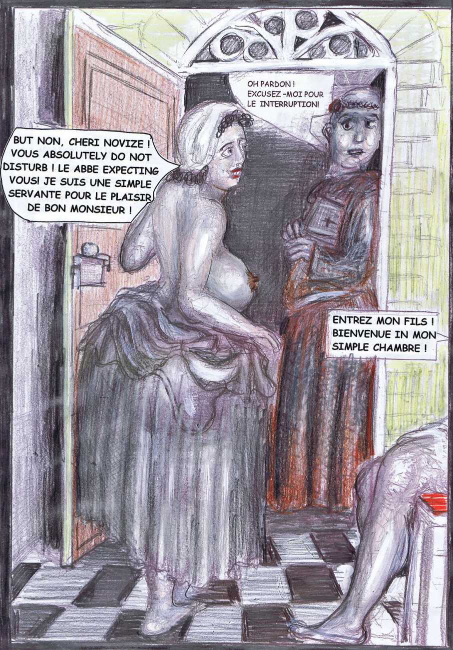 Whether the establishment concerned is large or small, the plot is the same. We are in Paris at the time of the French Revolution at the end of the eighteenth century. The Saarbrücken Benedictine monk Michel Puderbach is in the Abbaye prison, awaiting the guillotine for the crime of seducing Robbespierre’s favourite mistress. As he reflects on his life, his thoughts revolve around the town of Péchésviller-sur-Meuse (péché is French for sin), the small riverside town where everyone has sex all the time, including the lascivious Monsieur Bouc, abbot of the Benedictine monastery, and his voluptuous mistresses Thérèse and Marianne.