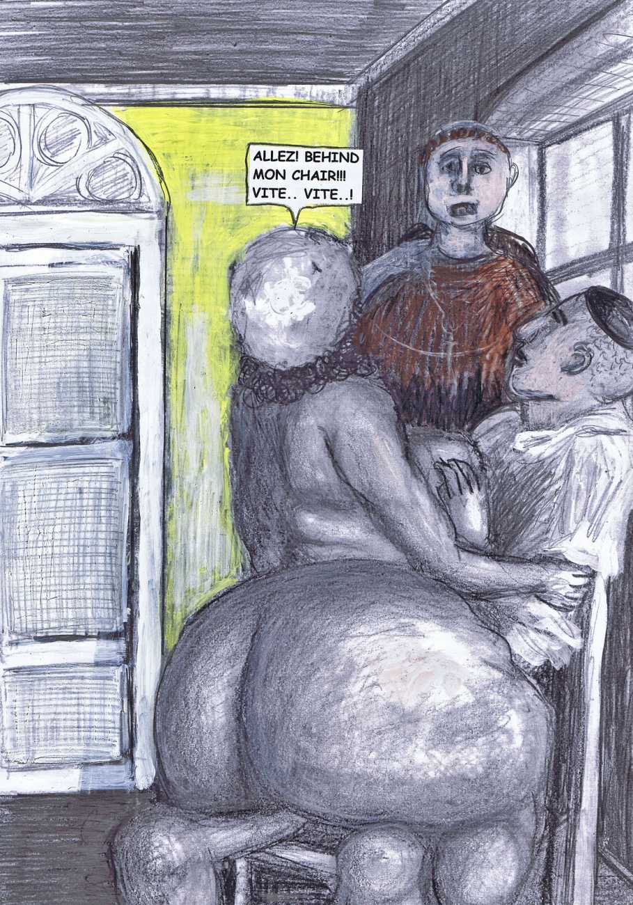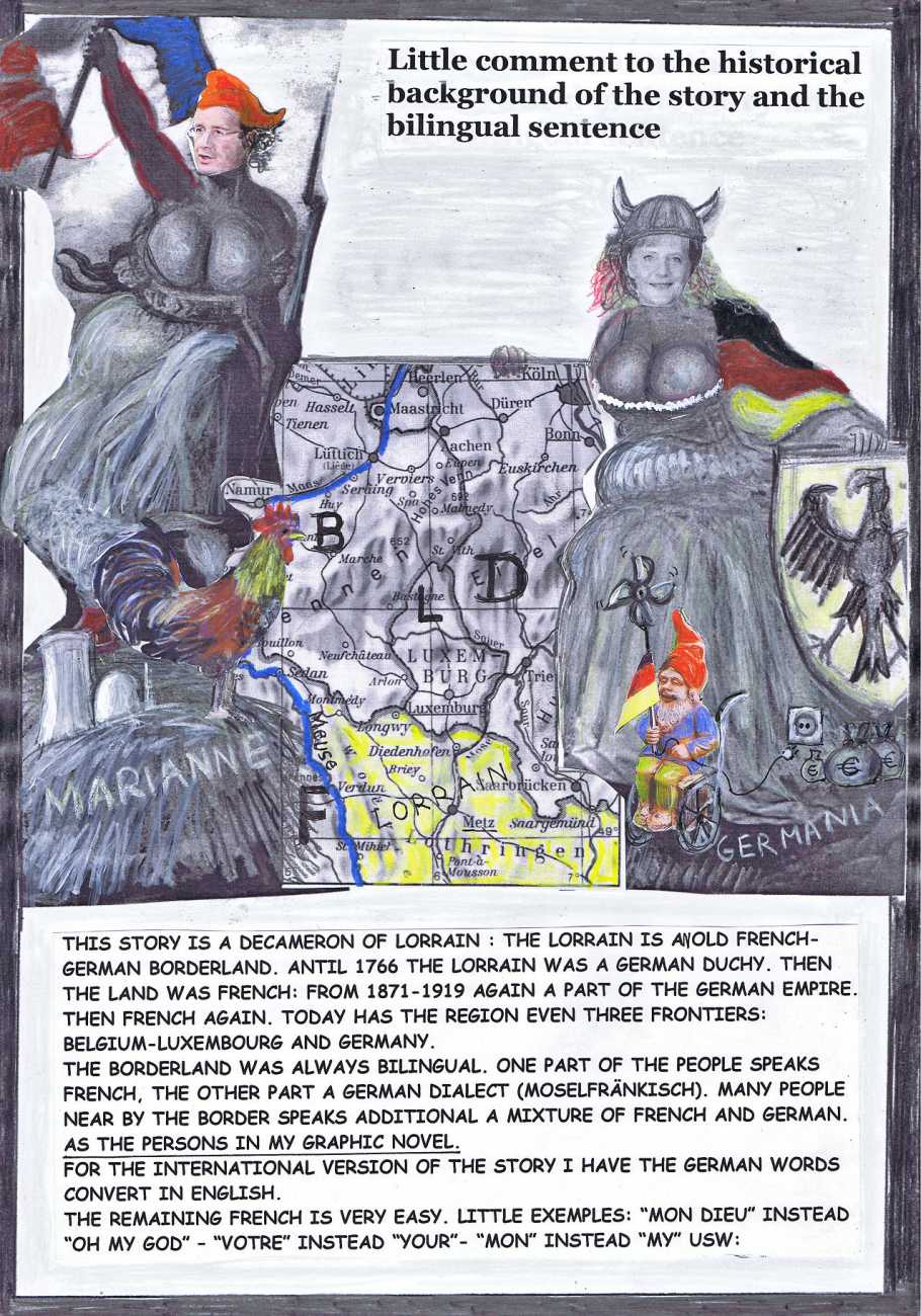 The graphics of Lelek’s story are self-explanatory, though the plot – and especially the language – require a little explanation, which is provided in the first few pages in a hilarious (and maybe not entirely intended) polyglot of French, German and broken English. As Lelek explains, ‘Since Lorraine has only been part of the Grande Nation for a generation thanks to the friendly troops of Louis XIV, the actors speak terrible French, or rather a mixture of Moselle Franconian and French, an insult to all Francophile language perfectionists, and especially to French teachers. Anyone who has a sense of humour, on the other hand, will learn much of the noble language in a playful, cheerful way in this bilingue bande dessinée, so they will easily be able to order a coffee in Strasbourg.’ To add to the amusement, the German is mostly translated into pidgin English, resulting in some wonderfully seductive lines.