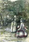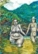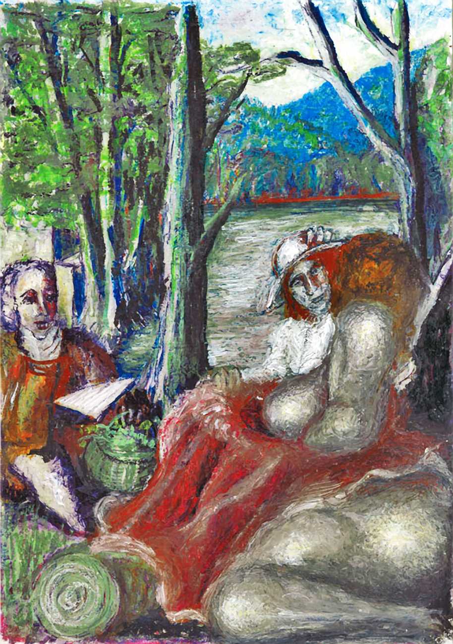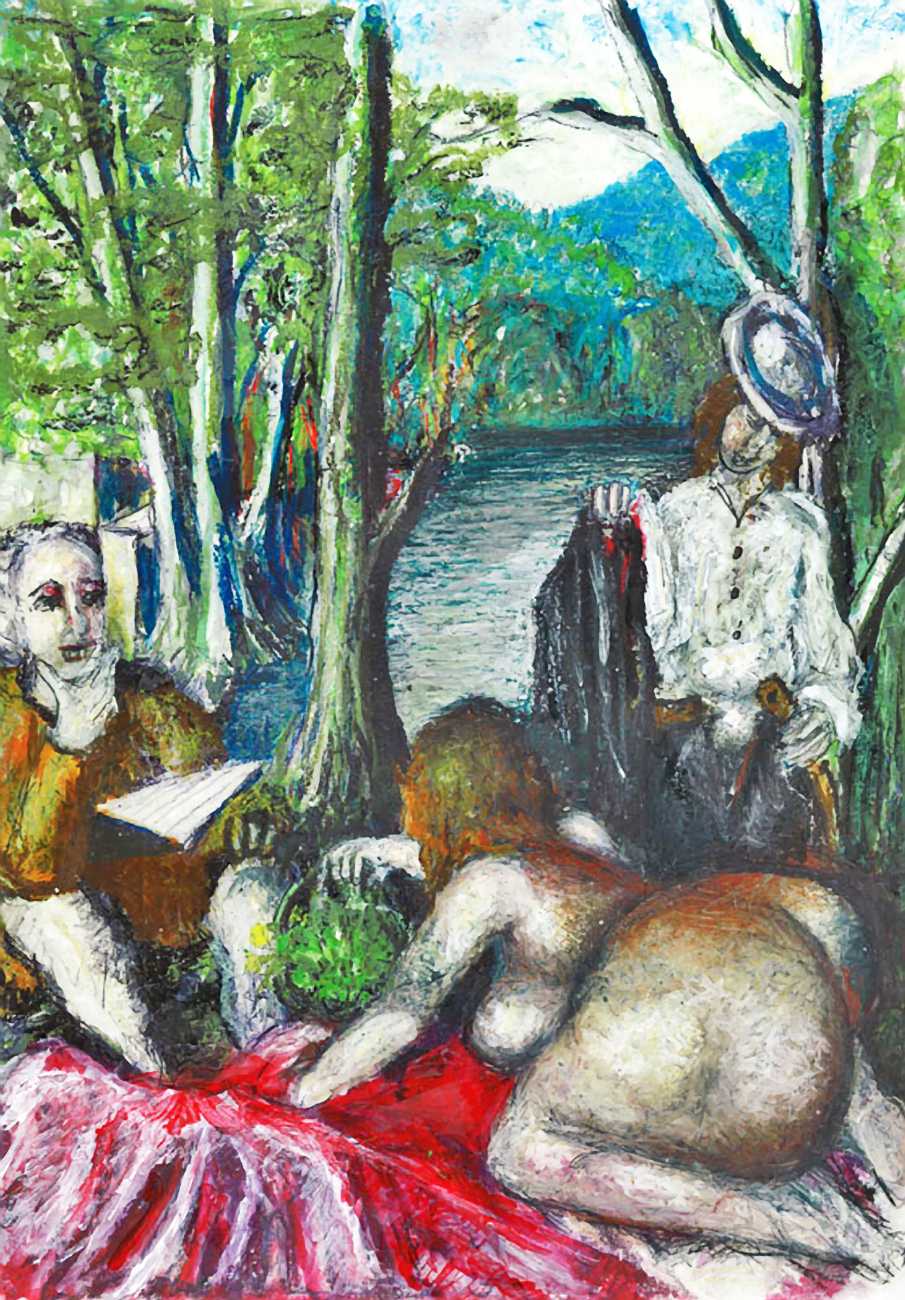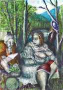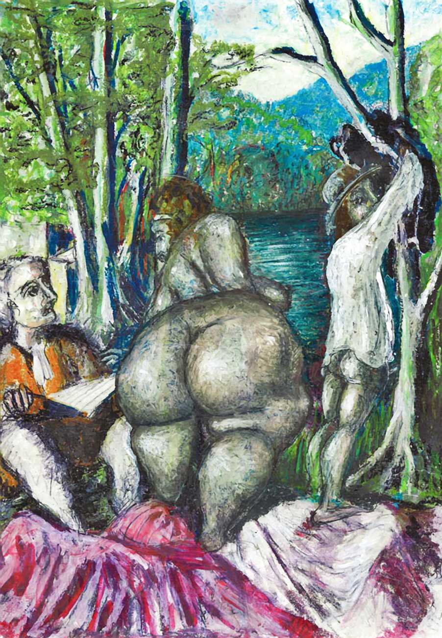 In the series the artist imagines an erotic encounter between the young Rousseau and a large women in a ‘wild’ setting, illustrating his preoccupation with his naturalistic views on human nature. In several of the drawings an older Rousseau reads sage advice, presumably from his own book.