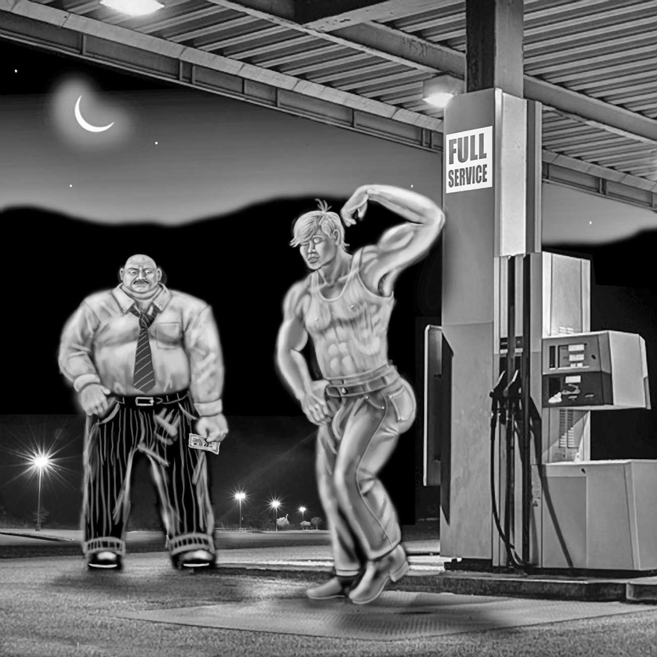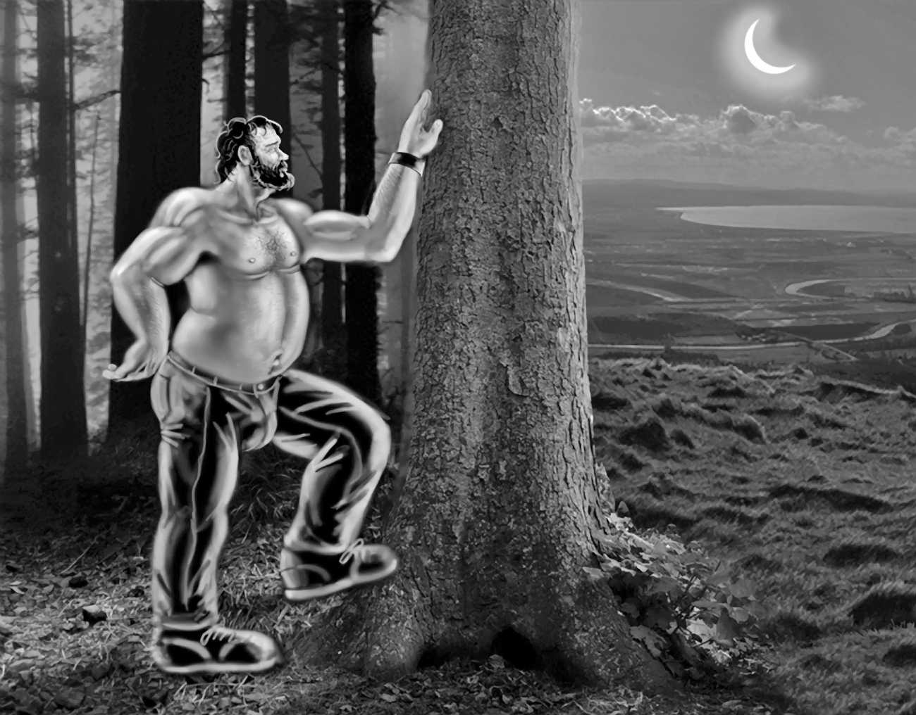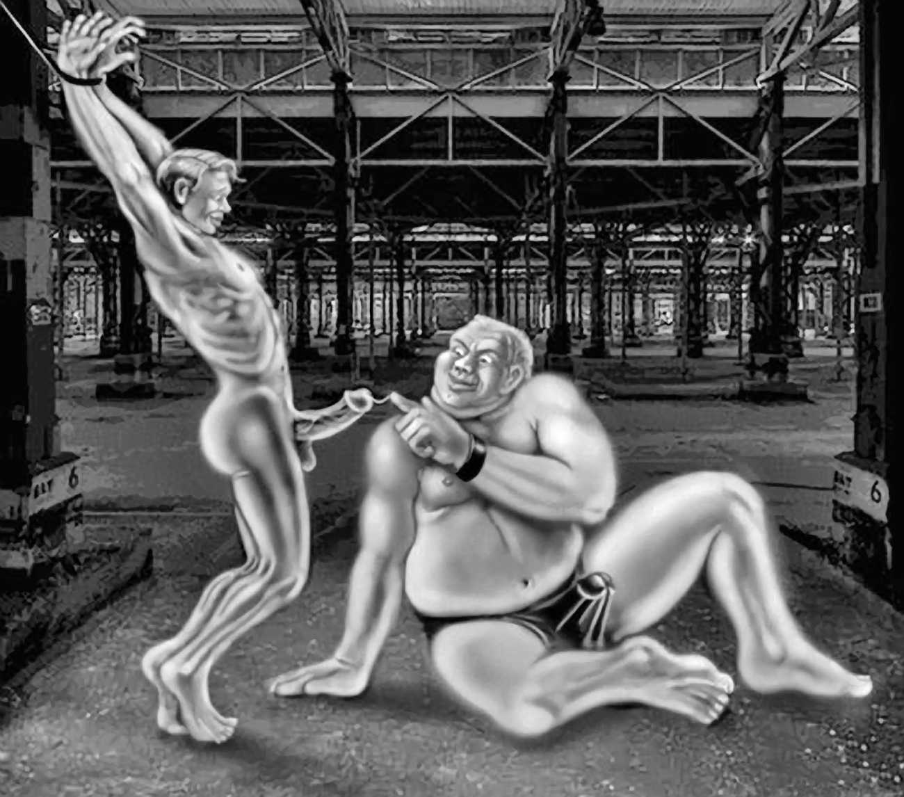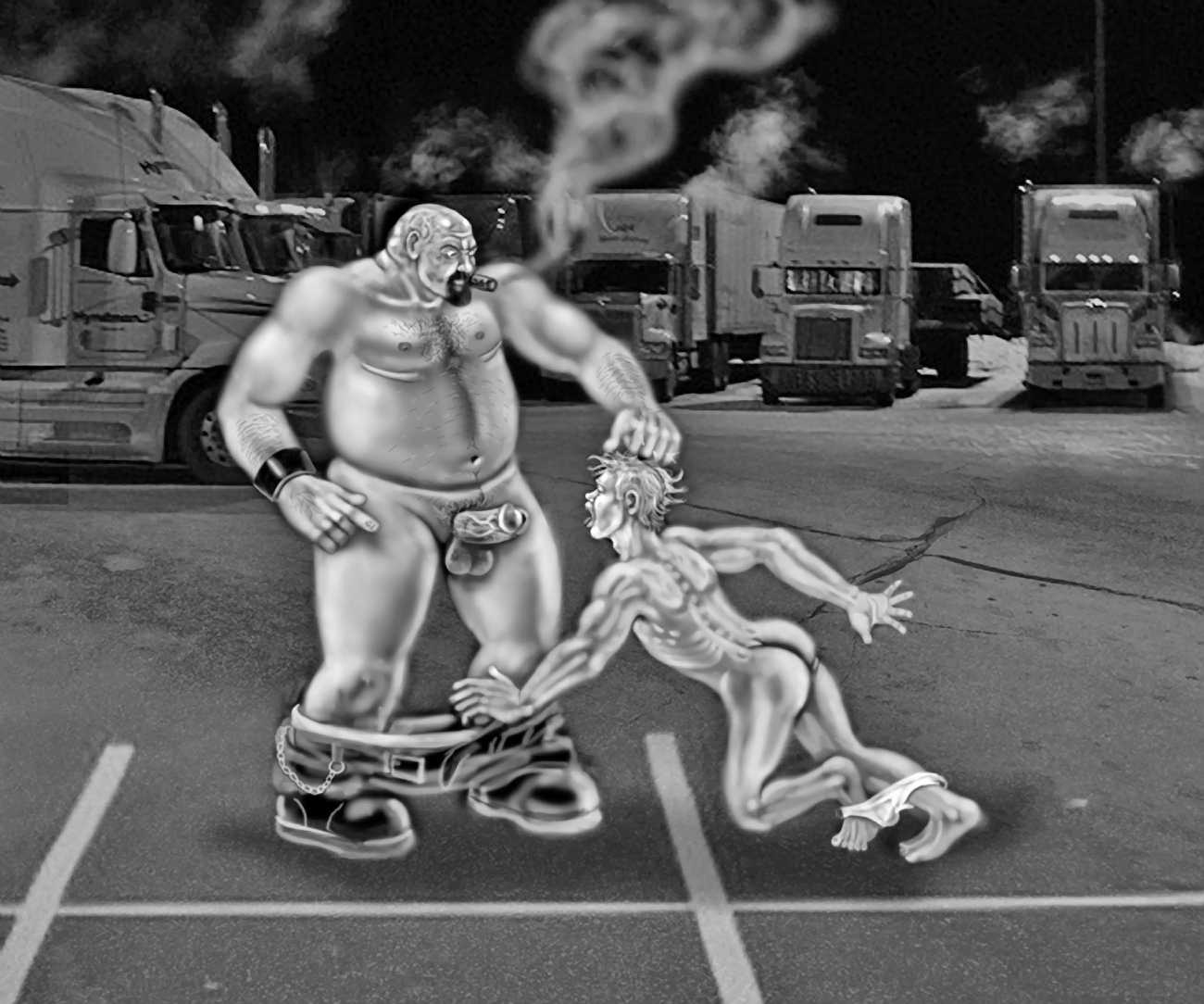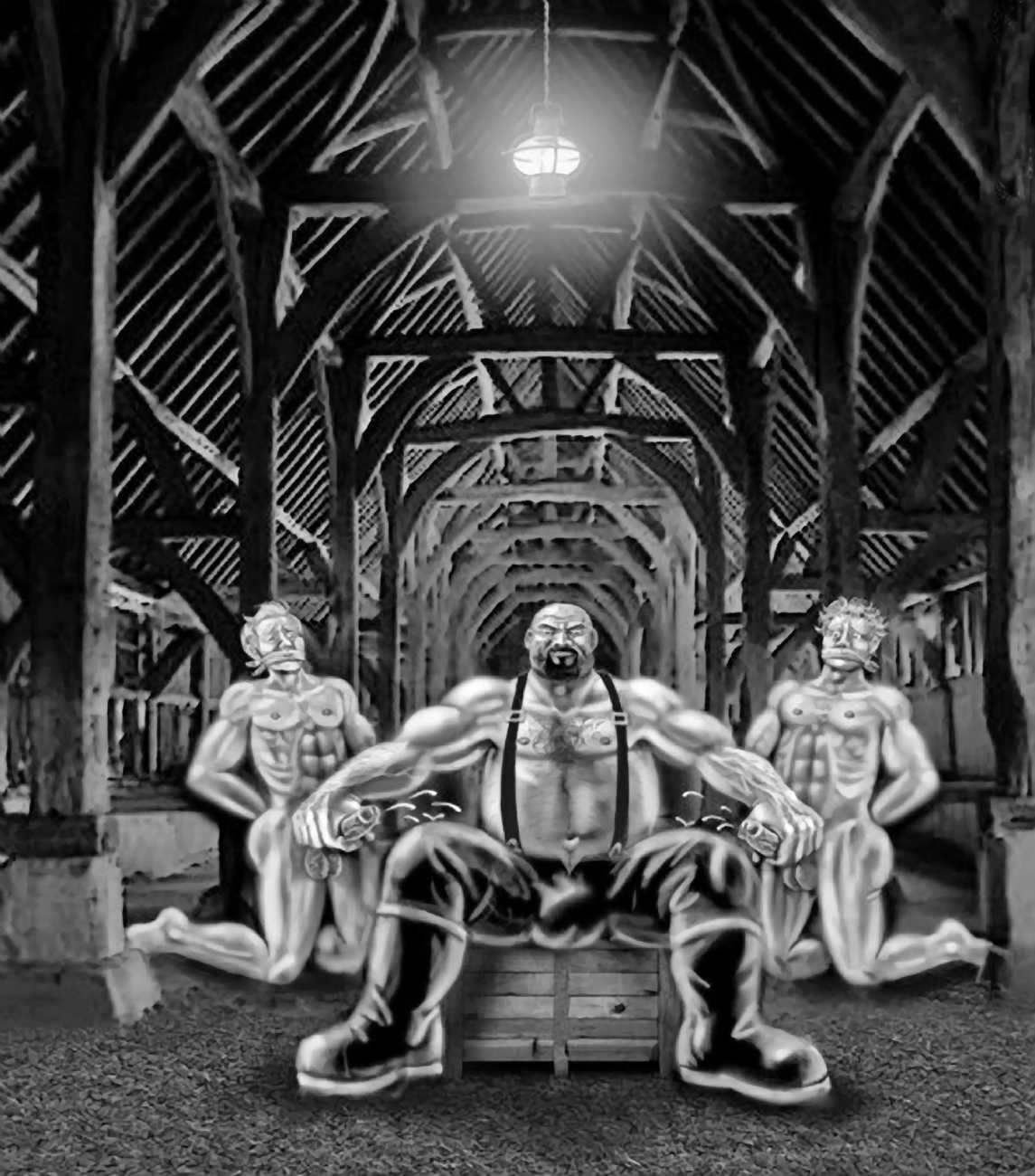Gods and Monsters started life on Tumblr in the late 2000s, as Lavey experimented with Photoshop, combining his trademark dark monochrome encounters between ‘bears’ and ‘cubs’ with found background images of warehouses, abandoned factories and truckstops. Being something of a bear himself – heavy-set and projecting an idealised image of rugged masculinity – his images convey something of autobiography and of fantasy, both for himself and for his audience.