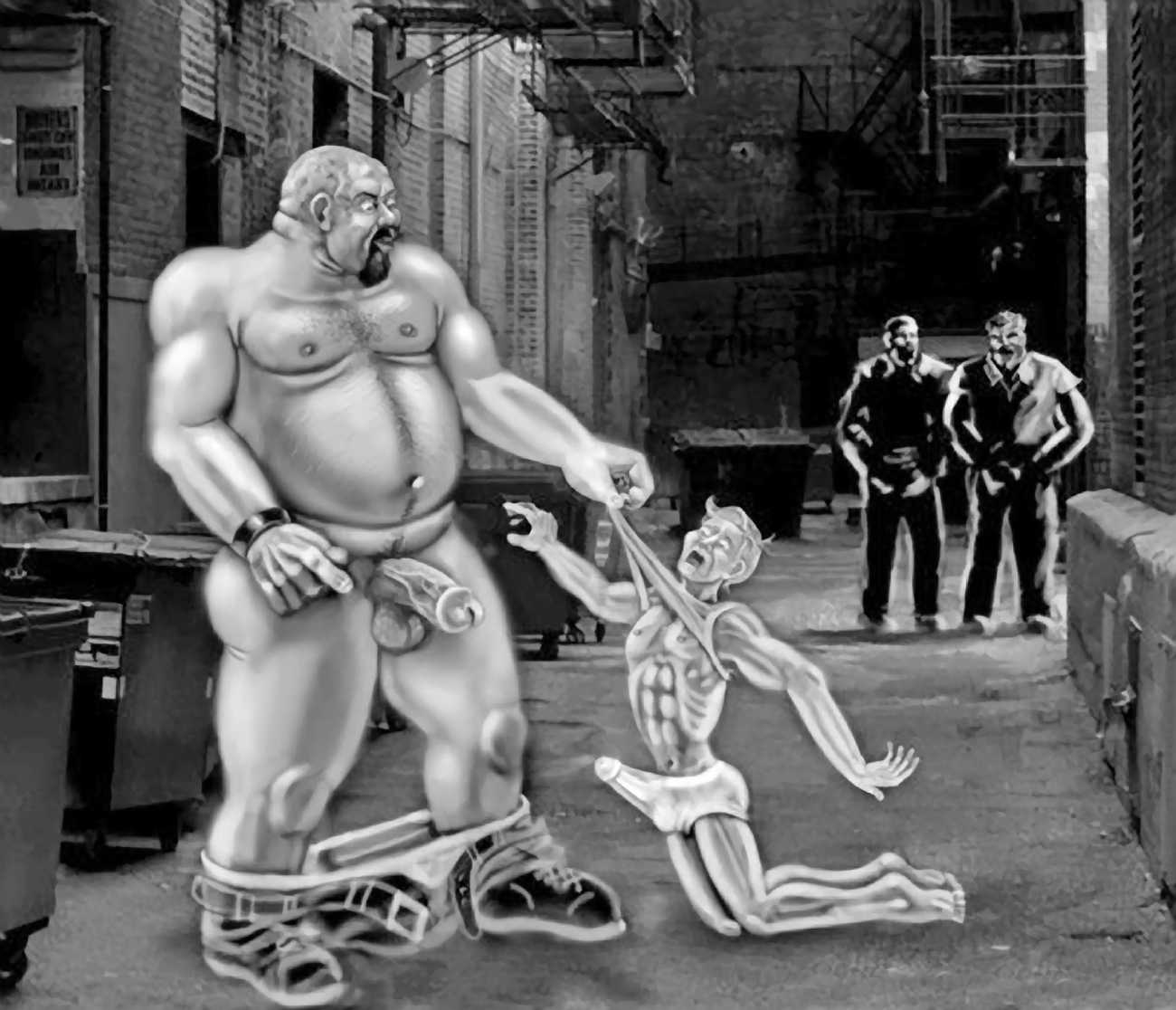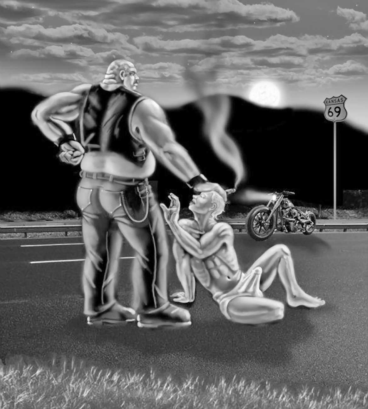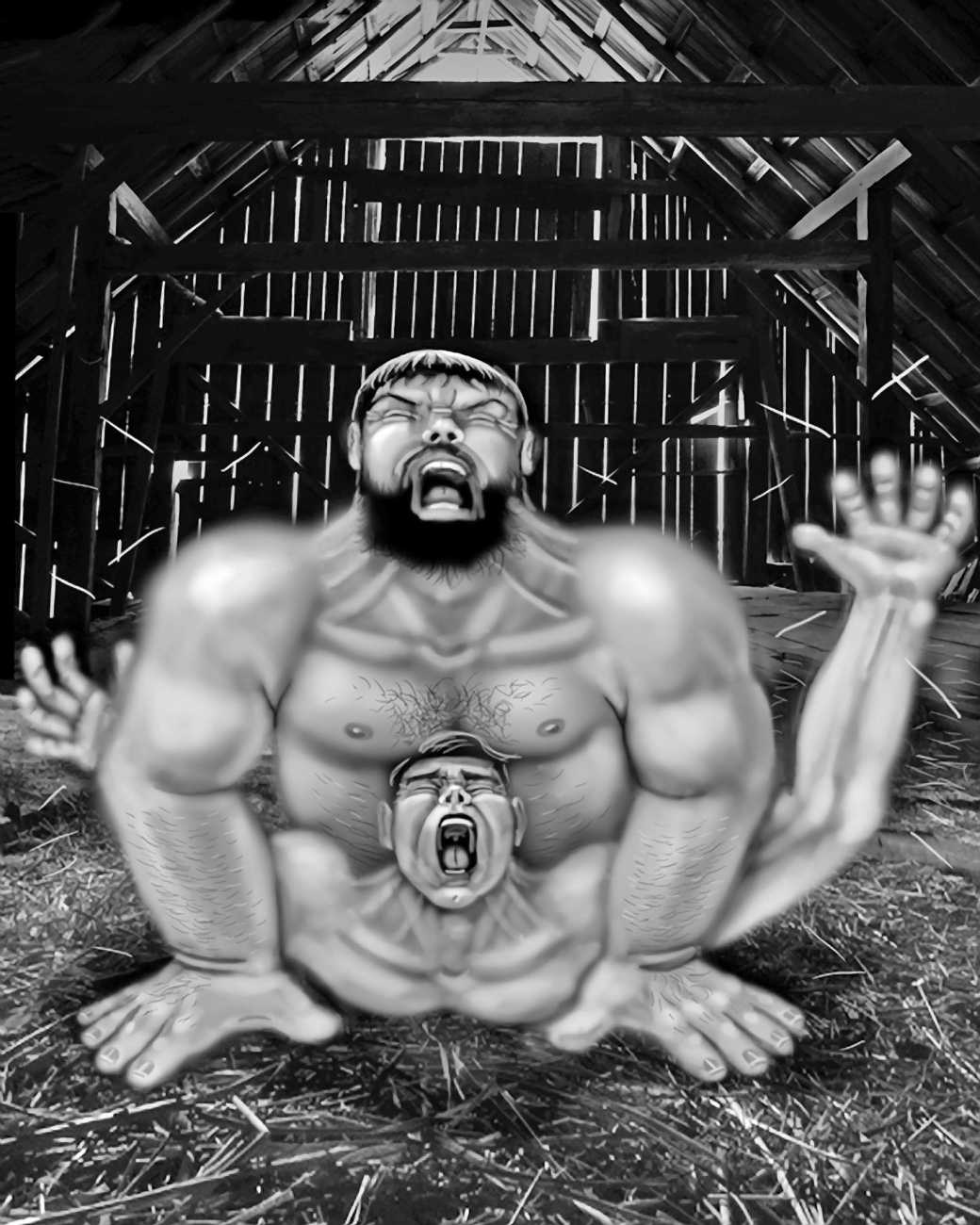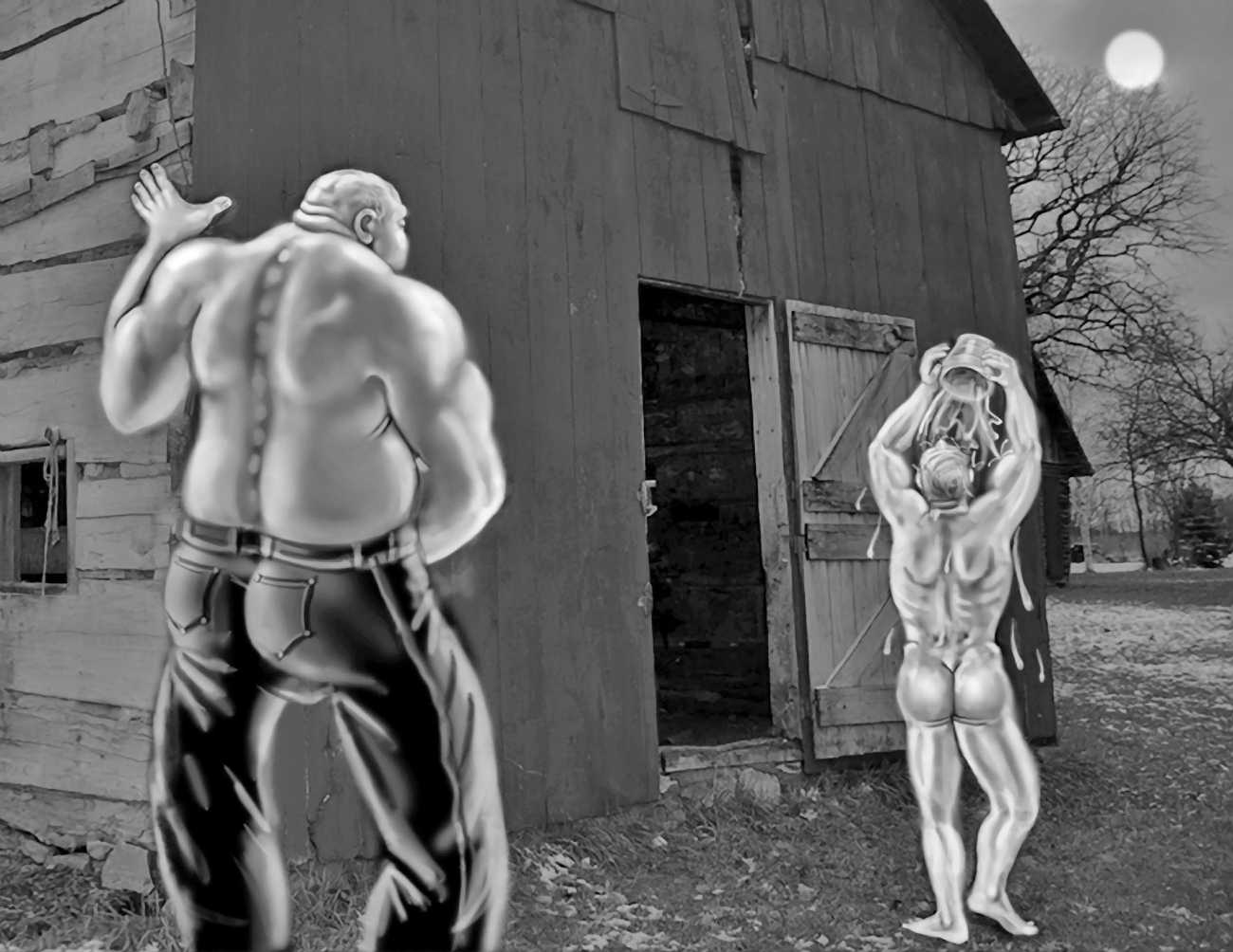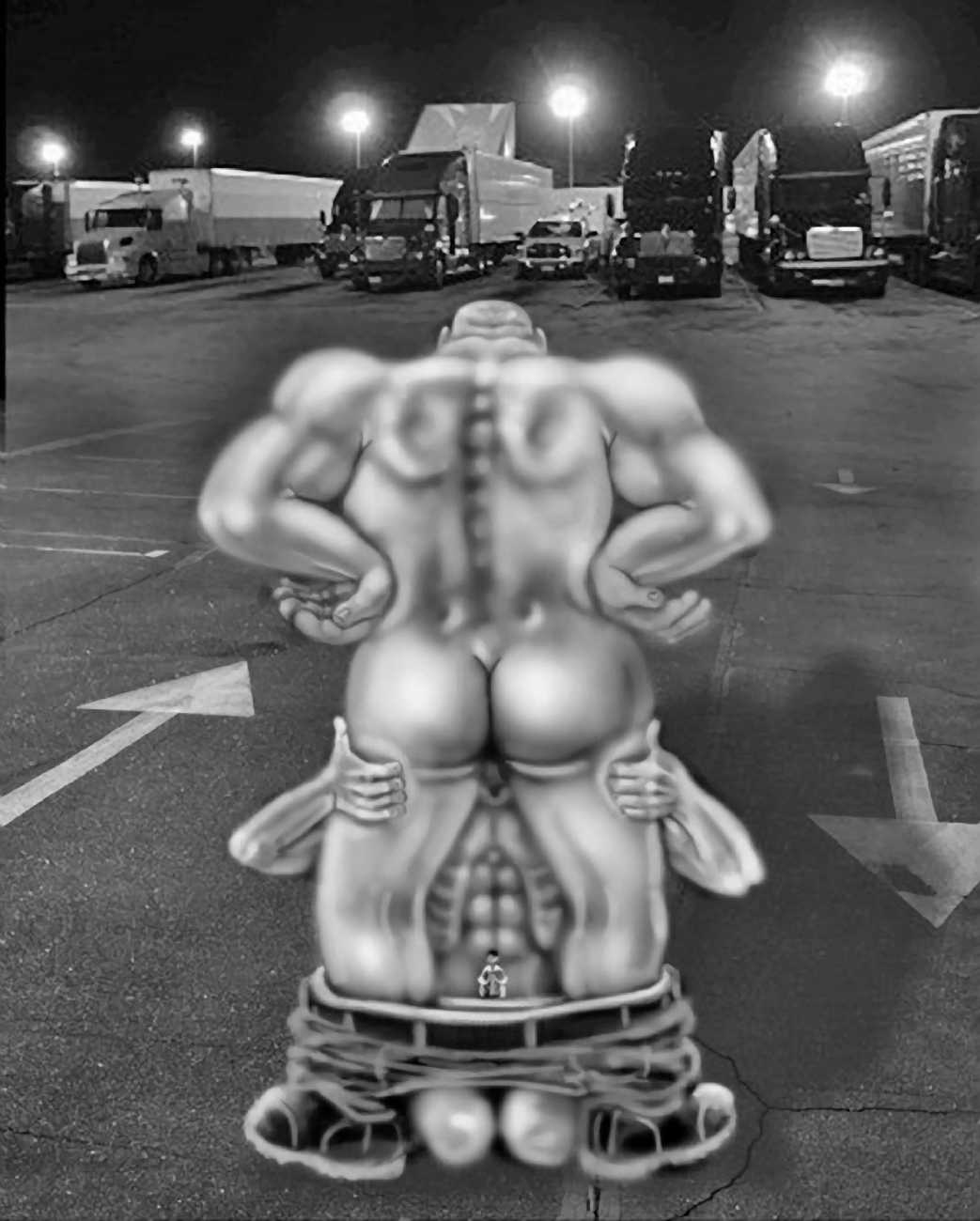 Gods and Monsters started life on Tumblr in the late 2000s, as Lavey experimented with Photoshop, combining his trademark dark monochrome encounters between ‘bears’ and ‘cubs’ with found background images of warehouses, abandoned factories and truckstops. Being something of a bear himself – heavy-set and projecting an idealised image of rugged masculinity – his images convey something of autobiography and of fantasy, both for himself and for his audience.