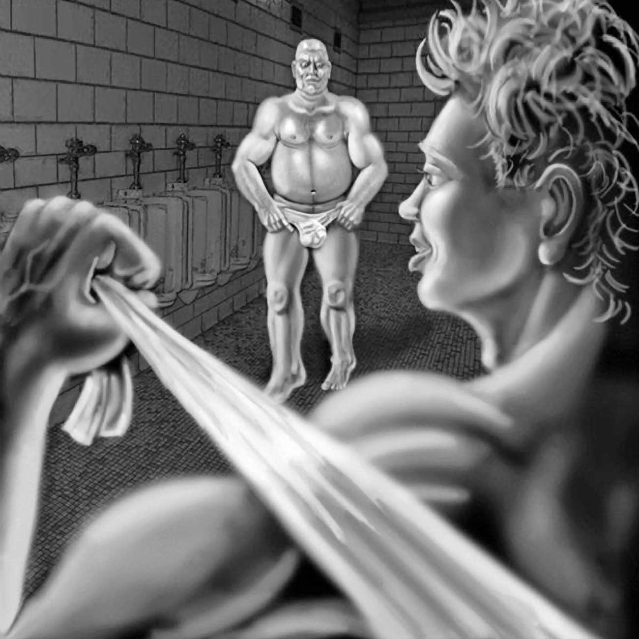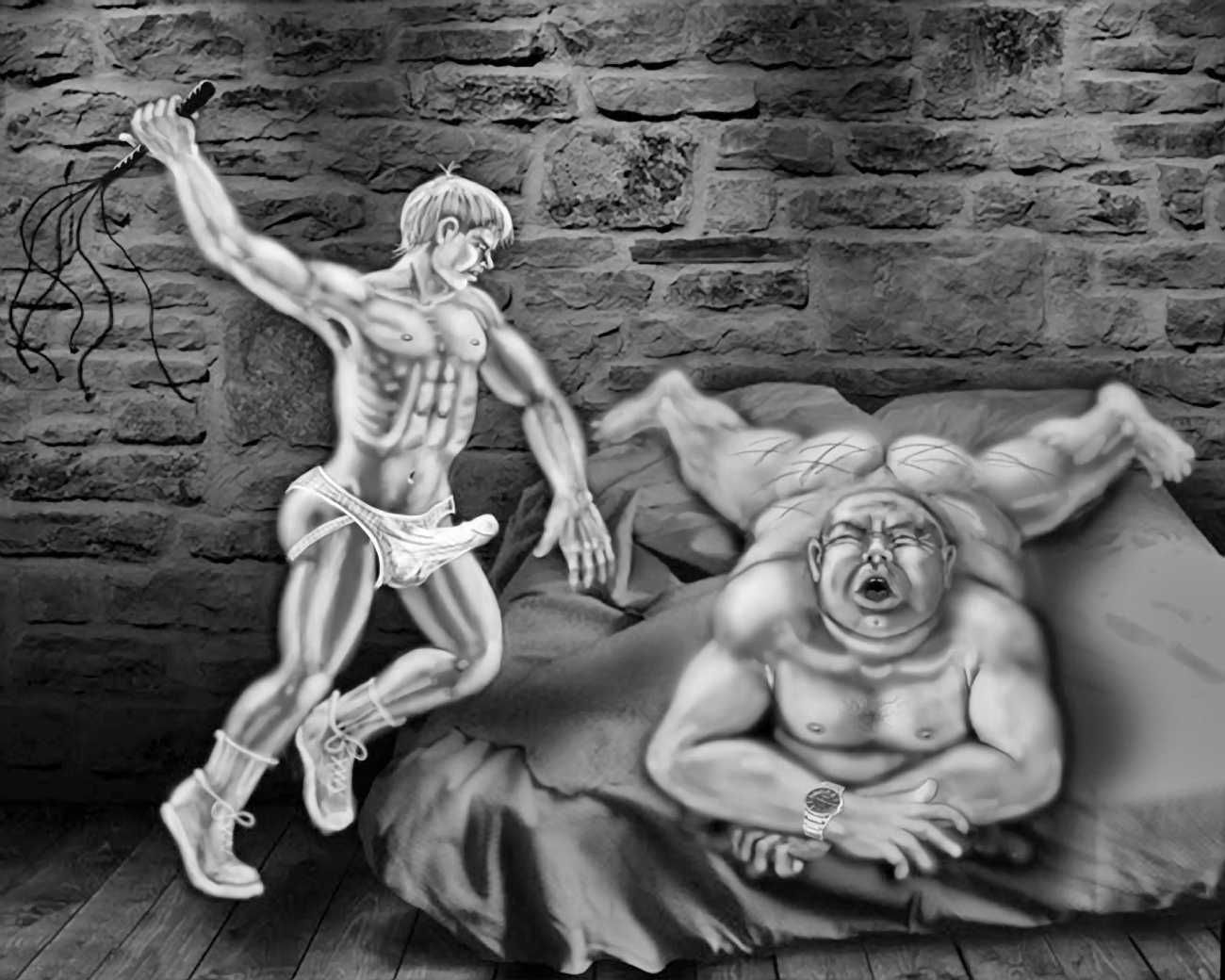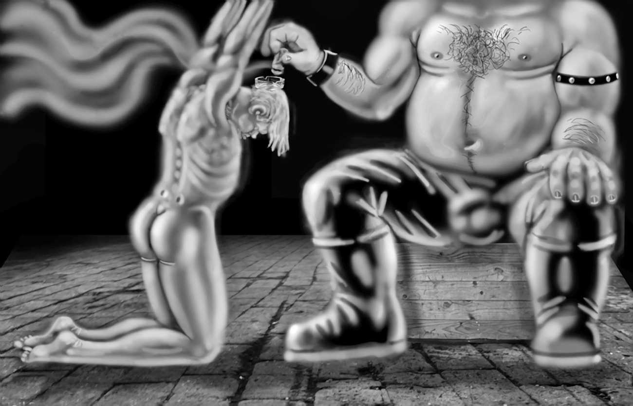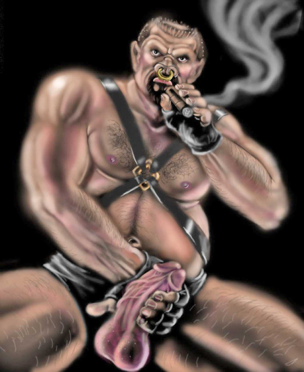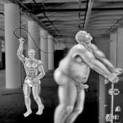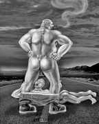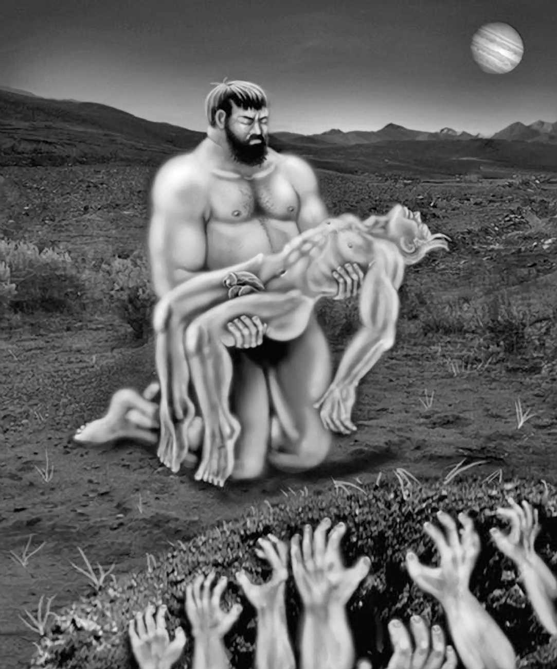 Gods and Monsters started life on Tumblr in the late 2000s, as Lavey experimented with Photoshop, combining his trademark dark monochrome encounters between ‘bears’ and ‘cubs’ with found background images of warehouses, abandoned factories and truckstops. Being something of a bear himself – heavy-set and projecting an idealised image of rugged masculinity – his images convey something of autobiography and of fantasy, both for himself and for his audience.