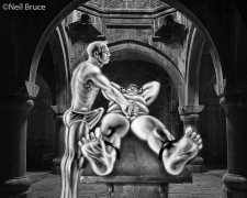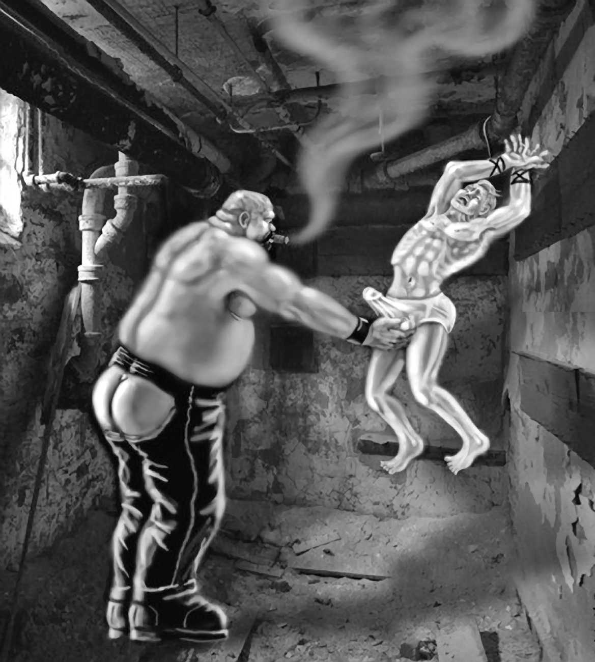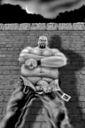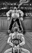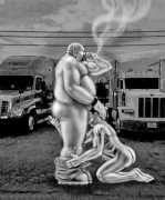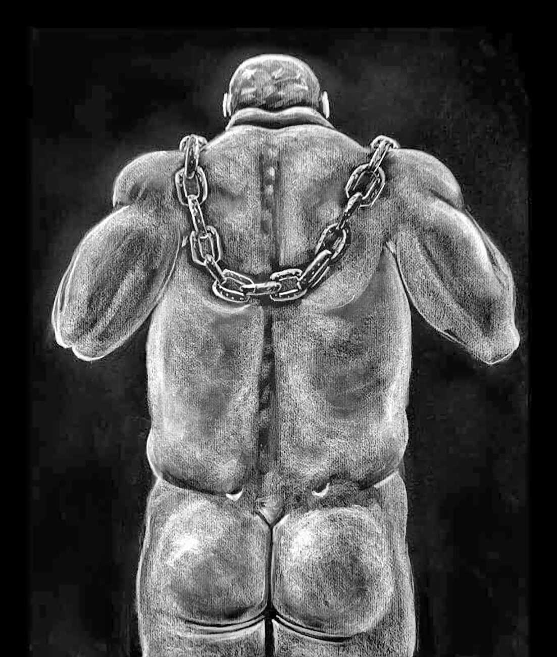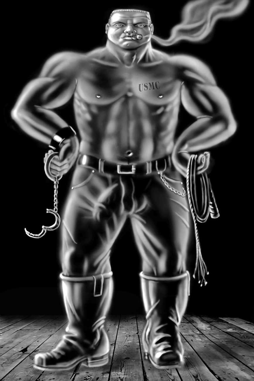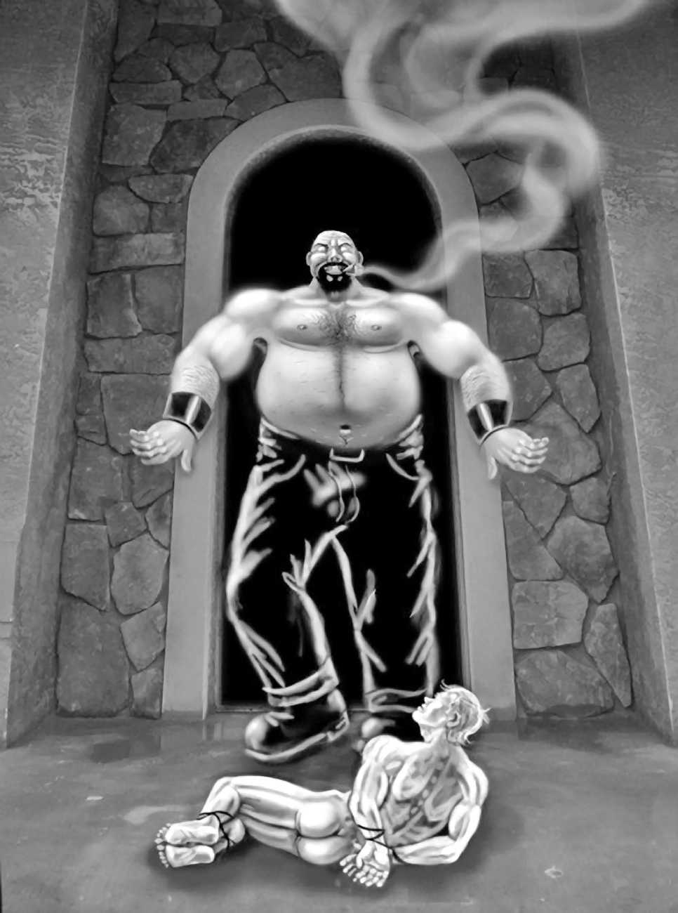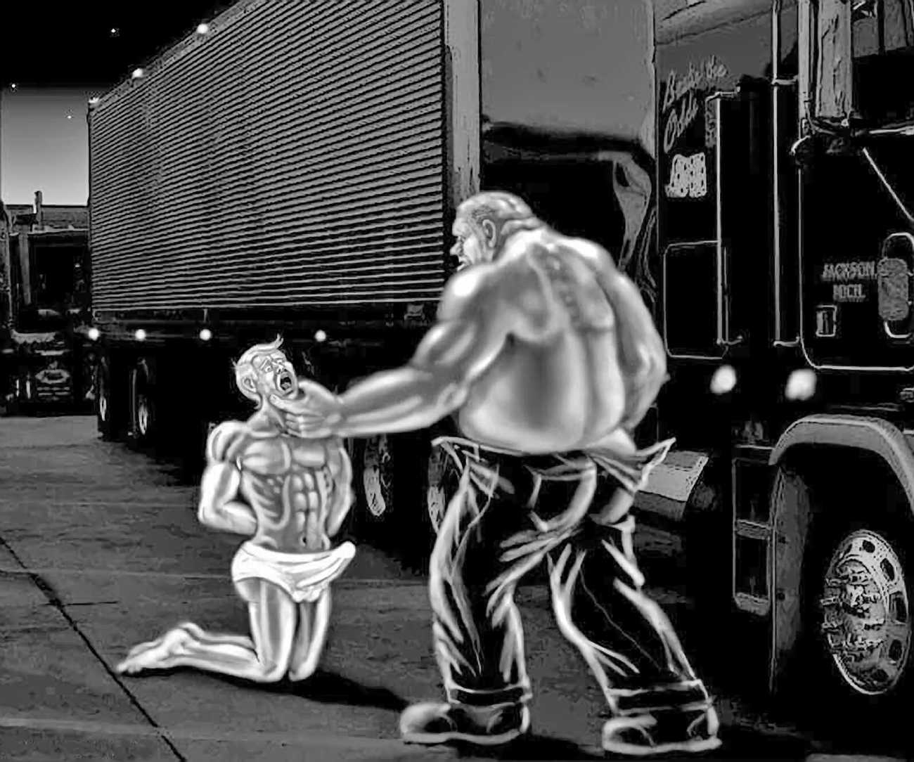 Gods and Monsters started life on Tumblr in the late 2000s, as Lavey experimented with Photoshop, combining his trademark dark monochrome encounters between ‘bears’ and ‘cubs’ with found background images of warehouses, abandoned factories and truckstops. Being something of a bear himself – heavy-set and projecting an idealised image of rugged masculinity – his images convey something of autobiography and of fantasy, both for himself and for his audience.