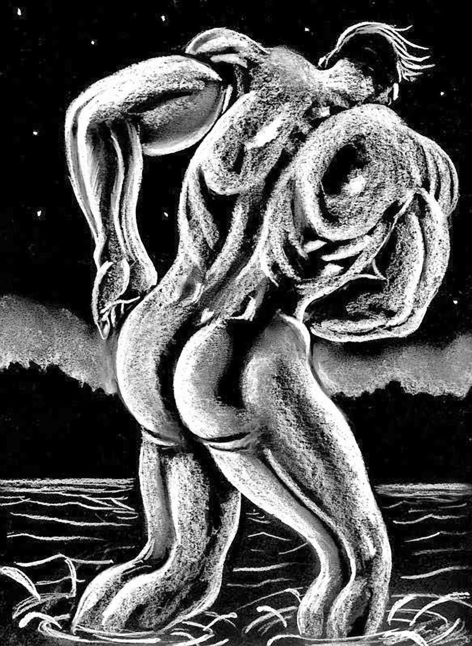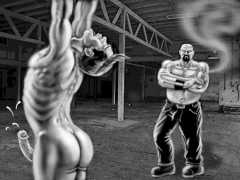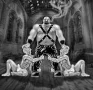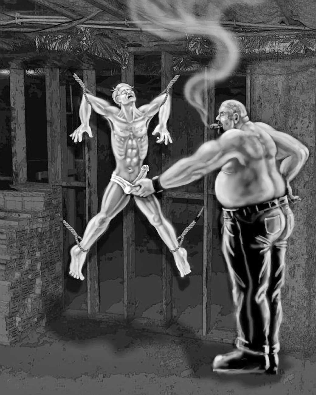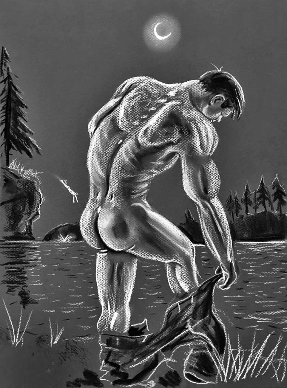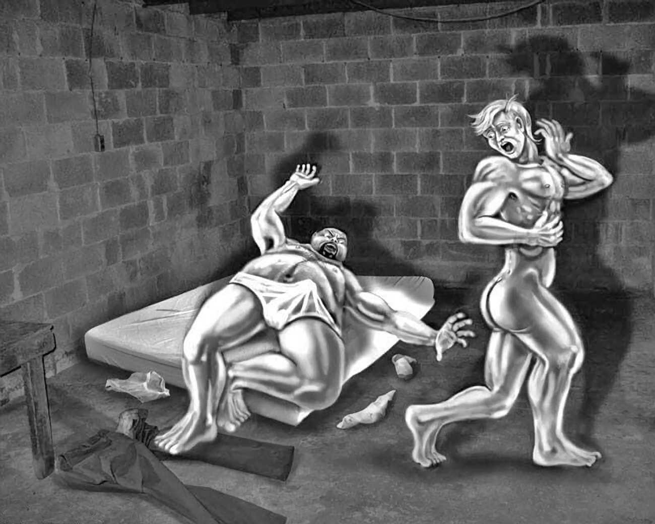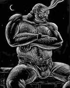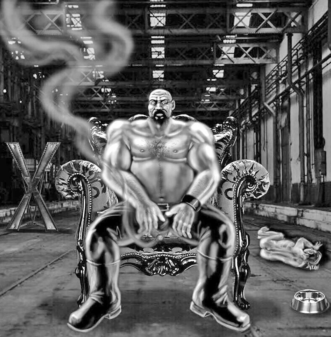 Gods and Monsters started life on Tumblr in the late 2000s, as Lavey experimented with Photoshop, combining his trademark dark monochrome encounters between ‘bears’ and ‘cubs’ with found background images of warehouses, abandoned factories and truckstops. Being something of a bear himself – heavy-set and projecting an idealised image of rugged masculinity – his images convey something of autobiography and of fantasy, both for himself and for his audience.