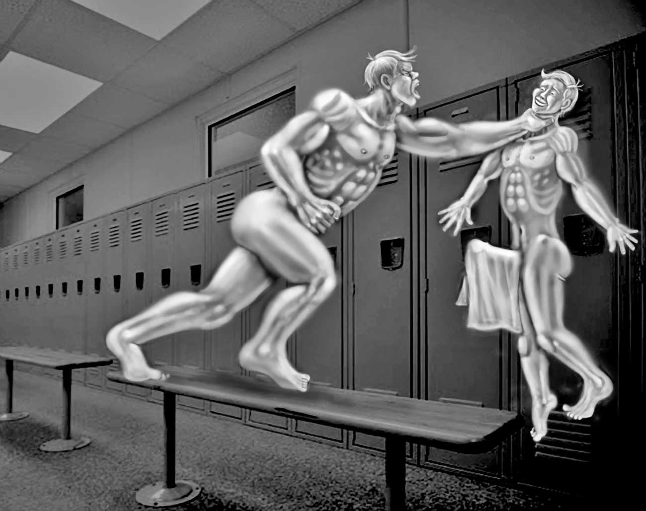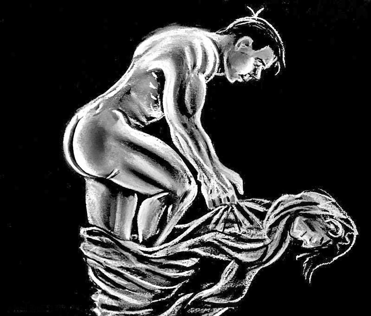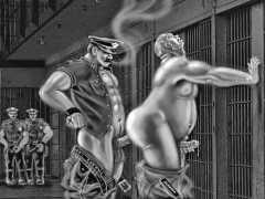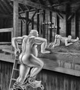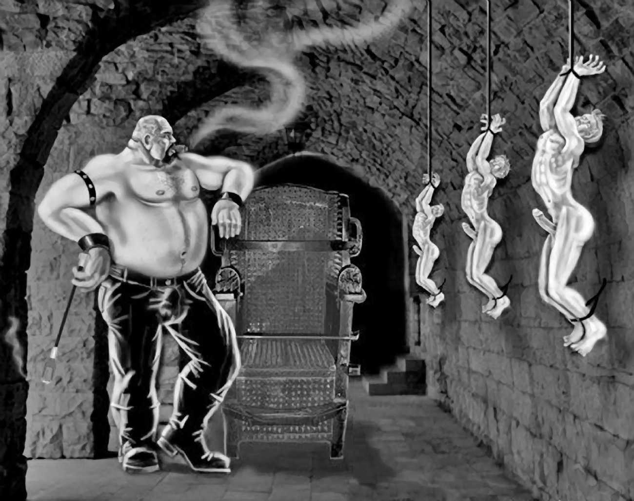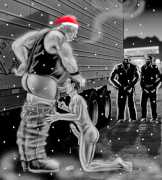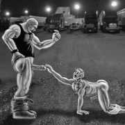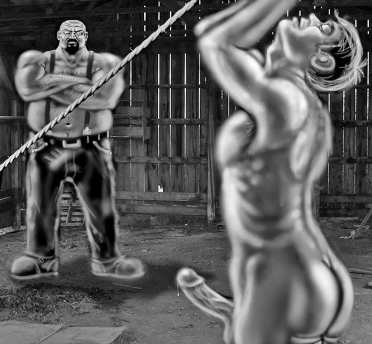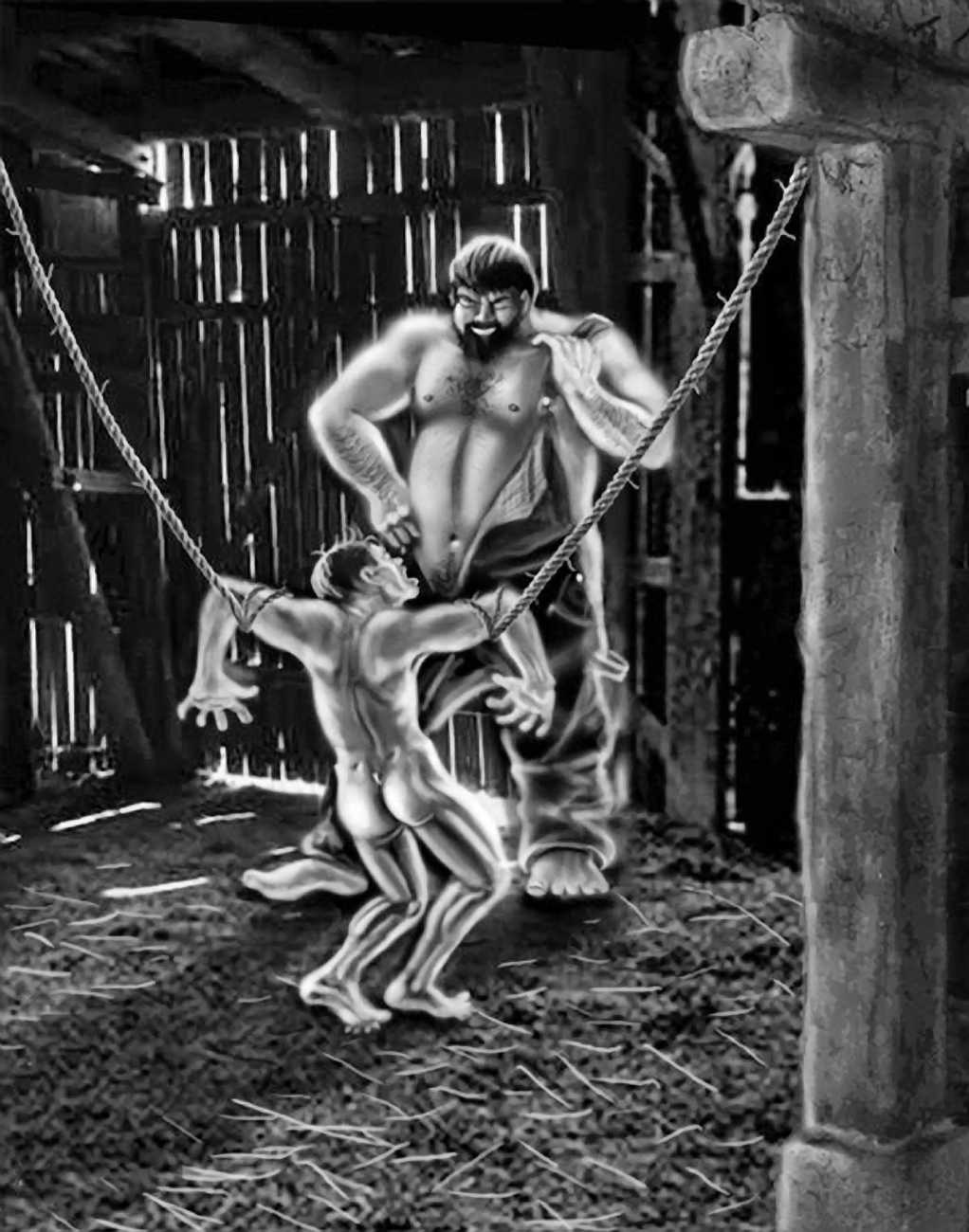 Gods and Monsters started life on Tumblr in the late 2000s, as Lavey experimented with Photoshop, combining his trademark dark monochrome encounters between ‘bears’ and ‘cubs’ with found background images of warehouses, abandoned factories and truckstops. Being something of a bear himself – heavy-set and projecting an idealised image of rugged masculinity – his images convey something of autobiography and of fantasy, both for himself and for his audience.