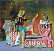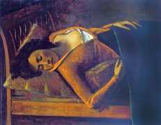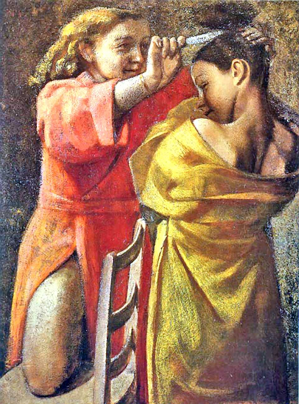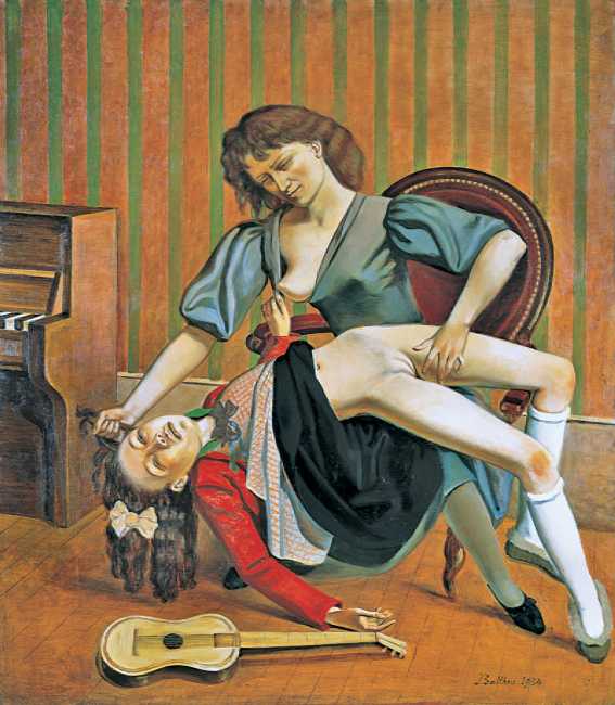 The child makes no attempt to struggle. Her body is arching and her posture evokes the scene of the lap of the Virgin Mary depicted in the Pieta. Her female teacher’s hands are positioned on the girl as for playing the guitar, one near her inner leg and another holding the young girl’s hair. Depicting as it does the body of a young girl, the painting is particularly controversial, as some see an appalling scene of sexual violence while others admire the beauty of the composition, with its depiction of youthful eroticism. There is no immediate suggestion of violence, they point out, the delicacy and position of the figures implying nothing beyond an innocent game.