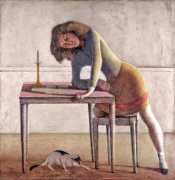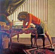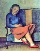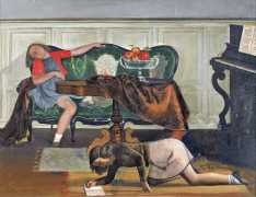 The first series of paintings he made was of a young girl named Thérèse Blanchard, a neighbour of Balthus in his atelier at the Cour de Rohan, near the place de L’Odeon in Paris. Balthus made ten paintings of Thérèse Blanchard, capturing the vulnerability and spirit of a girl on the threshold of adolescence. In Girl and Cat (Fille et chat) Thérèse appears self-absorbed, aloof or dreaming, with the cat as her sole companion and playmate. The Thérèse paintings remain some of his most widely recognised.