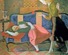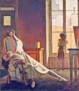 The Guitar Lesson (La leçon de guitar) is among the most notorious yet least discussed by Balthus’s contemporary critics. No music is being played in the scene depicted, as the tutorial has turned instead into what appears to be a sexual initiation rite. The composition is considered by some critics as being based on a Pieta, probably the Louvre’s mid-fifteenth-century Pieta of Villeneuve-les-Avignon, to judge from the near identical height and comparable sizes of the figures. In The Guitar Lesson, Balthus depicts a female music teacher holding a young girl across her thighs in lieu of the toy-like musical instrument abandoned on the floor.