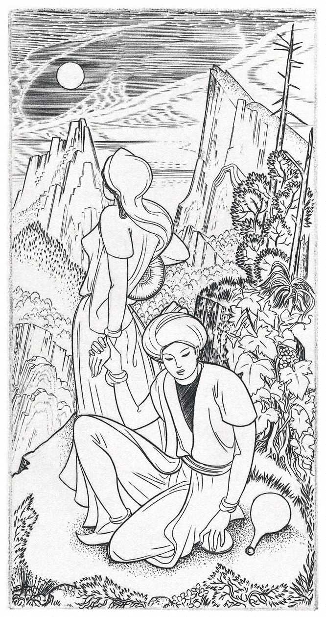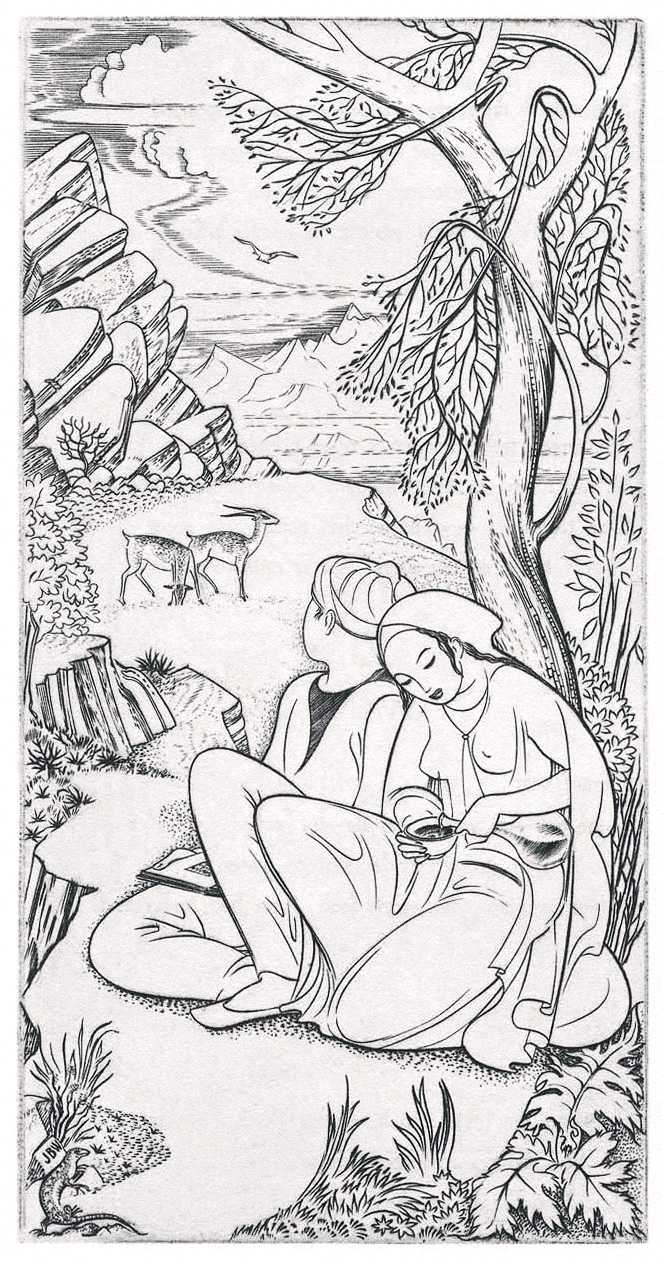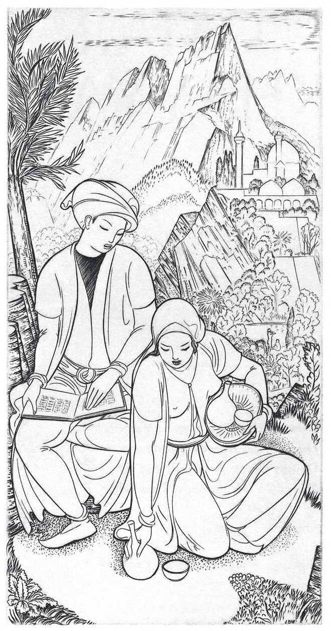 The 1938 Golden Cockerel edition of Edward FitzGerald’s famous translation of the eleventh-century Persian poet’s love songs contained eight engravings by John Buckland Wright, but he also produced five further plates to be included in a ‘special’ edition. A later 1944 Dutch edition contained the eleven engravings shown here.