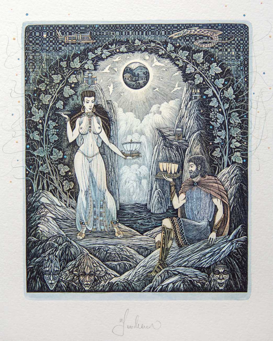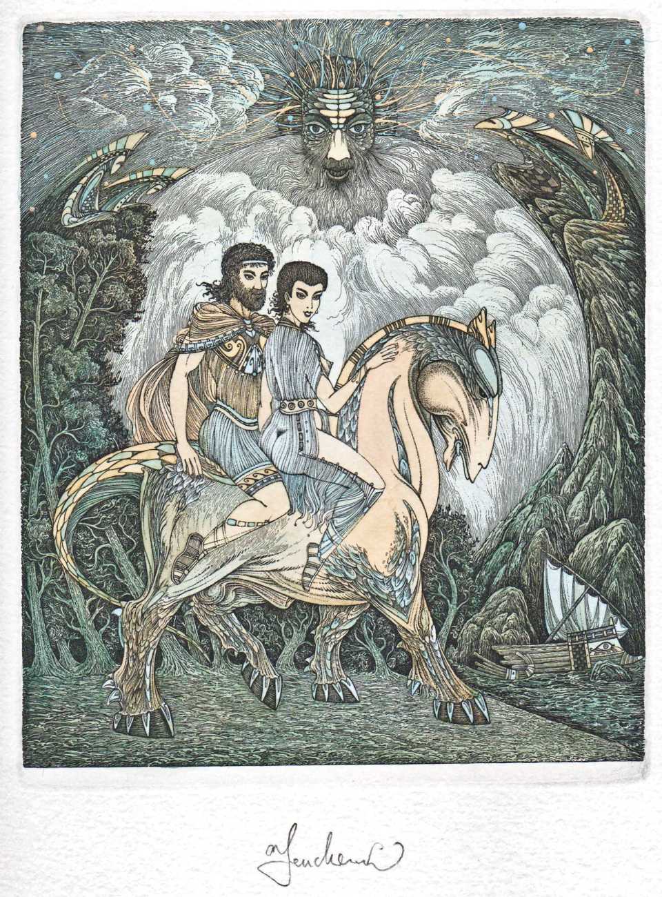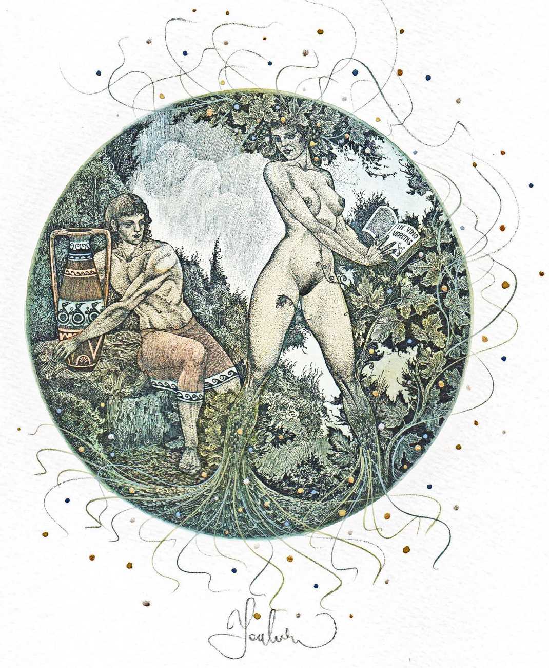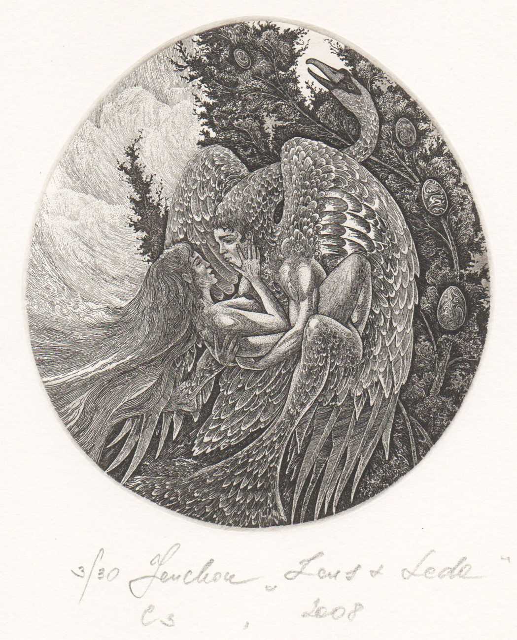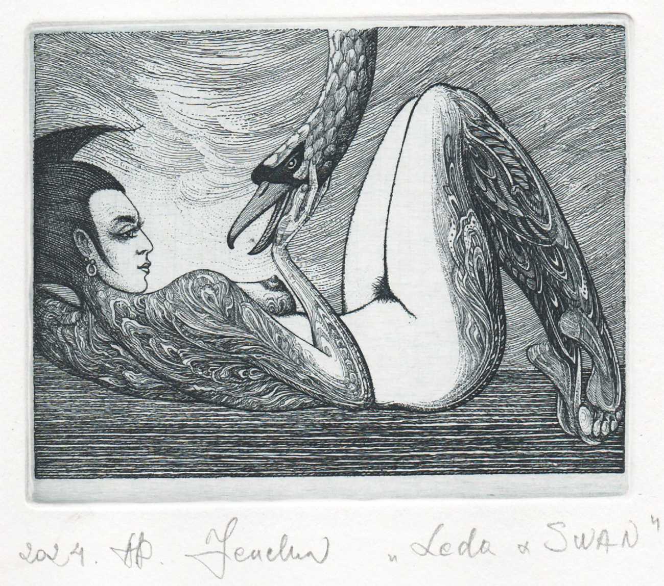 Vasyl Fenchak is widely considered to be one of the best modern engravers in a tradition for which his home country, Ukraine, is notably prominent. His detailed and carefully composed prints draw on a wide range of classical and ancient stories, combining powerful symbolism with rich background textures. Subjects with an erotic dimension – Leda and the Swan, Ariadne, Calypso, The Judgement of Paris, Susanna and the Elders – are among his favourites.