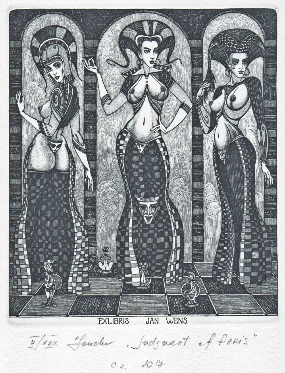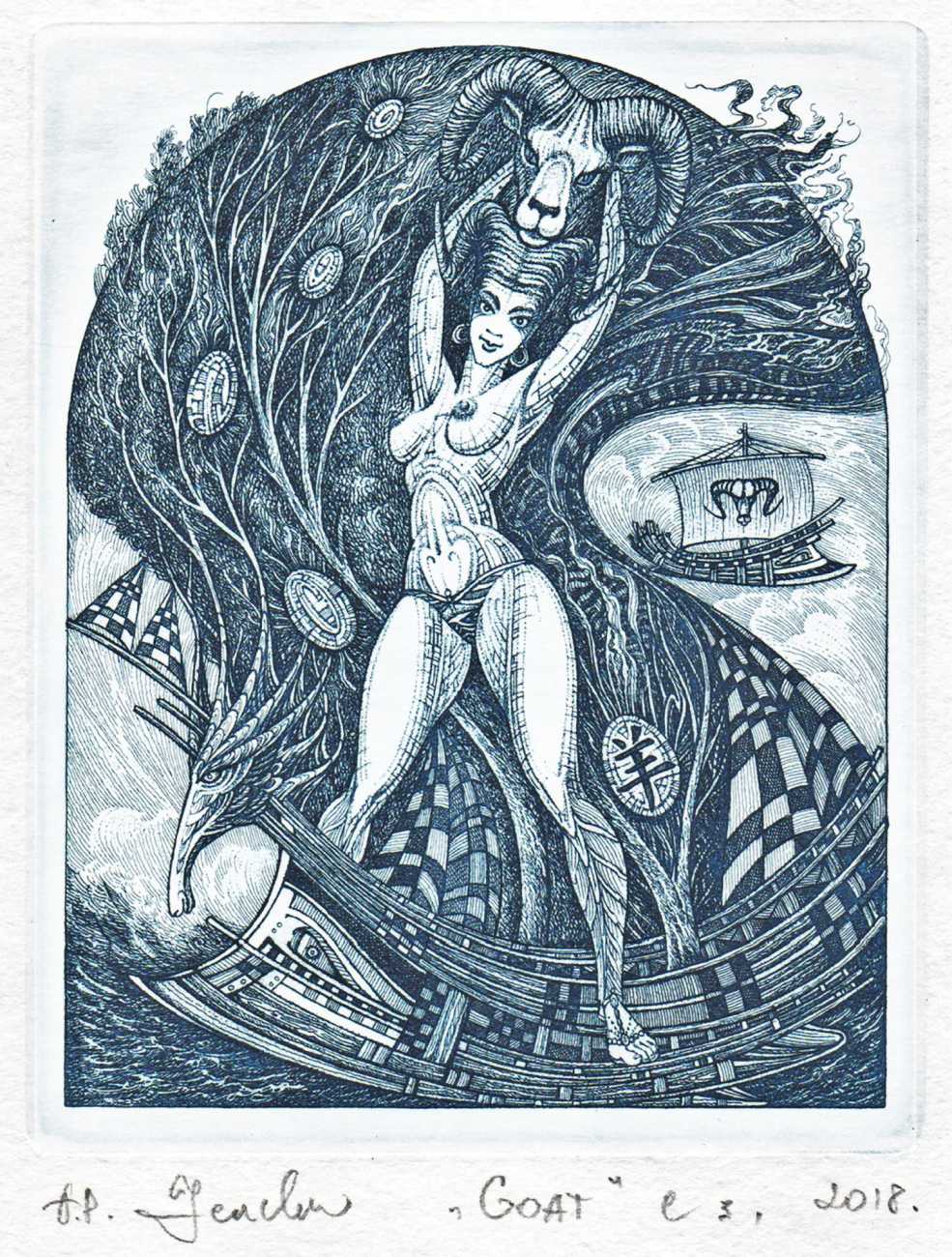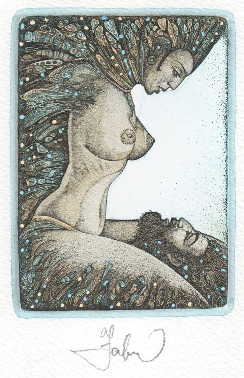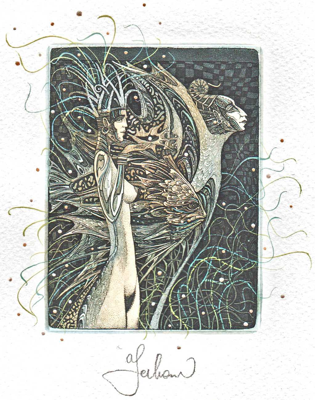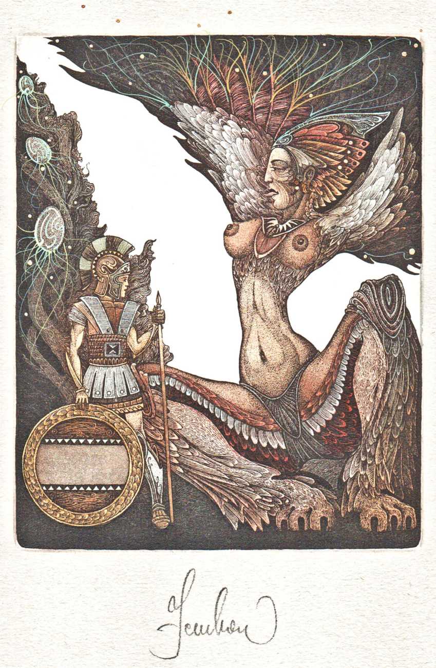 Vasyl Fenchak is widely considered to be one of the best modern engravers in a tradition for which his home country, Ukraine, is notably prominent. His detailed and carefully composed prints draw on a wide range of classical and ancient stories, combining powerful symbolism with rich background textures. Subjects with an erotic dimension – Leda and the Swan, Ariadne, Calypso, The Judgement of Paris, Susanna and the Elders – are among his favourites.