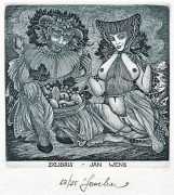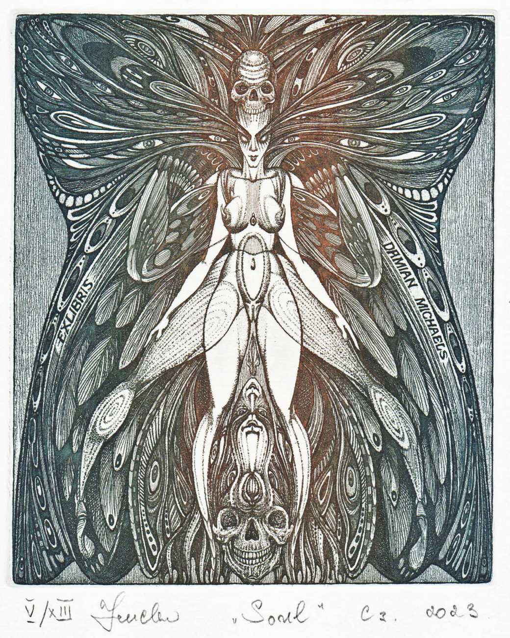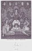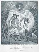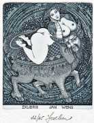 Many of Fenchak’s commissions are for ex libris or bookplates. The first known ex libris – a Latin phrase meaning ‘from the library of’ – are woodcuts from the fifteenth century, displaying the owner’s name and coat of arms. Through the centuries ex libris designers came up with ever more artful and imaginative designs for their clients’ libraries, inspiring a mania for collecting bookplates which lasted from the final quarter of the nineteenth century until the 1930s.