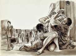Maybe, or maybe the distance comes from the fact that I start from scratch every time I begin a new drawing. I think of what happened, I put myself in the characters’ shoes, and then I put them into place in the way I imagine the situation. I show the drama through the faces, the gestures, the behaviour, often exaggerating perspective or viewpoint for added drama.