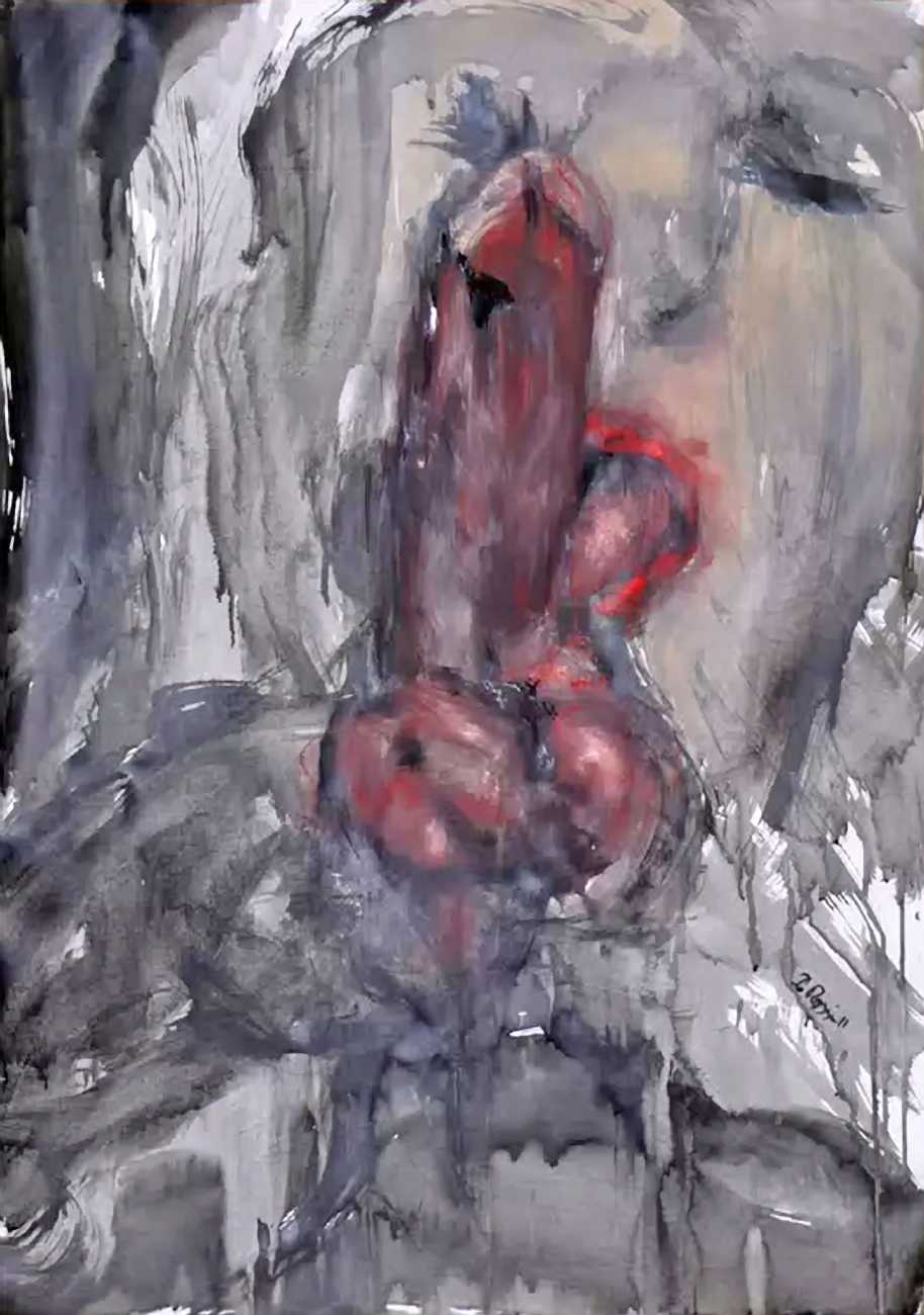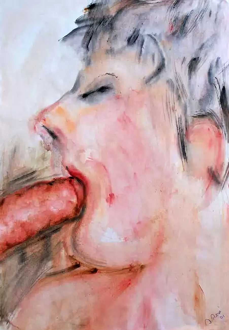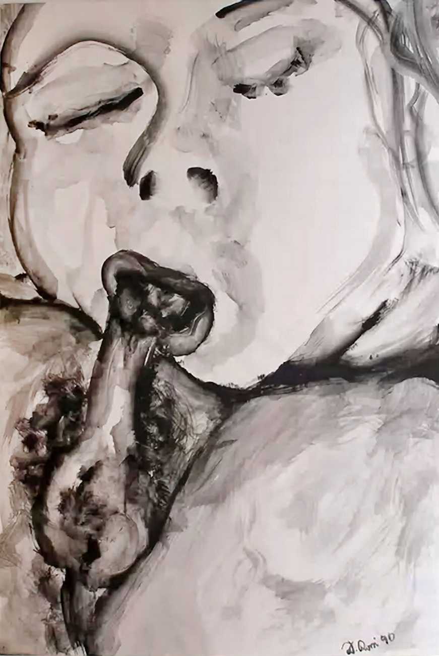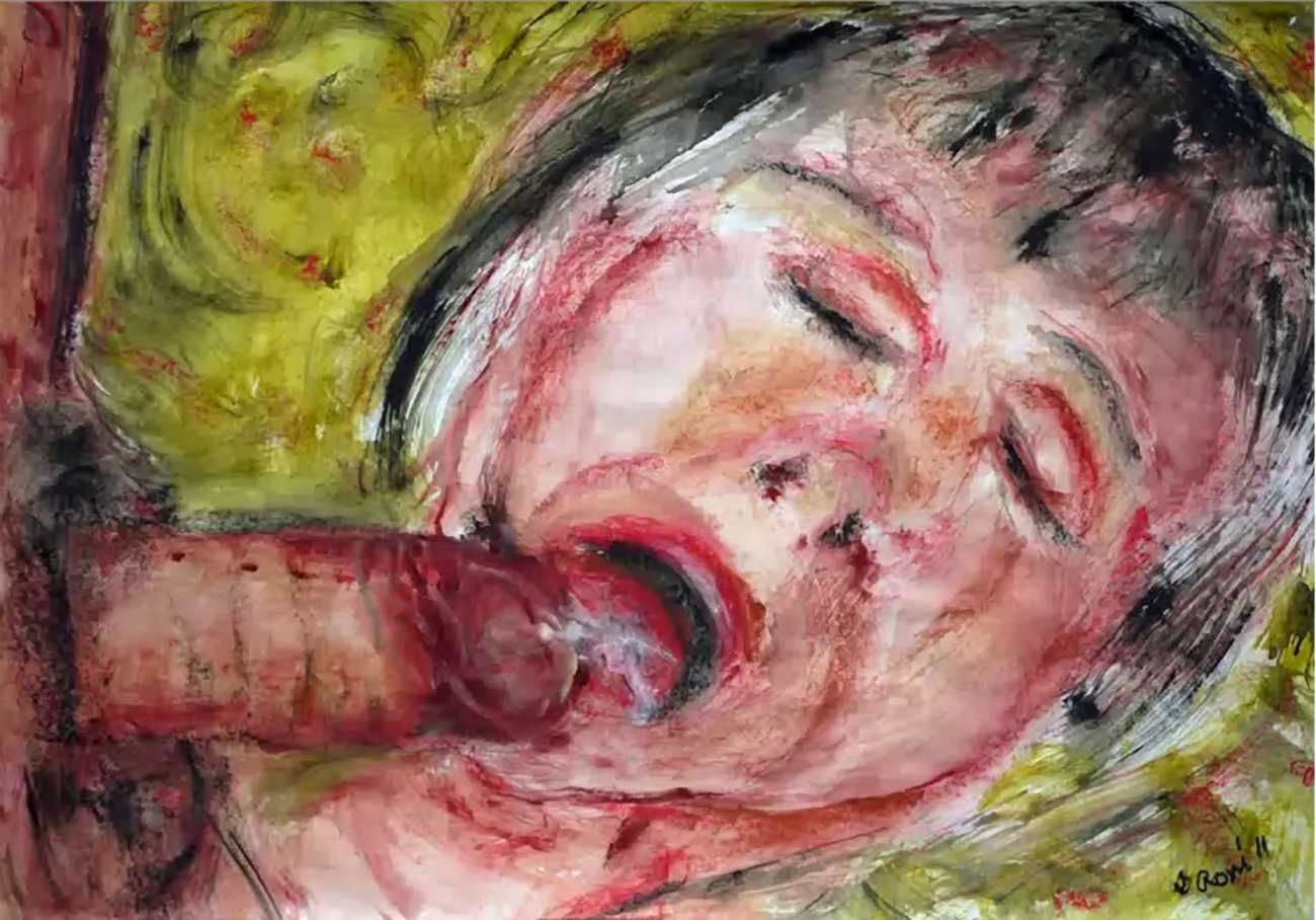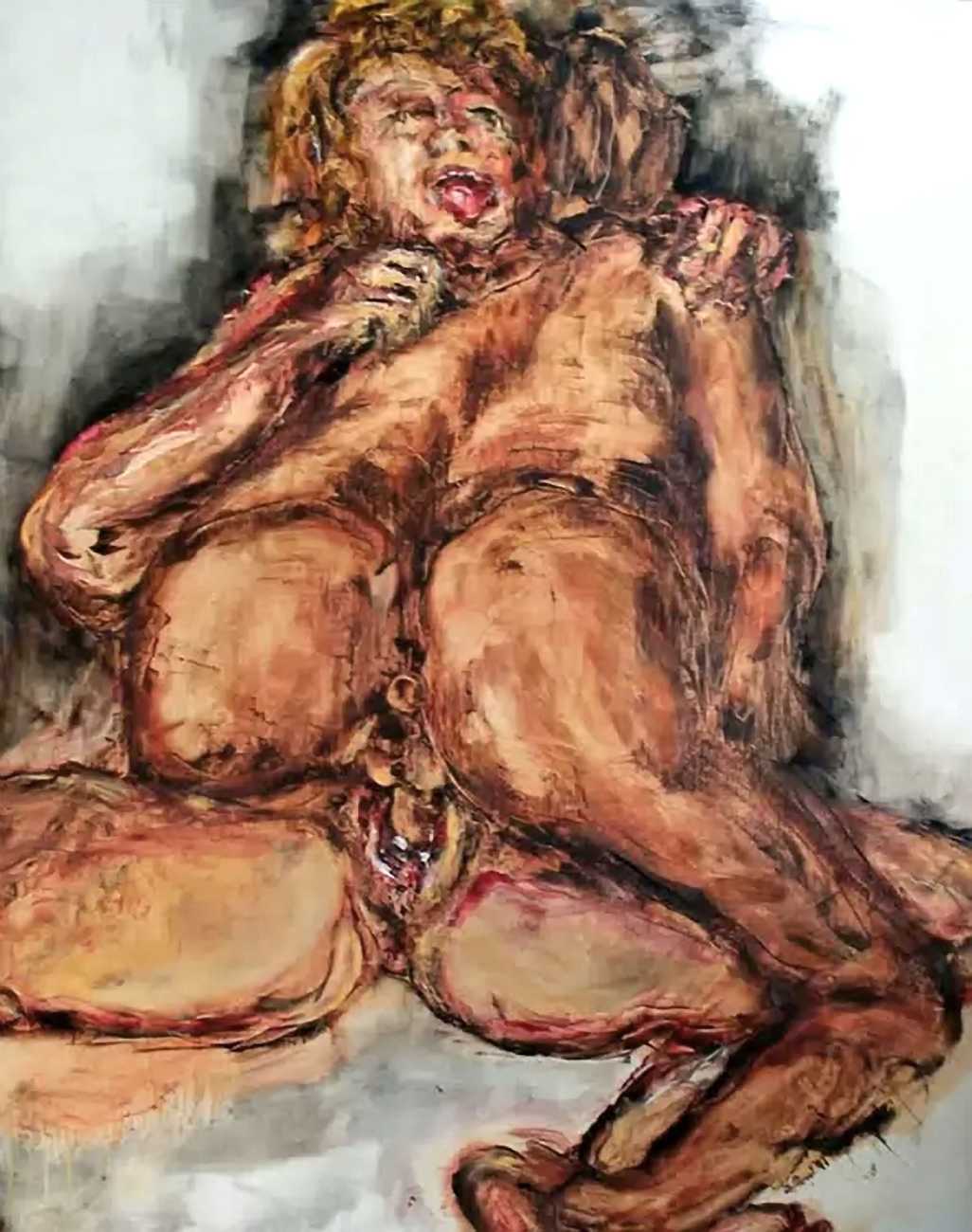 Possibly half of Rossi’s paintings are of naked human bodies, portrayed boldly, colourfully, and often displaying their sex for all to see. He explores the whole gamut of raw human experience, from warmth and pleasure to bondage and humiliation. Human sexuality for Rossi cannot be separated from our animal physicality; it has little to do with conventional beauty, but his very directness offers a certain quality of corporeal reality – tender, exposed, complex, chaotic – with which anyone who has experienced true sexual passion can identify.
