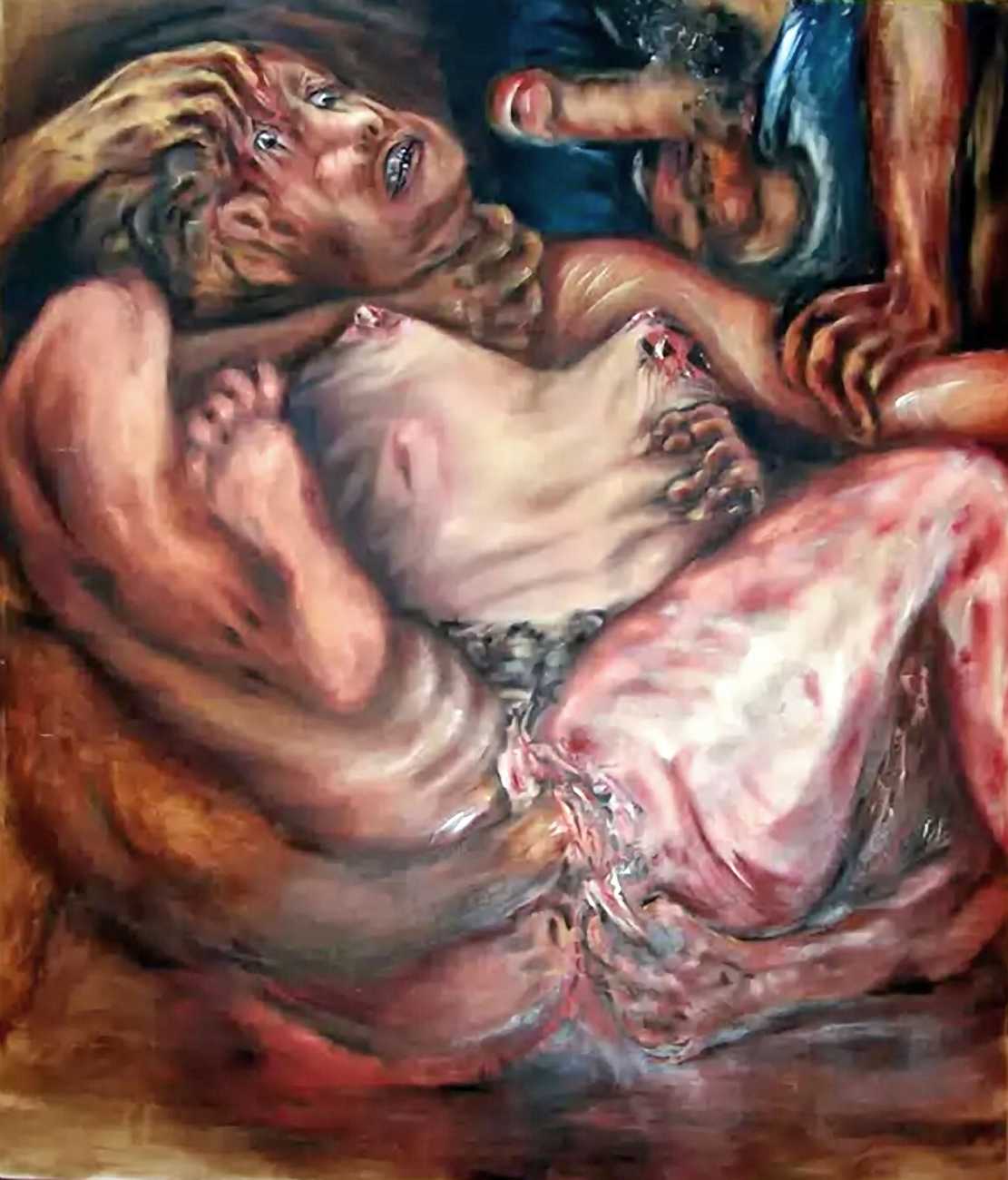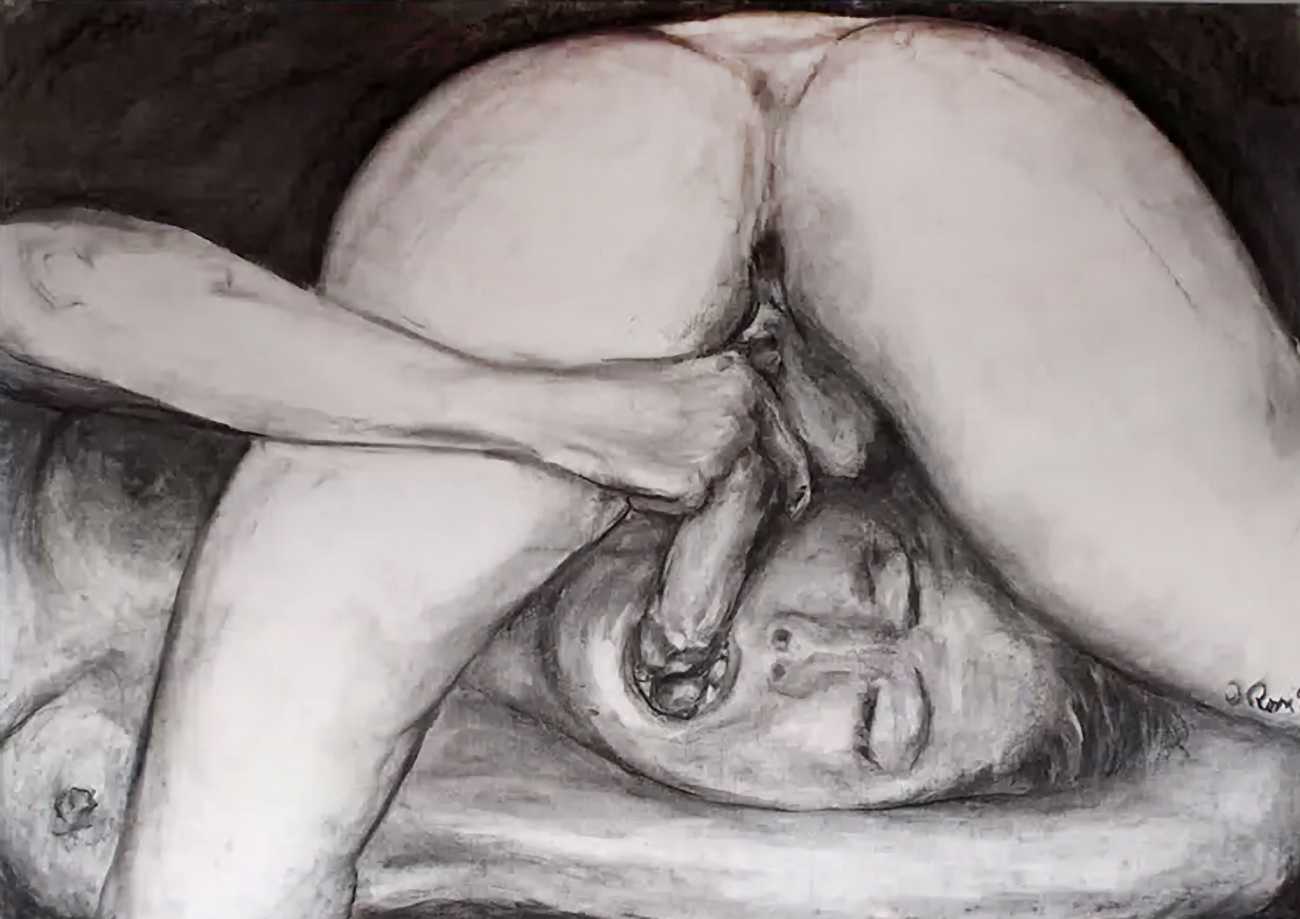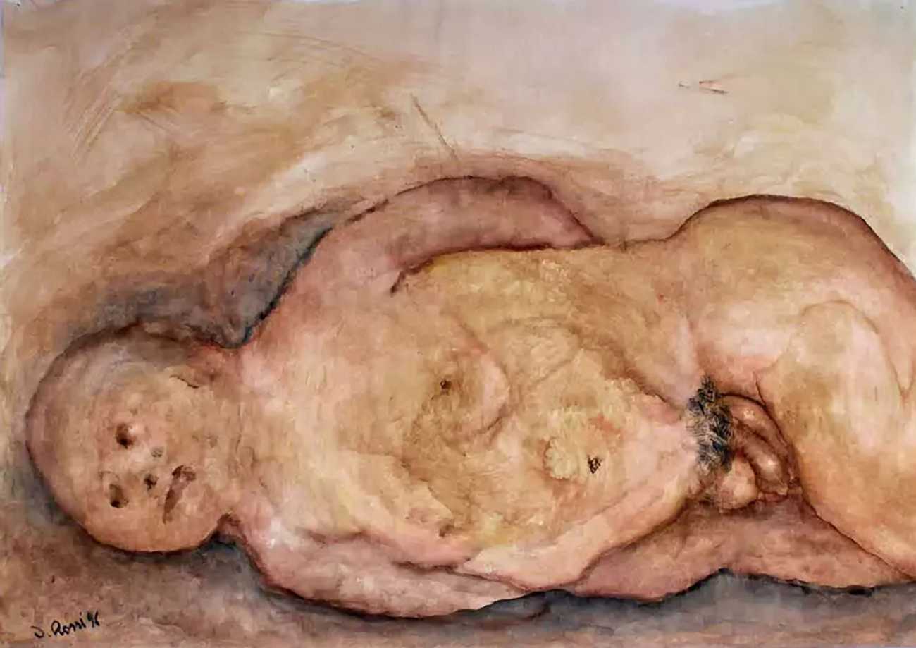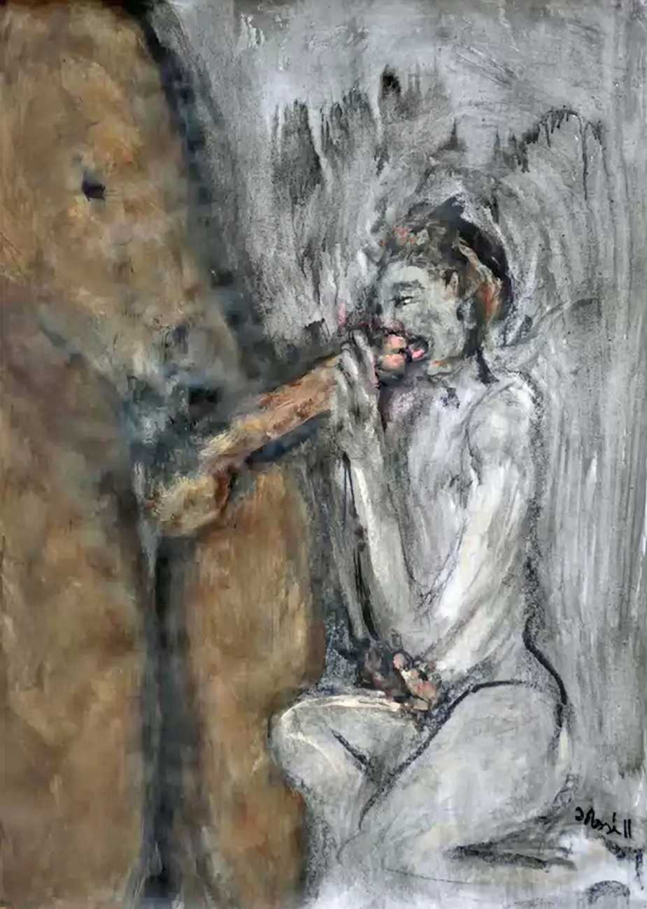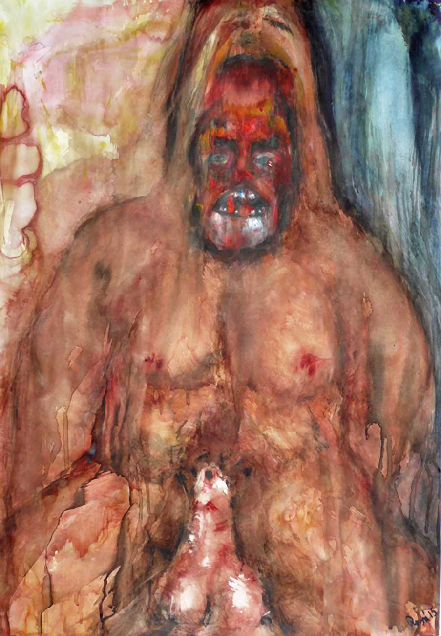 Possibly half of Rossi’s paintings are of naked human bodies, portrayed boldly, colourfully, and often displaying their sex for all to see. He explores the whole gamut of raw human experience, from warmth and pleasure to bondage and humiliation. Human sexuality for Rossi cannot be separated from our animal physicality; it has little to do with conventional beauty, but his very directness offers a certain quality of corporeal reality – tender, exposed, complex, chaotic – with which anyone who has experienced true sexual passion can identify.