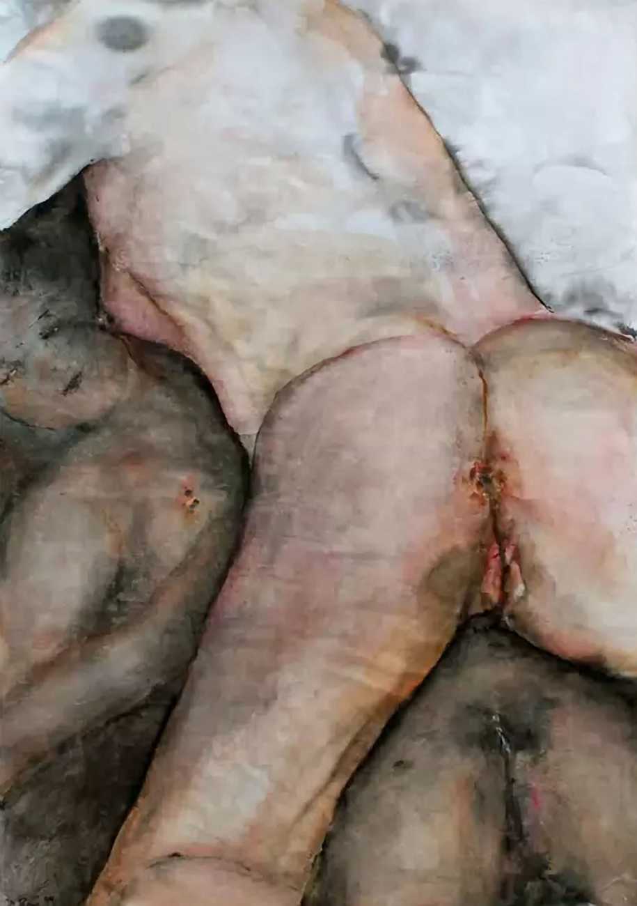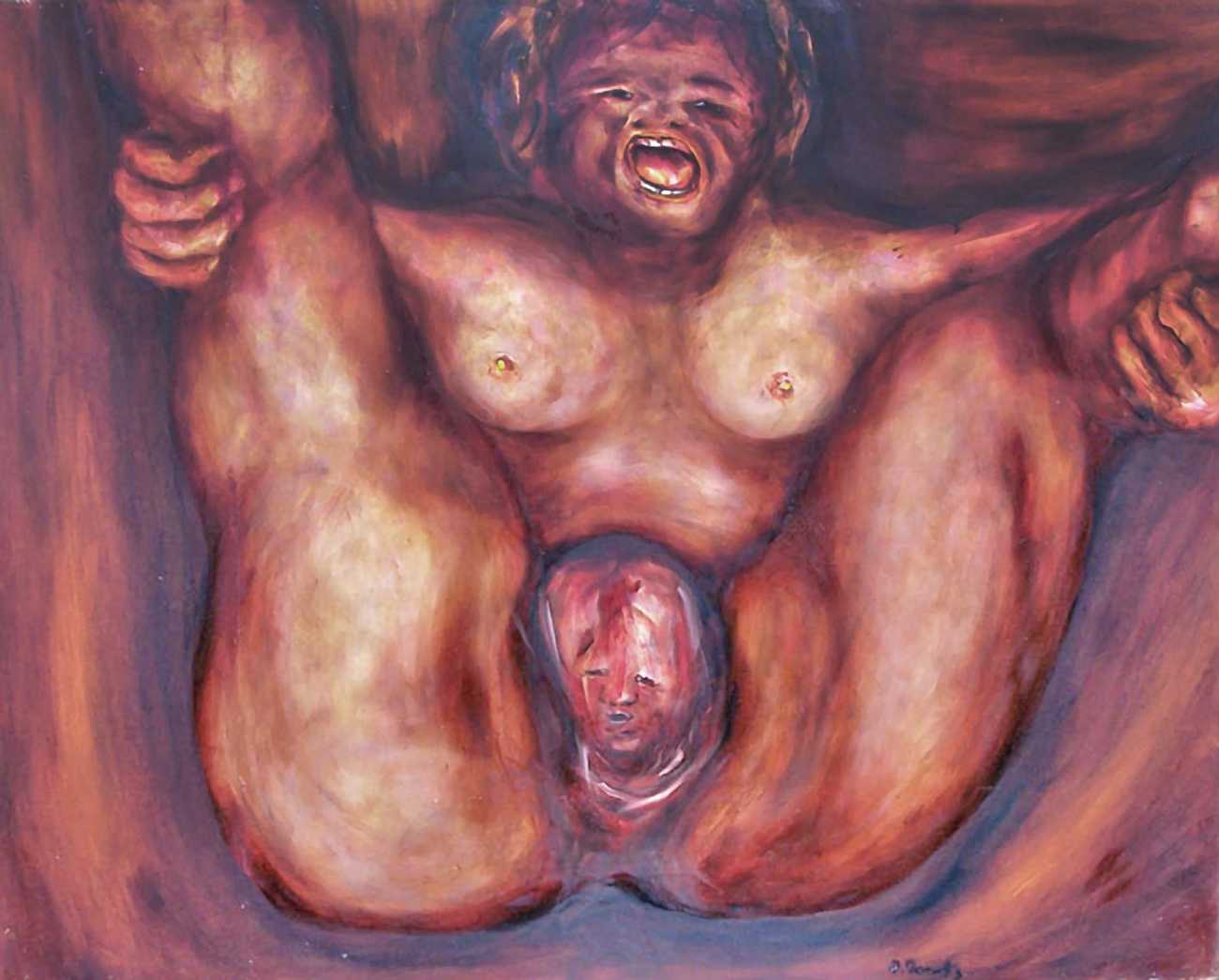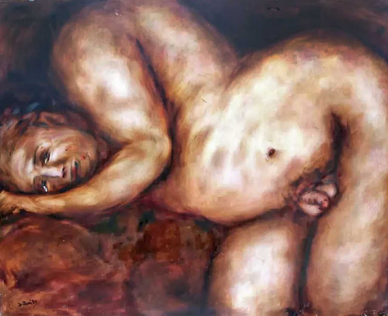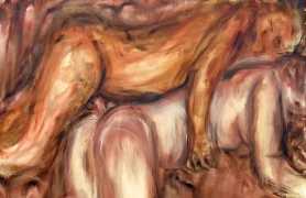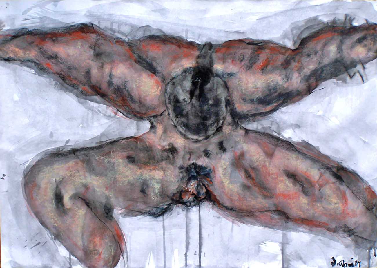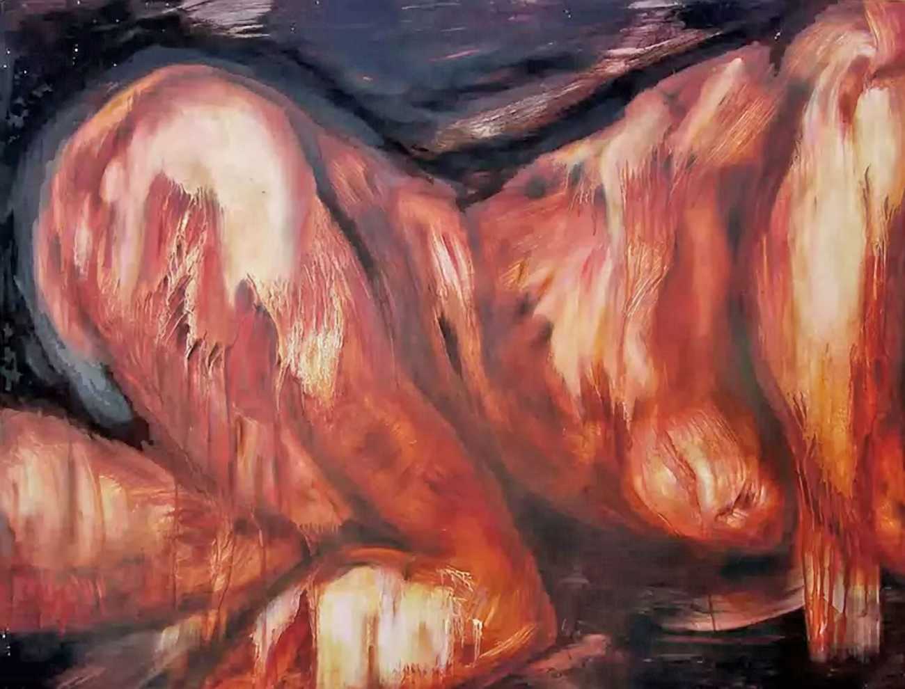 Possibly half of Rossi’s paintings are of naked human bodies, portrayed boldly, colourfully, and often displaying their sex for all to see. He explores the whole gamut of raw human experience, from warmth and pleasure to bondage and humiliation. Human sexuality for Rossi cannot be separated from our animal physicality; it has little to do with conventional beauty, but his very directness offers a certain quality of corporeal reality – tender, exposed, complex, chaotic – with which anyone who has experienced true sexual passion can identify.