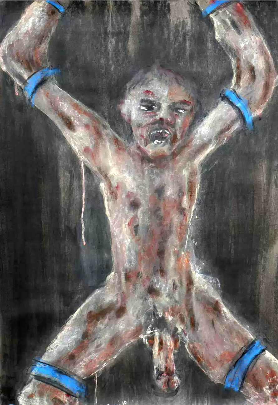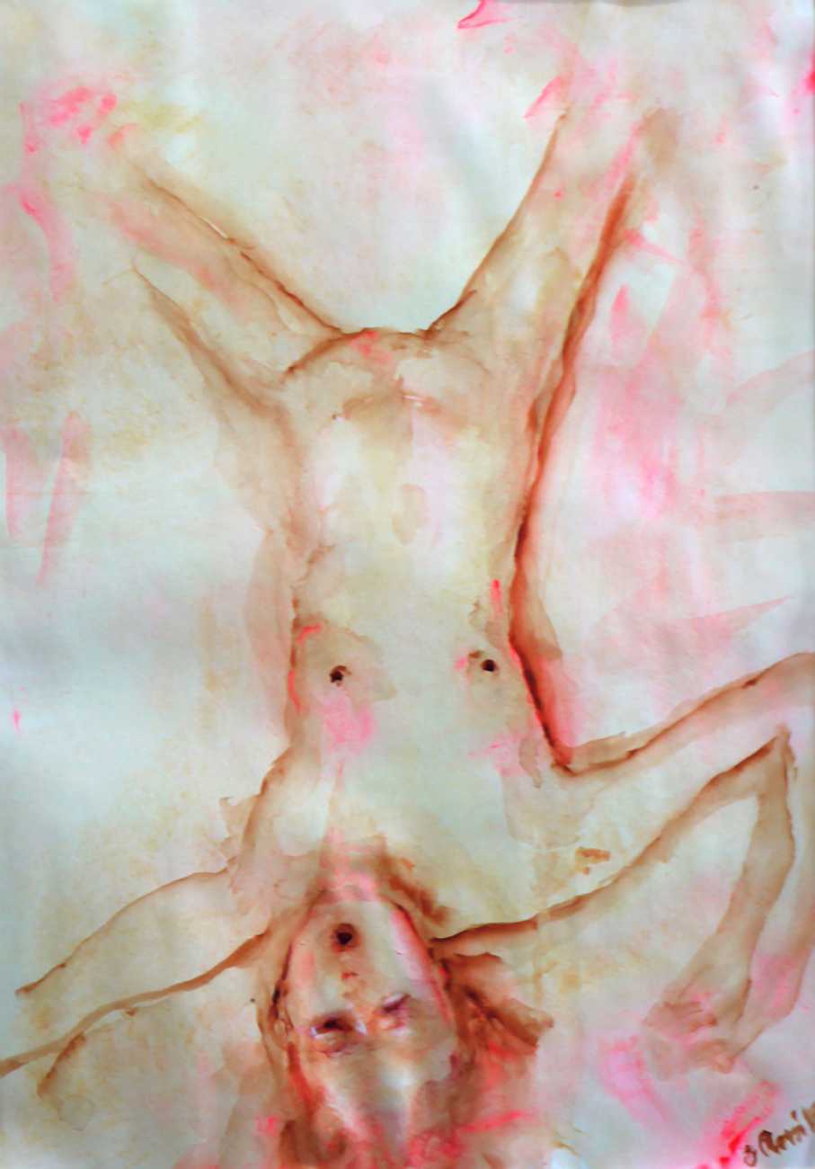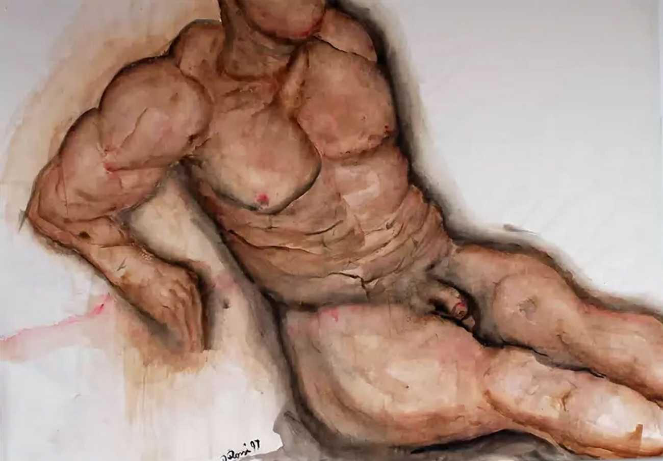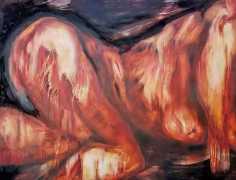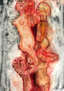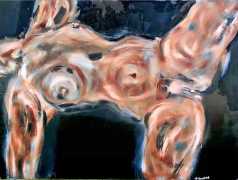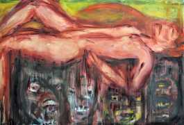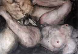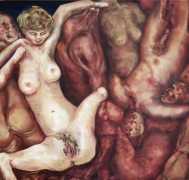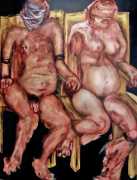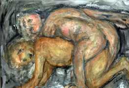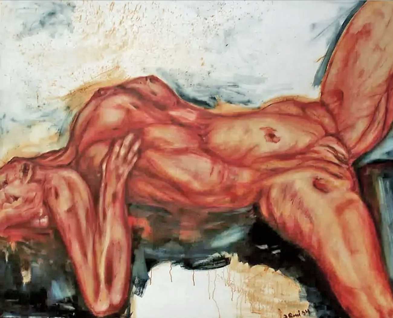 Possibly half of Rossi’s paintings are of naked human bodies, portrayed boldly, colourfully, and often displaying their sex for all to see. He explores the whole gamut of raw human experience, from warmth and pleasure to bondage and humiliation. Human sexuality for Rossi cannot be separated from our animal physicality; it has little to do with conventional beauty, but his very directness offers a certain quality of corporeal reality – tender, exposed, complex, chaotic – with which anyone who has experienced true sexual passion can identify.
