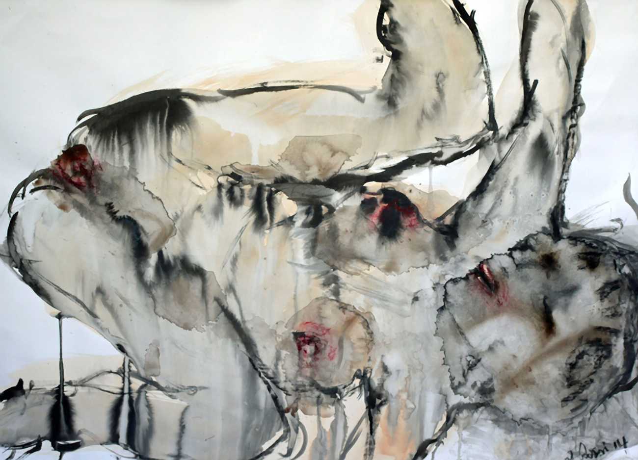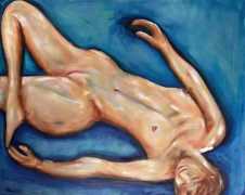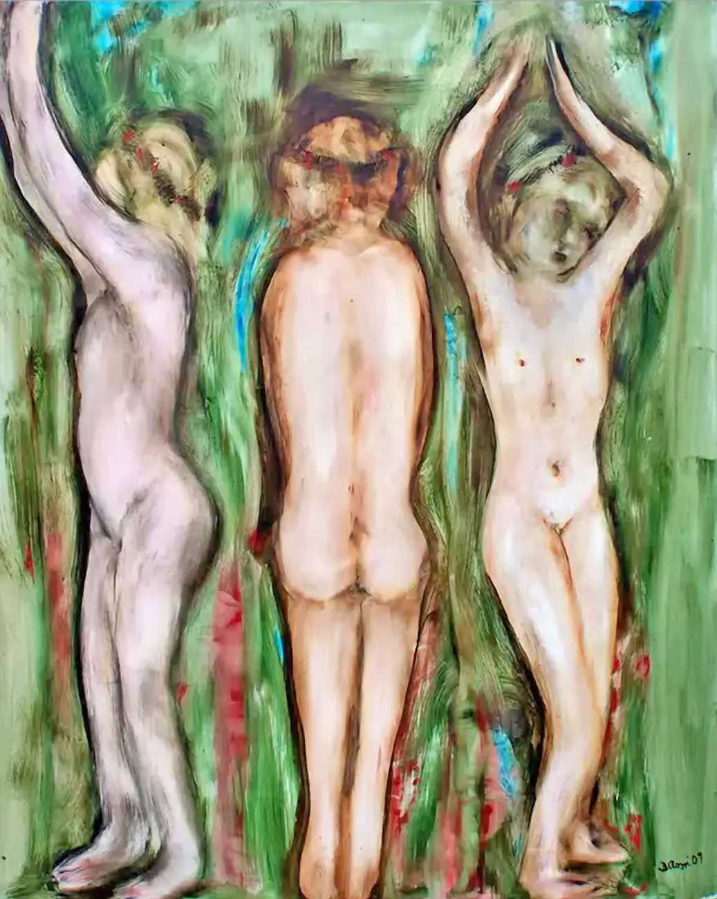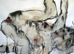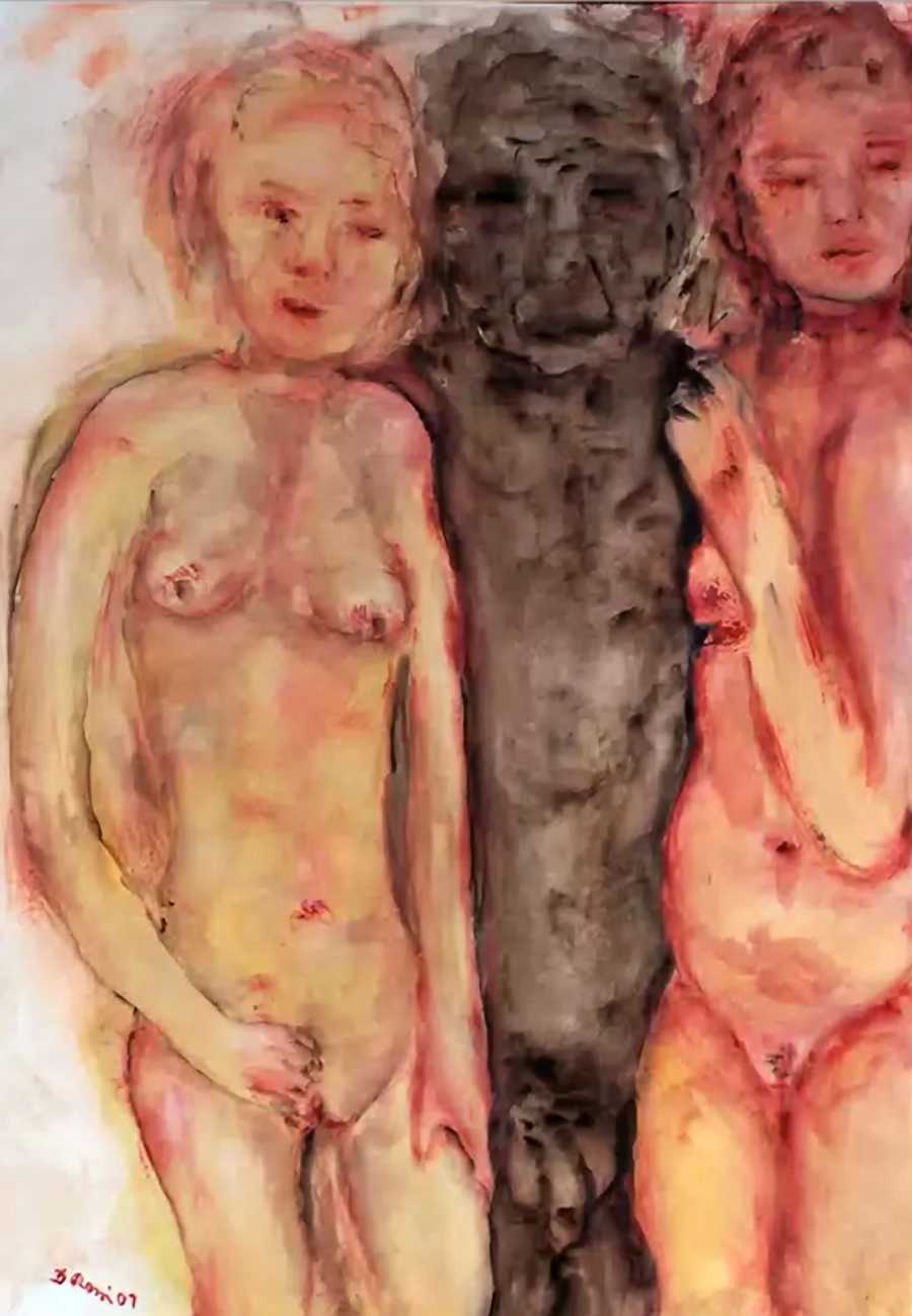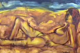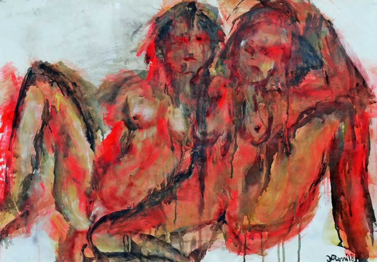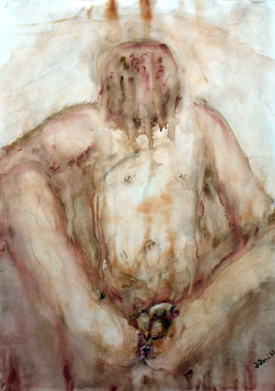 Possibly half of Rossi’s paintings are of naked human bodies, portrayed boldly, colourfully, and often displaying their sex for all to see. He explores the whole gamut of raw human experience, from warmth and pleasure to bondage and humiliation. Human sexuality for Rossi cannot be separated from our animal physicality; it has little to do with conventional beauty, but his very directness offers a certain quality of corporeal reality – tender, exposed, complex, chaotic – with which anyone who has experienced true sexual passion can identify.