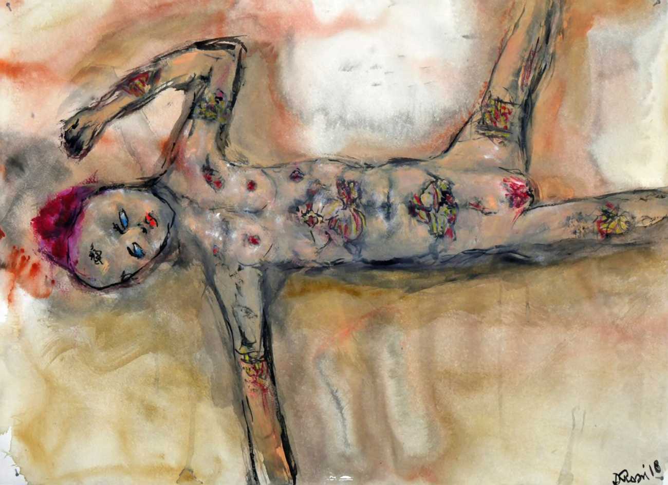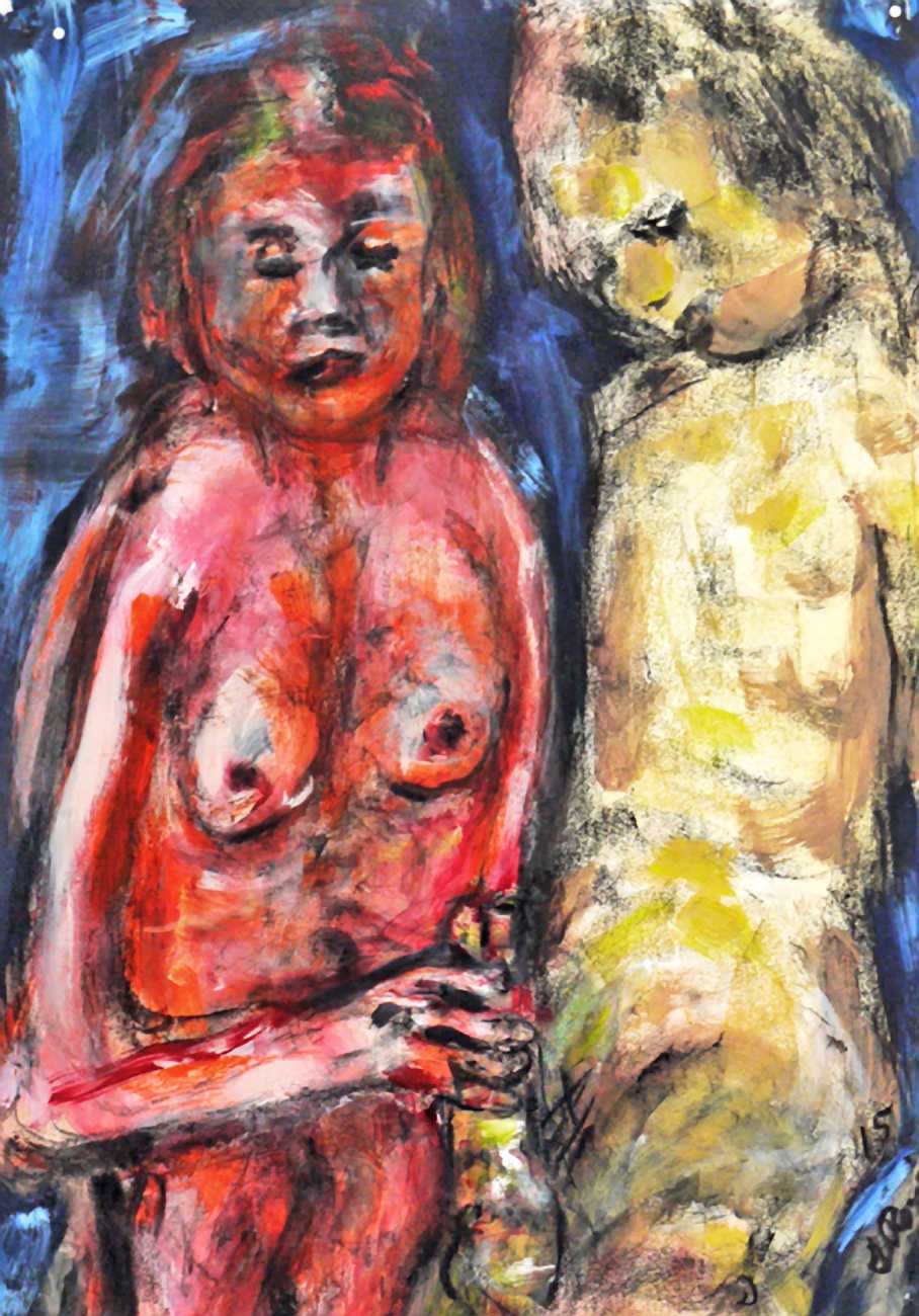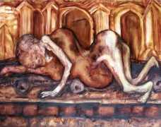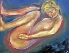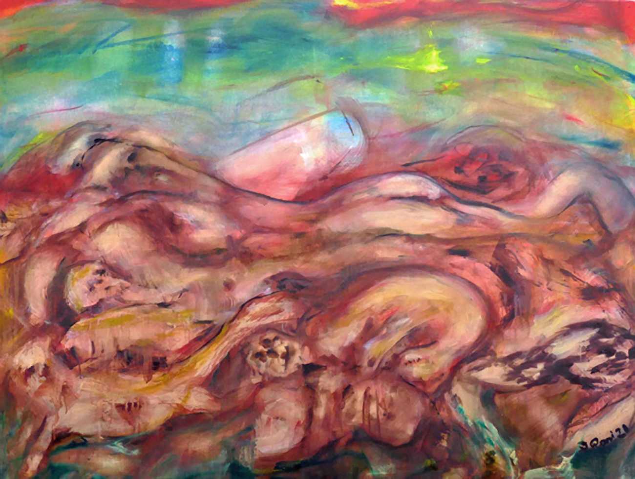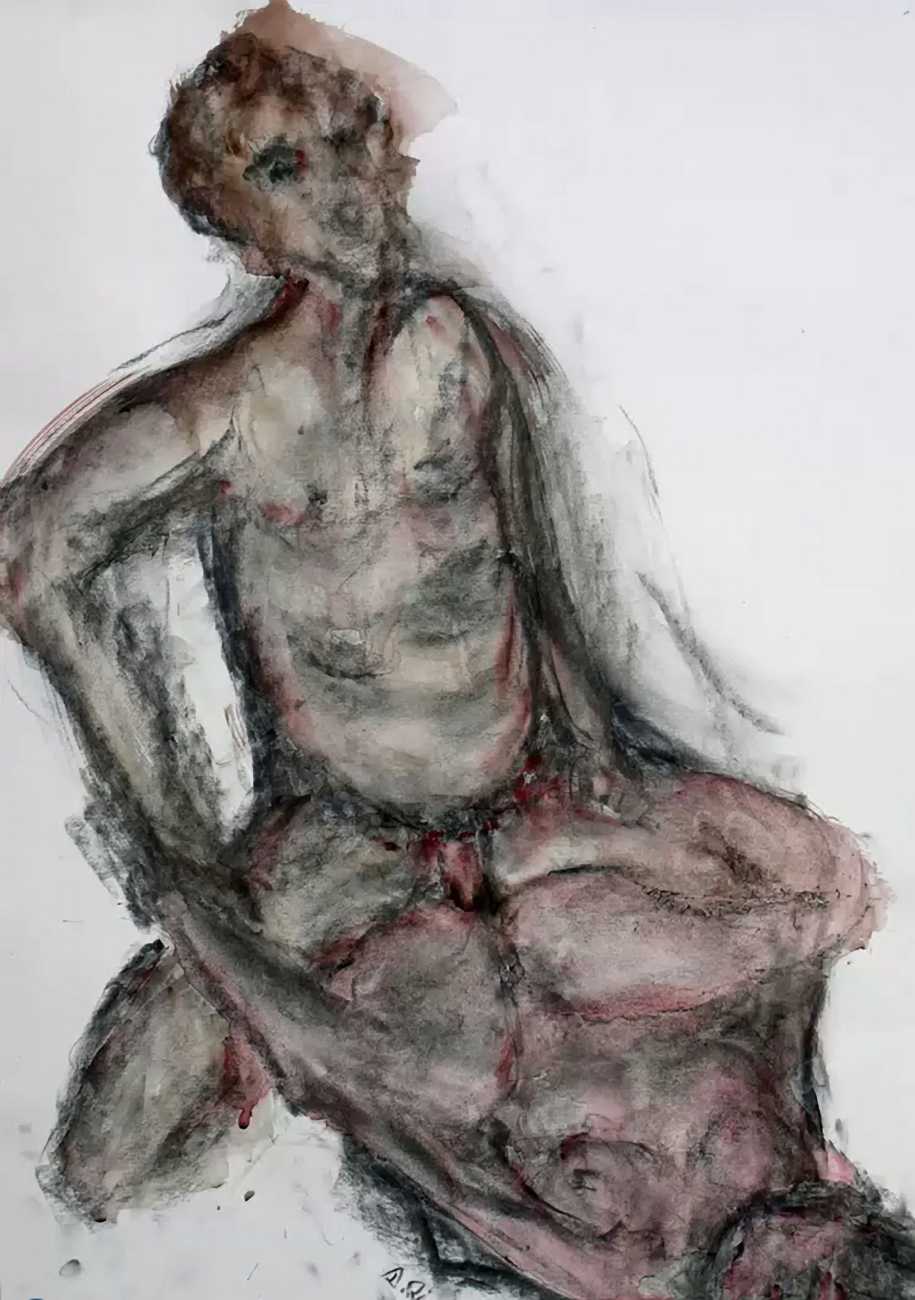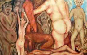 Possibly half of Rossi’s paintings are of naked human bodies, portrayed boldly, colourfully, and often displaying their sex for all to see. He explores the whole gamut of raw human experience, from warmth and pleasure to bondage and humiliation. Human sexuality for Rossi cannot be separated from our animal physicality; it has little to do with conventional beauty, but his very directness offers a certain quality of corporeal reality – tender, exposed, complex, chaotic – with which anyone who has experienced true sexual passion can identify.