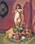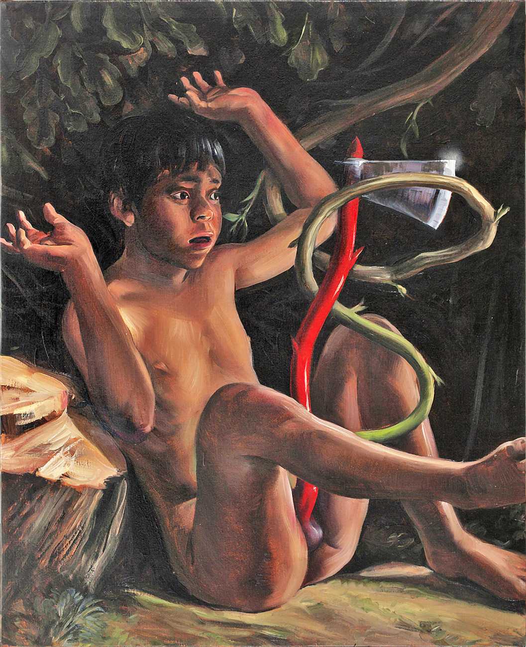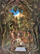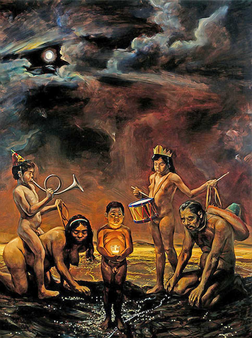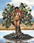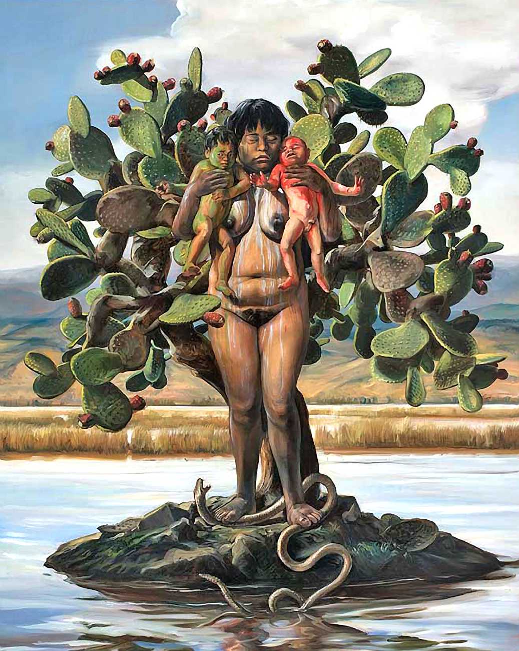A good example of Lezama’s interpretation of mythology is the painting titled Árbol Nodriza (Mother Tree), which he created after reading about the Chichihualcuauhco, the tree that feeds children before birth. He later found out about another mythological tree named Tamoanchan: Tlalocan, or paradise, is a place where there is a tree in the centre that holds the sky. That tree is responsible for the birth of mankind. It contains and combines the energies of heaven and earth from which the story of humanity arises as those two forces merge.