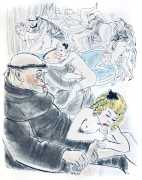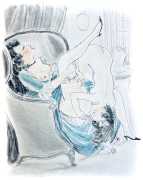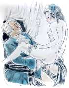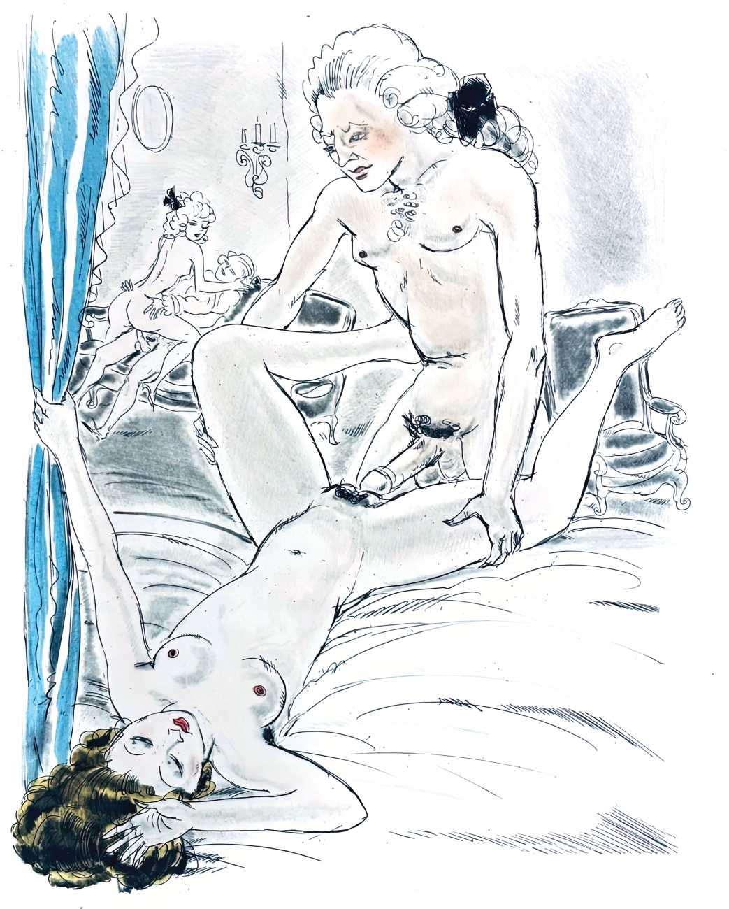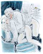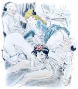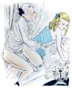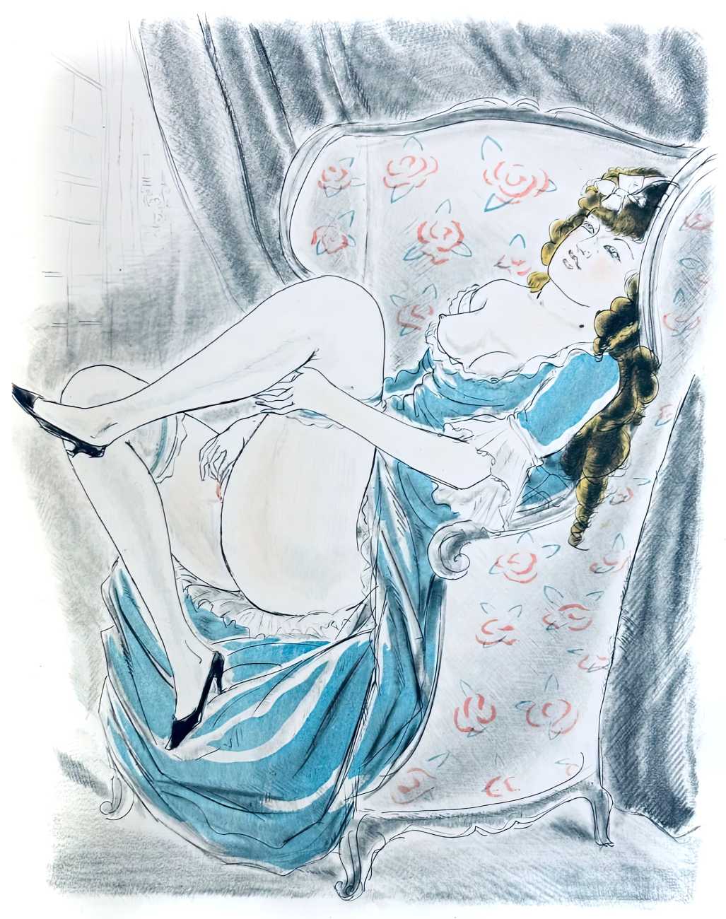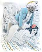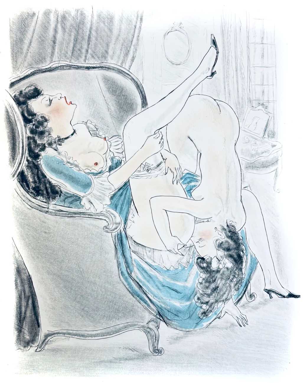 Histoire de Jérôme was Serres’ first erotic commission, the illustrations for which were attributed to ‘un artists inconnu’ (an unknown artist), but from this point onward, knowing he needed to protect his professional reputation while continuing to explore his interest in erotica, he adopted the pseudonym Schem for all his future work in the genre. There are clear earlier influences in this portfolio, especially the work of Marcel Vertès – the first plate is almost a reworking of the ‘Schönbrunn’ plate from Vertès’ 1921 Le pays à mon goût.