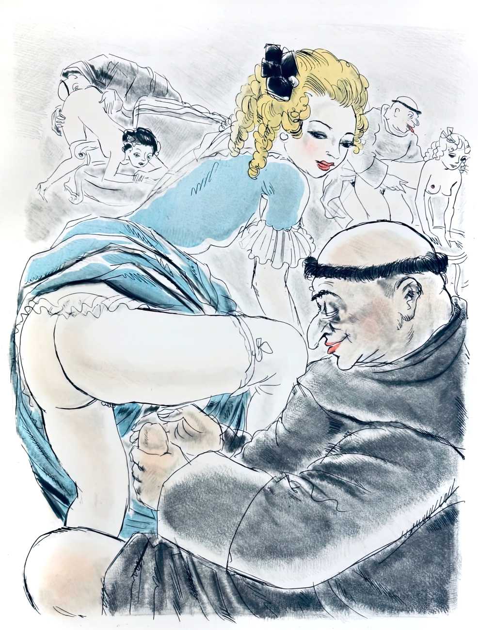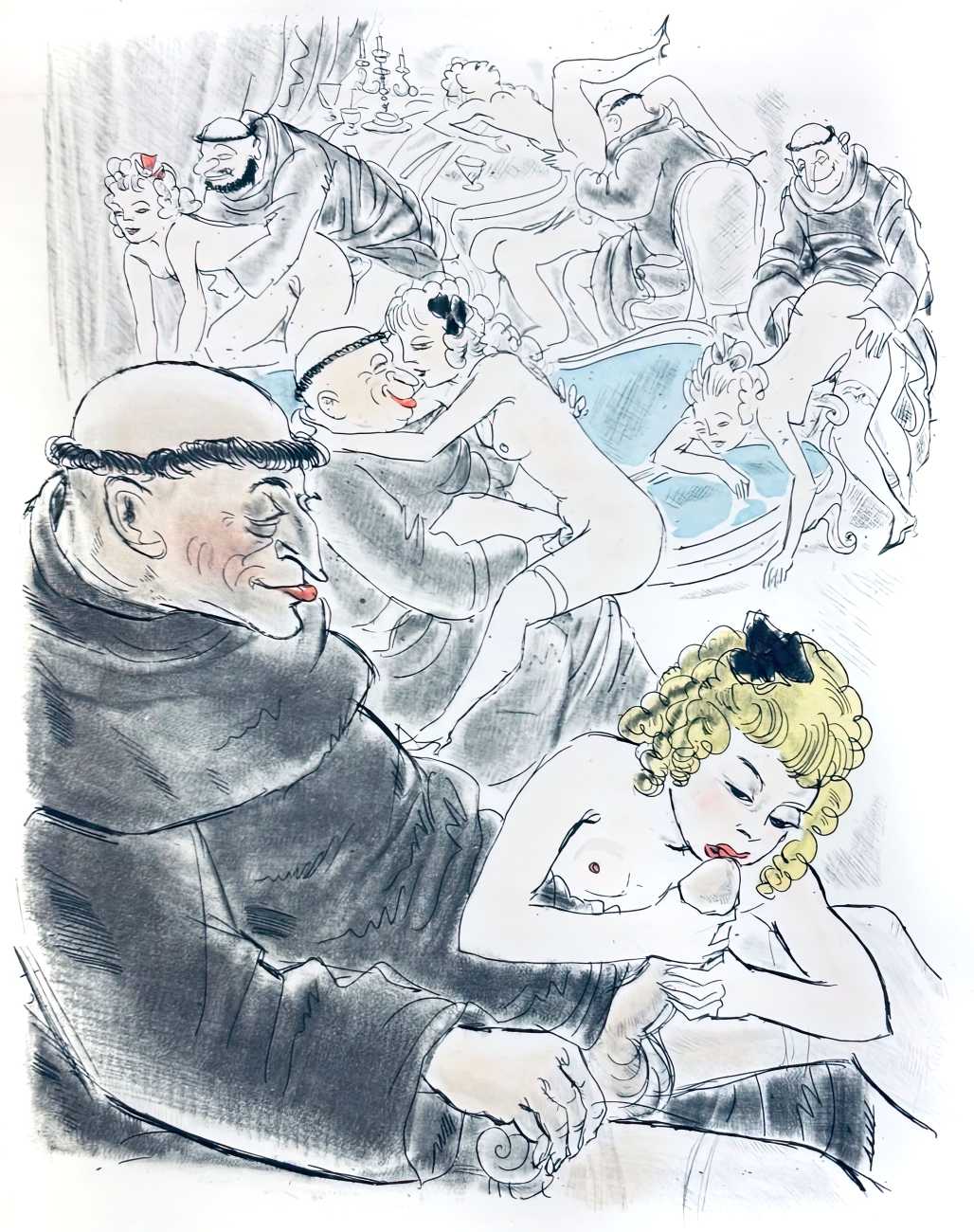 The story of Jerome is recounted in Chapter 11 of the Marquis de Sade’s La Nouvelle Justine, ou les malheurs de la vertu (The New Justine, or The Misfortunes of Virtue). He is one of the monks in a monastery where Justine takes refuge – ‘Jerome, the eldest of the four recluses, was also the most debauched; every taste, every passion, every one of the most bestial irregularities were combined in this monk’s soul; to the caprices rampant in the others, he joined that of loving to receive what his comrades distributed amongst the girls, and if he gave (which frequently happened), it was always upon condition of being treated likewise in his turn: all the temples of Venus were, what was more, as one to him, but his powers were beginning to decline and for several years he had preferred that which, requiring no effort of the agent, left to the patient the task of arousing the sensations and of producing the ecstasy. The mouth was his favourite temple, the shrine where he liked best to offer, and while he was in the pursuit of those choice pleasures, he would keep a second woman active: she warmed him with the lash.’