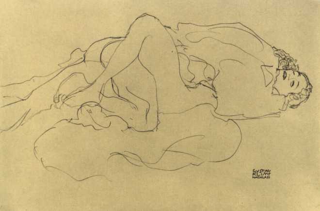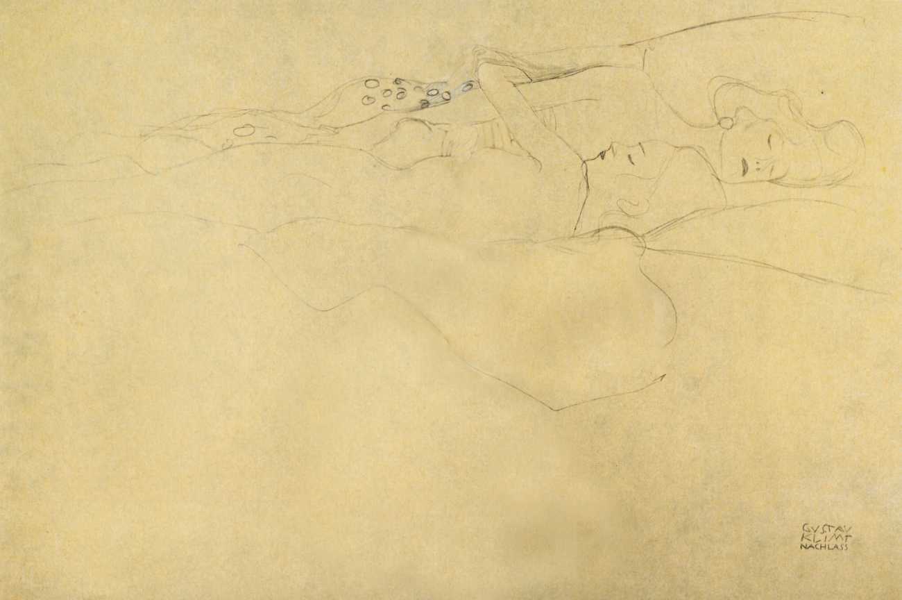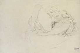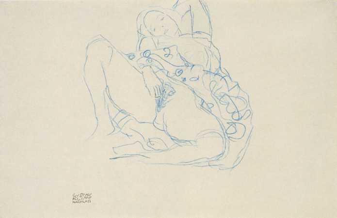 This atmosphere can be seen and felt most clearly in the many drawings in which Klimt conflates womanliness and femininity. These women are shown alone or in pairs, and they are completely self-absorbed. Klimt depicts them in various states of undress, as Servacs noted, but he also portrays them even more explicitly: as they masturbate and, as if it were completely incidental, lie with their thighs apart. They are always self-absorbed, but their availability, which they had to display as a matter of course in Klimt’s studio. is never revealed in these drawings. Everything was meant to seem as if these acts were the result of the most natural of drives and as if it were simply the intrinsic condition of woman to be centred on her own sexuality, deep in thought and lost in dreams. In contrast to the younger generation of Expressionists, Schiele and Kokoschka, Klimt himself is never present in these drawings. That he was most definitely present in the studio environment where these works were created is of course self-evident.