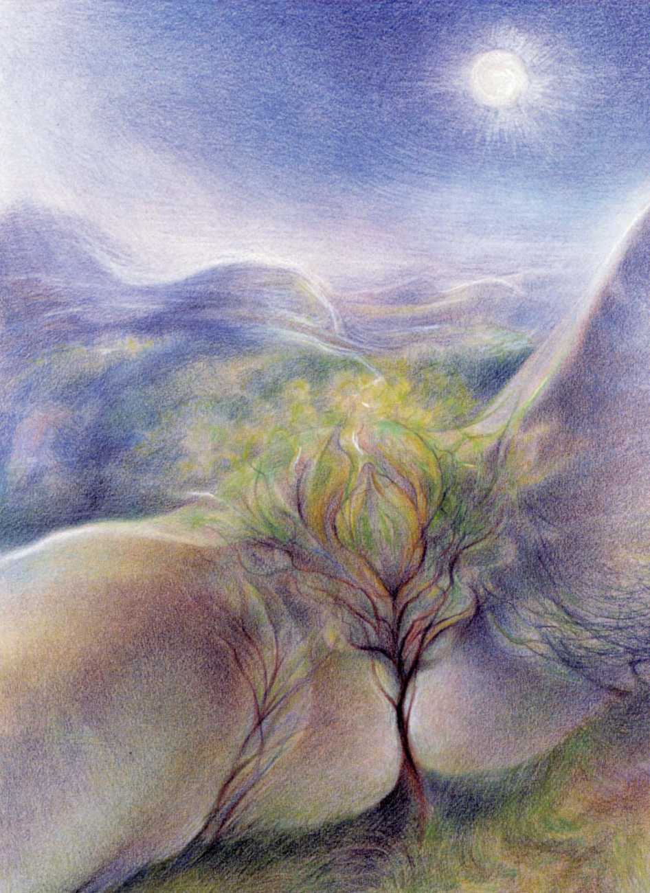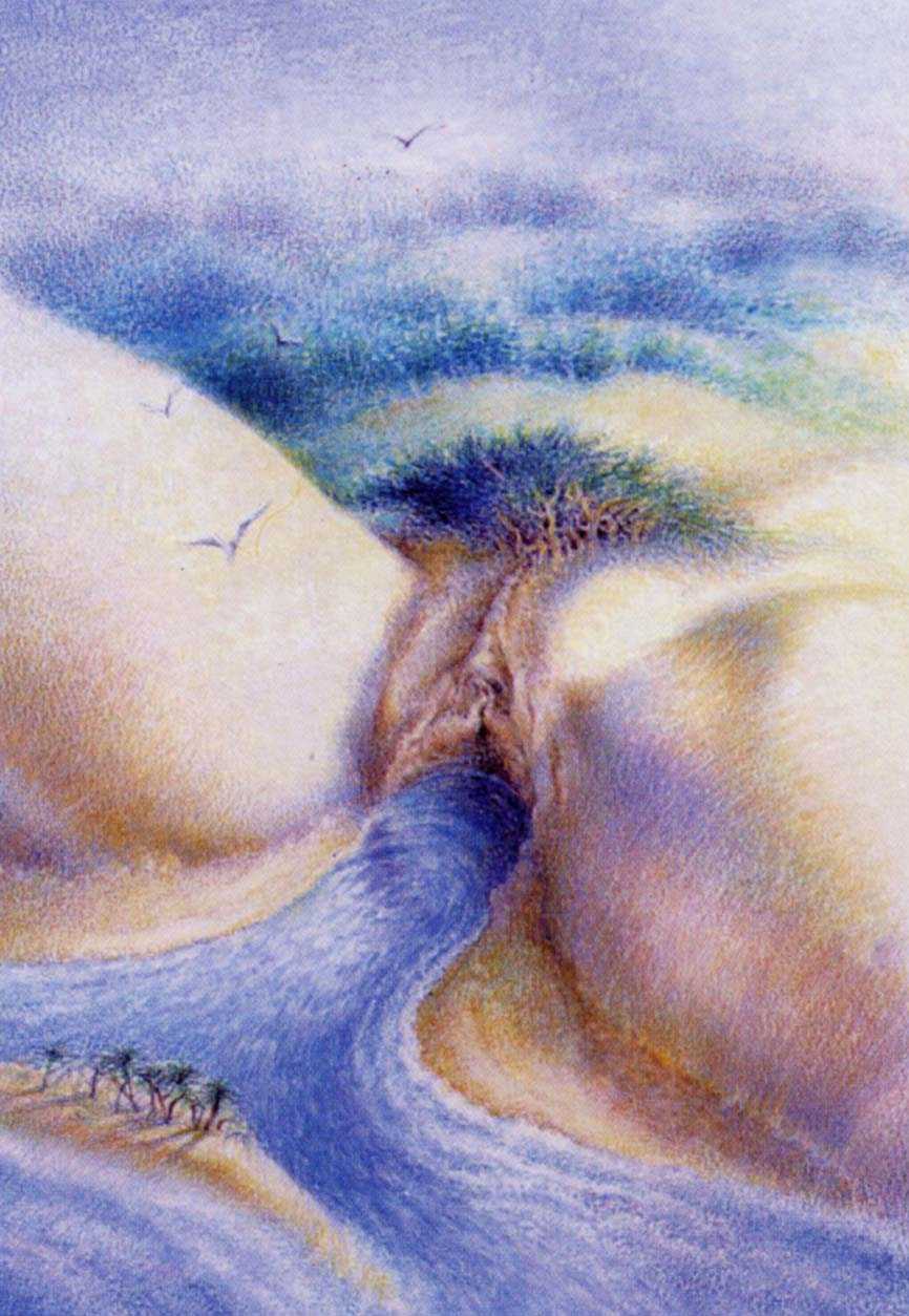 Lynn Paula Russell started painting these large coloured canvases in the late 1980s, and selections appeared in the two anthologies of her work published by The Erotic Print Society in 1997 and 2000; she has continued to produce similar work since. She describes them as being part of her long-standing view of nature as a mystical lifeforce, bringing together the human form and natural phenomena – landscapes, flowers, trees, clouds and water – to create sensual and mystical ‘bodyscapes’.