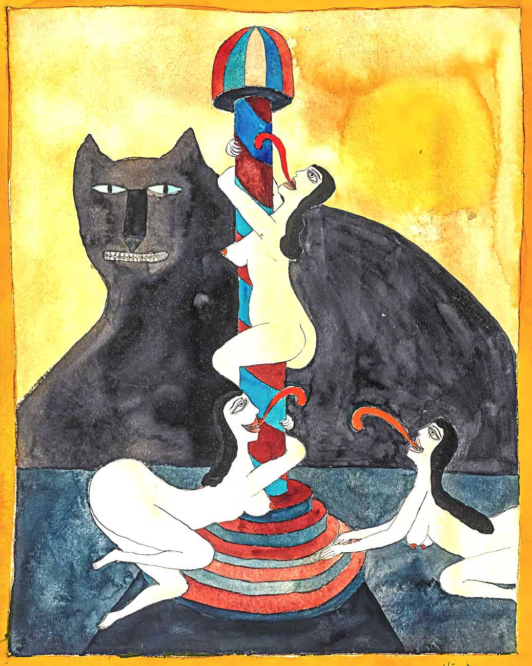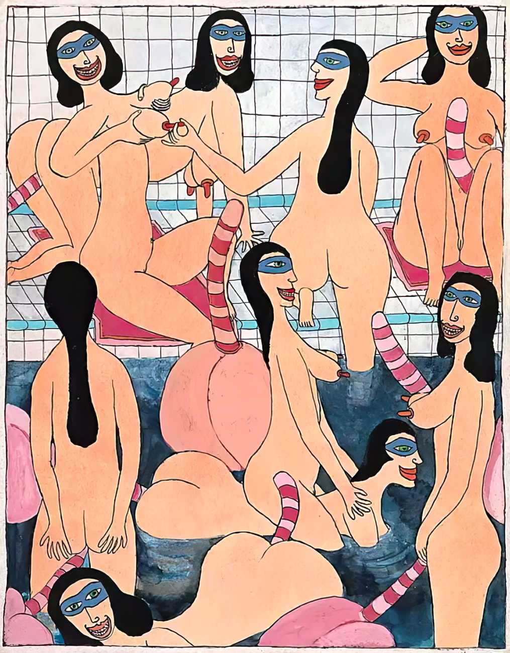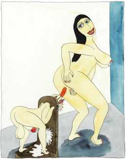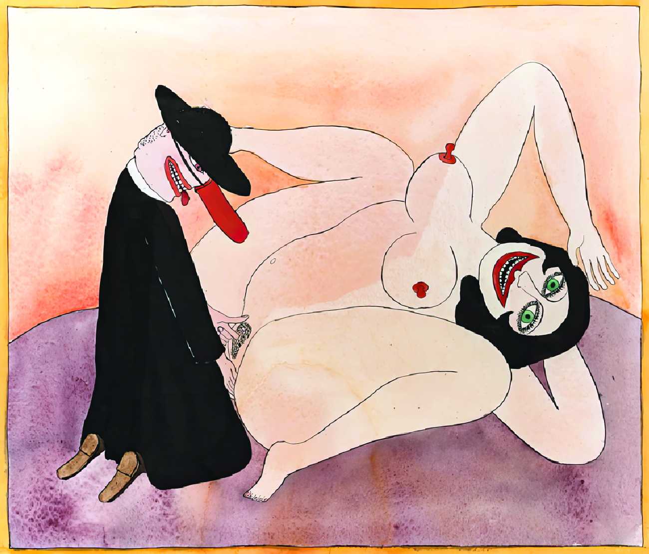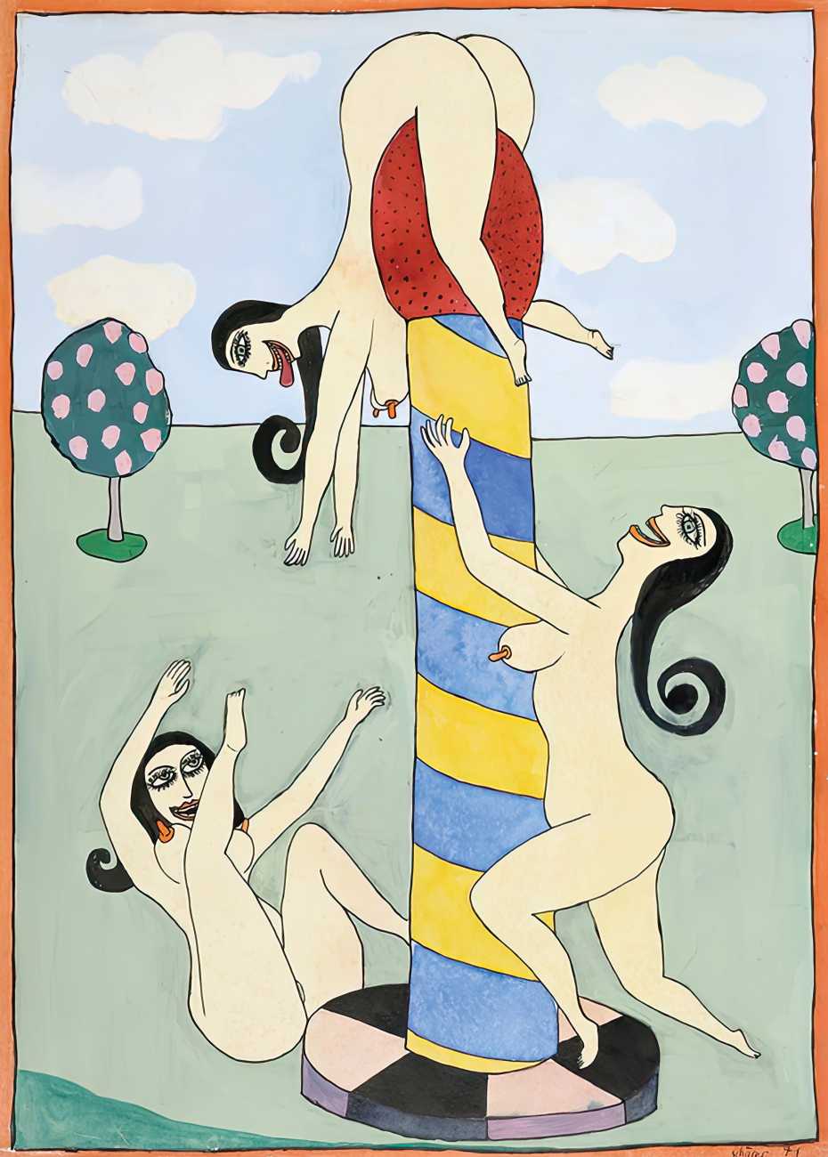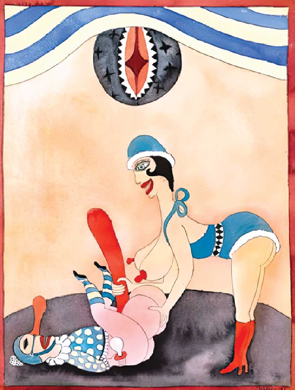 Hans Schärer’s erotic watercolours are joyfully carnivalesque scenes in which bodies lustfully cavort and play. In settings that suggest a circus or a garden of earthly delights, sensual statuesque women take pleasure in their own company and from diminutive male figures with penis-shaped red noses.