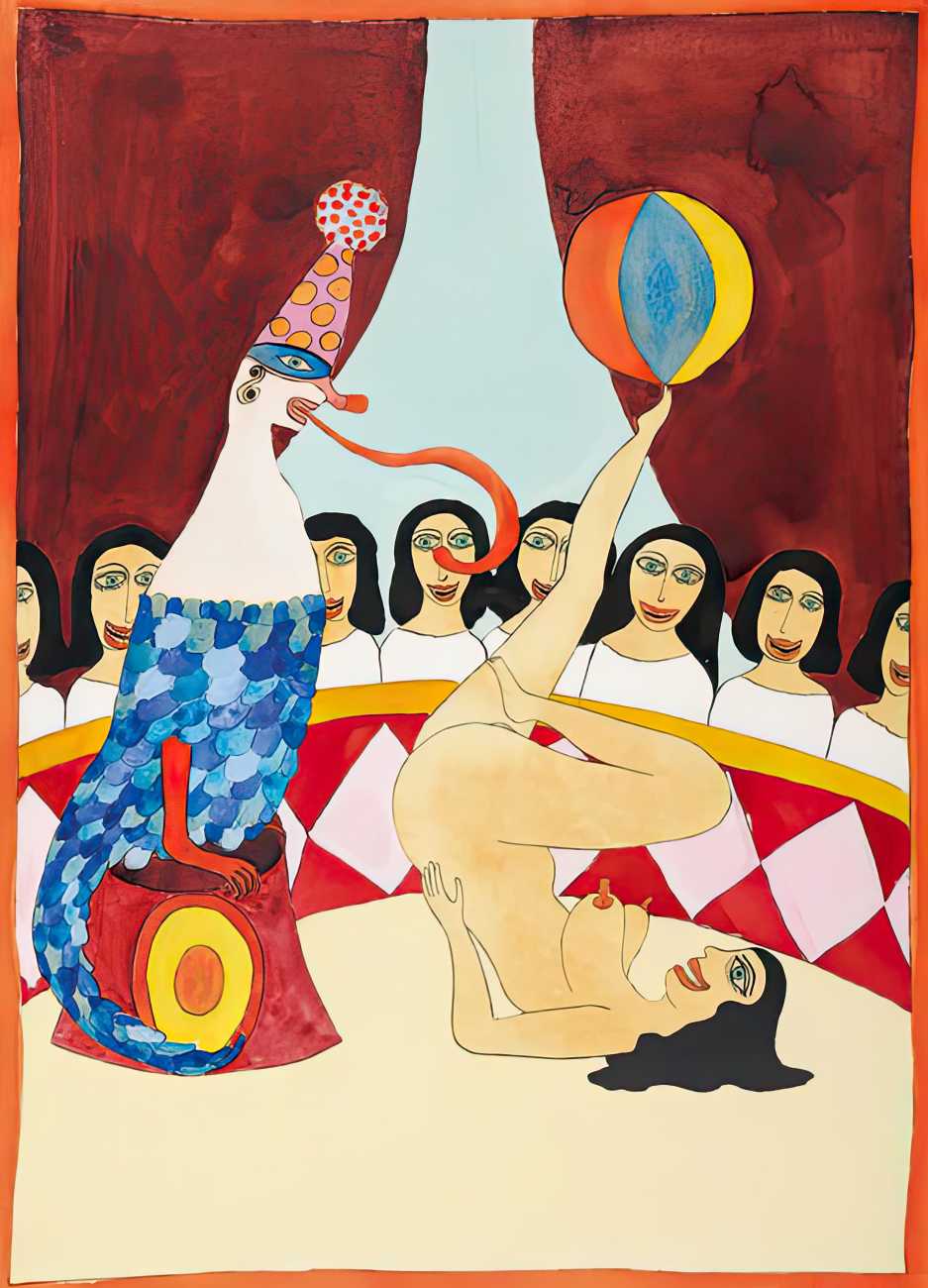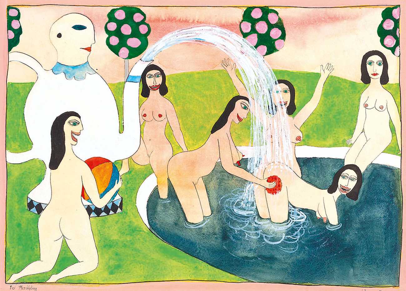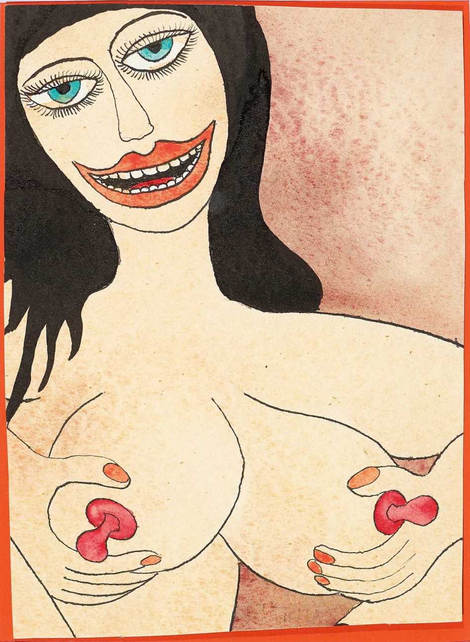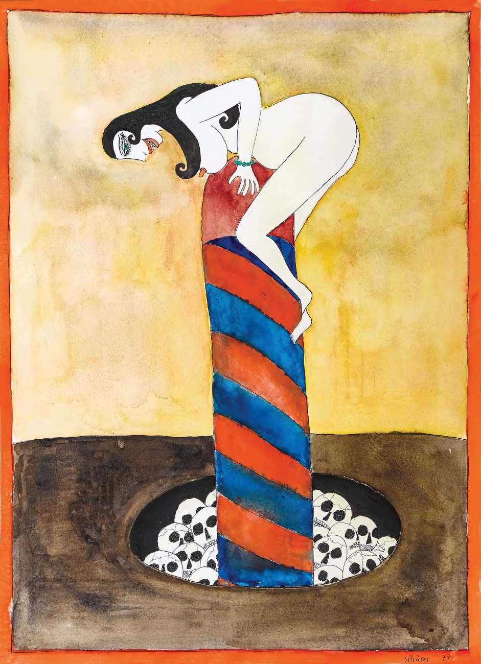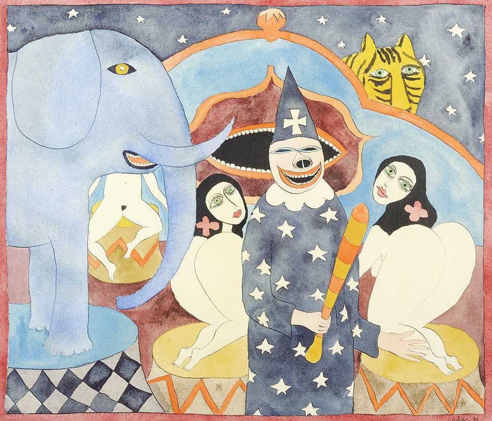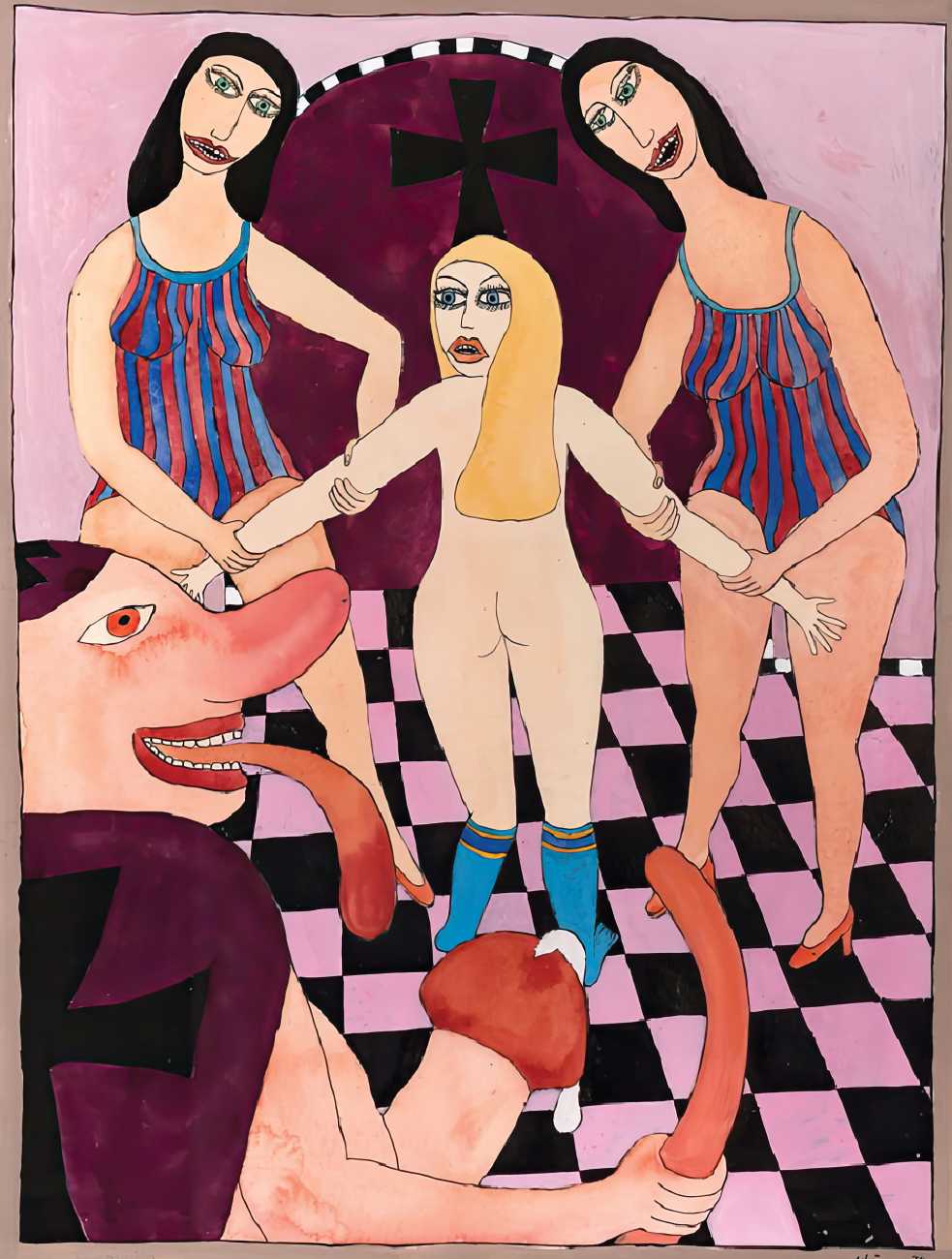 Hans Schärer’s erotic watercolours are joyfully carnivalesque scenes in which bodies lustfully cavort and play. In settings that suggest a circus or a garden of earthly delights, sensual statuesque women take pleasure in their own company and from diminutive male figures with penis-shaped red noses.