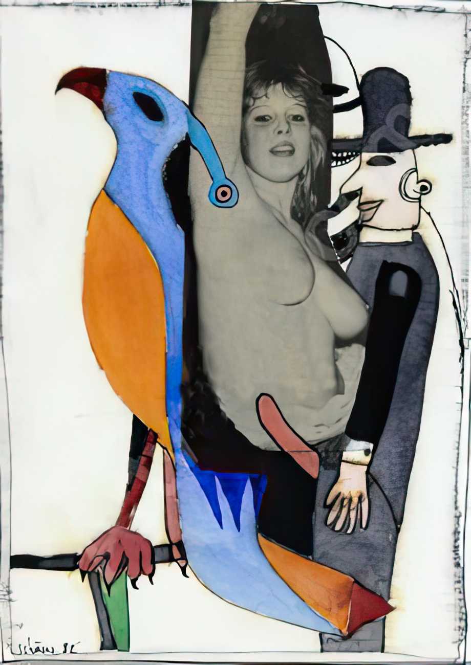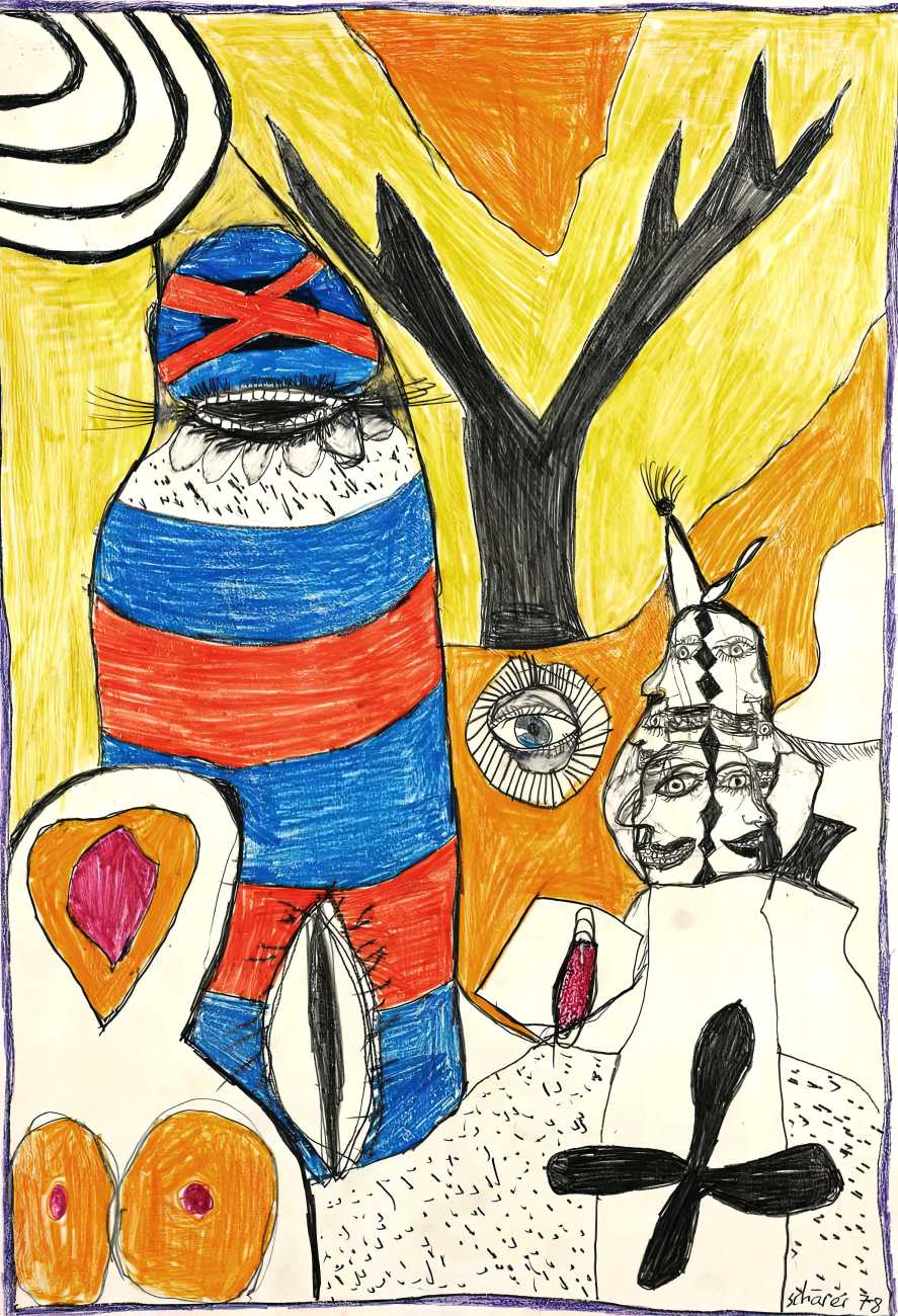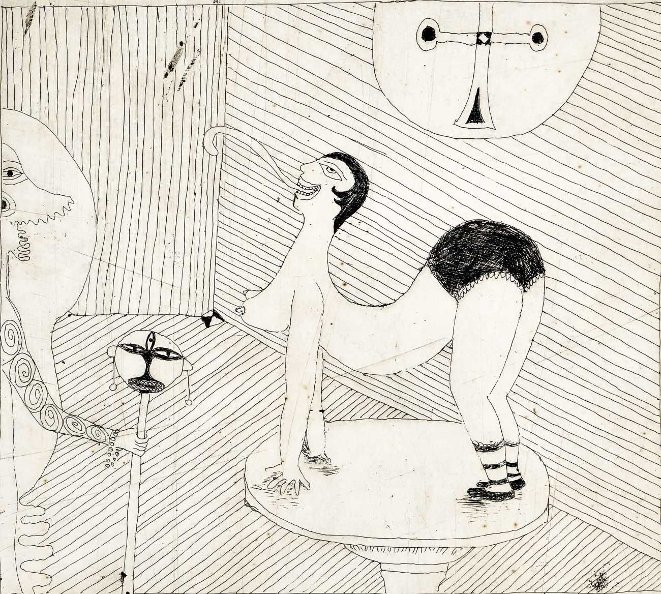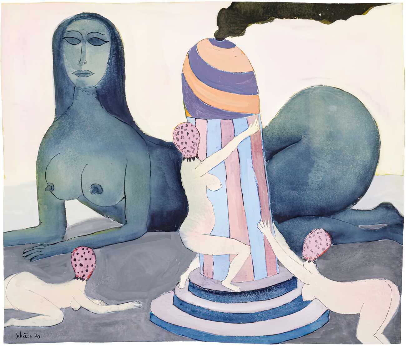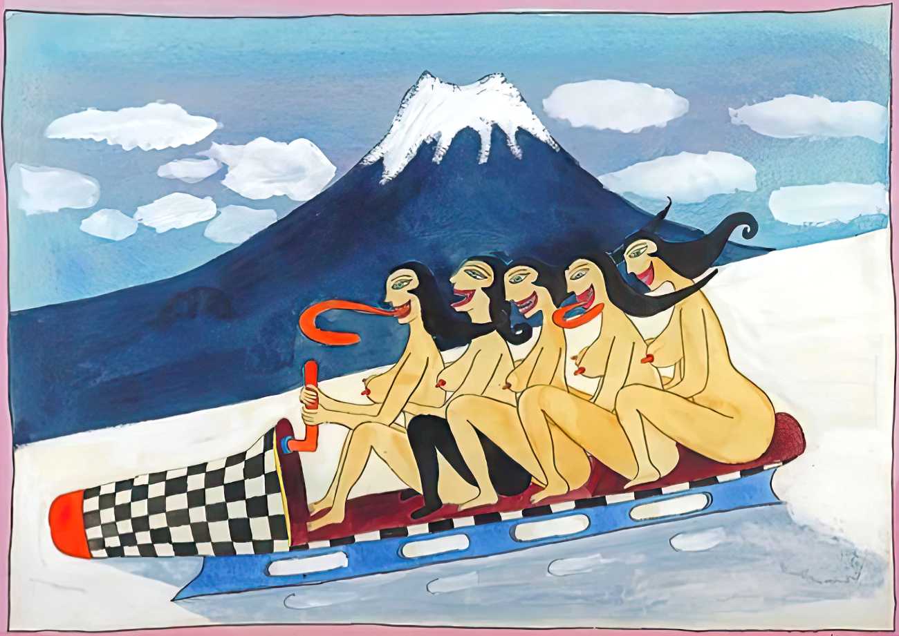 Hans Schärer’s erotic watercolours are joyfully carnivalesque scenes in which bodies lustfully cavort and play. In settings that suggest a circus or a garden of earthly delights, sensual statuesque women take pleasure in their own company and from diminutive male figures with penis-shaped red noses.