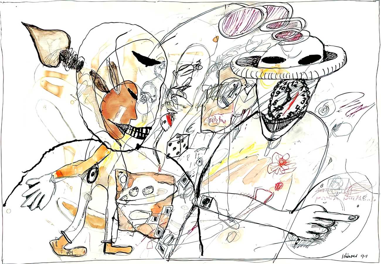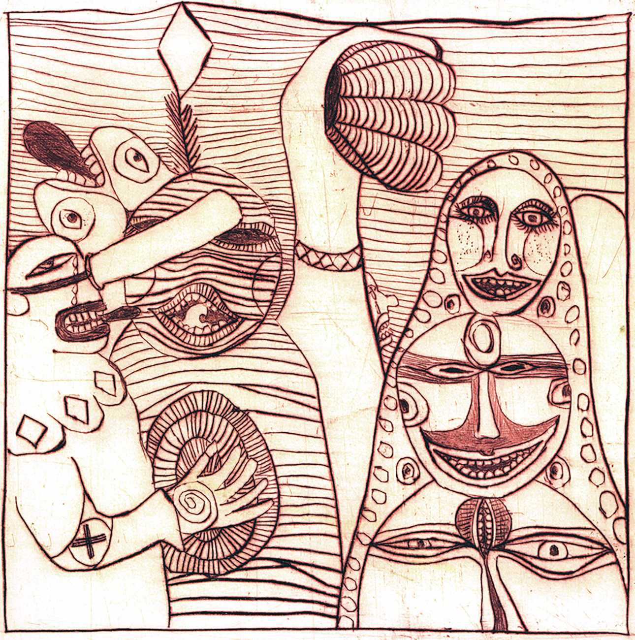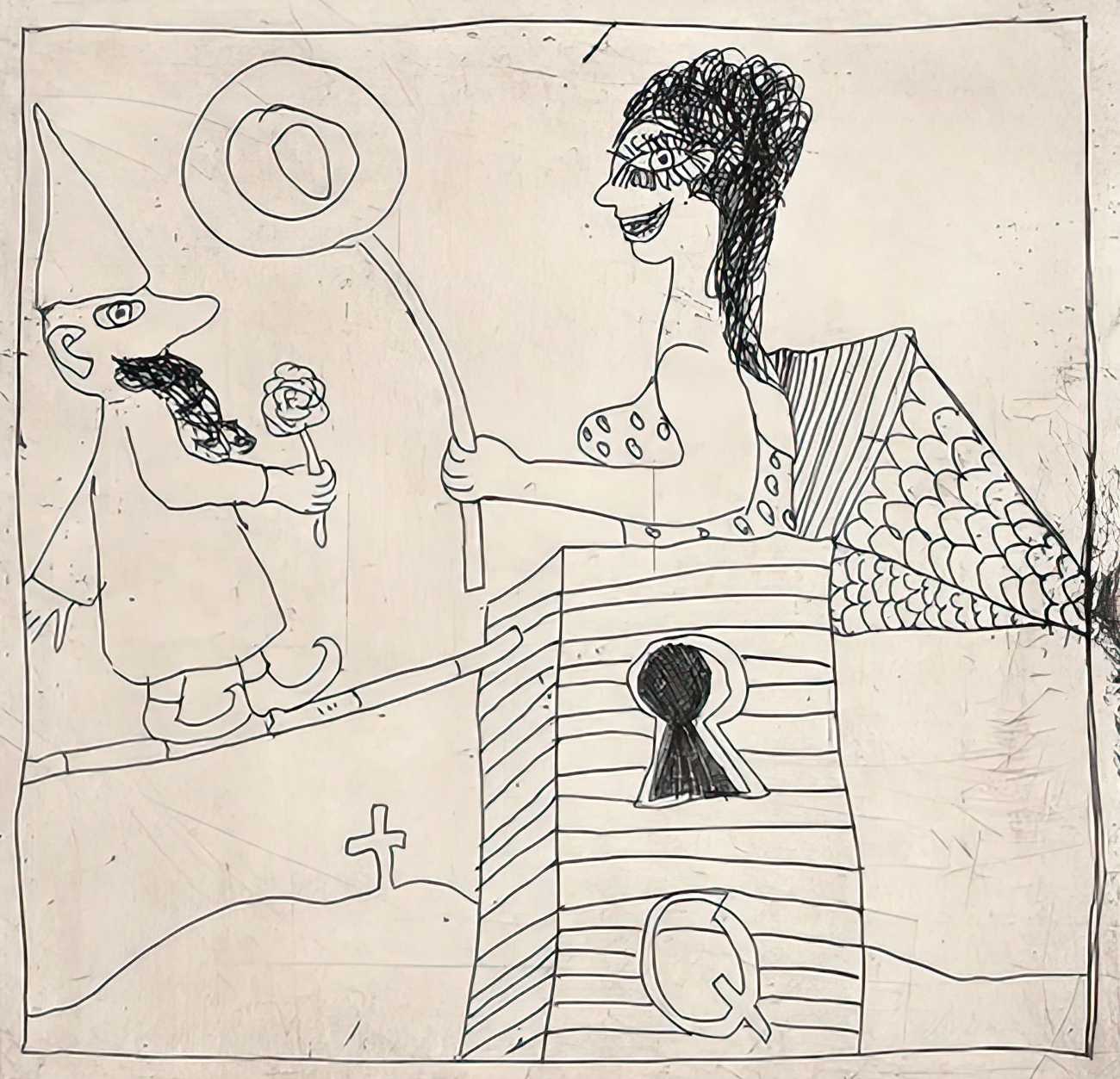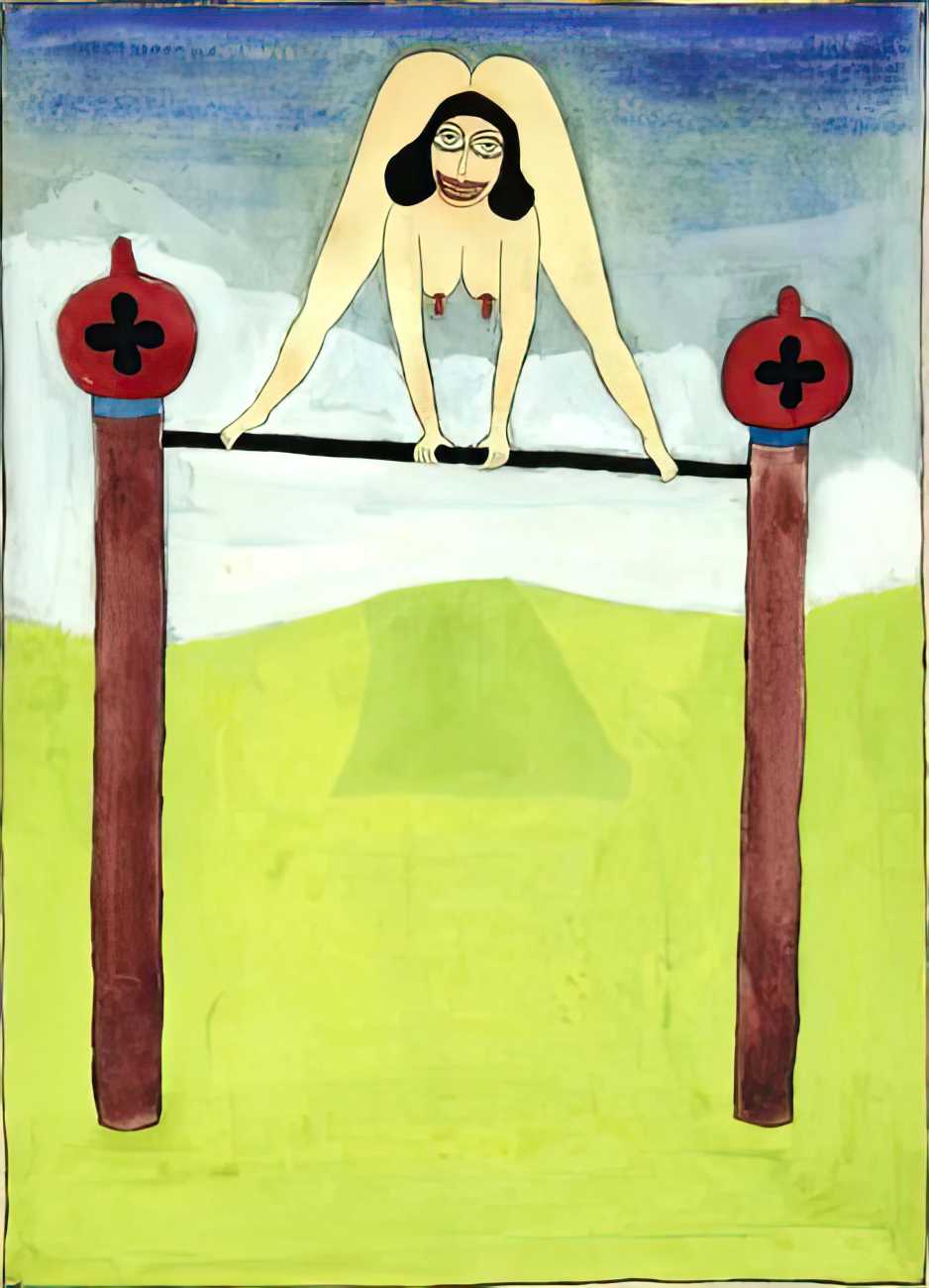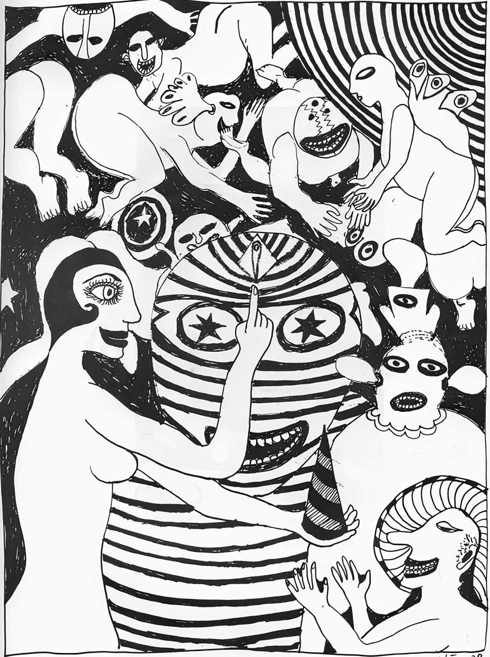 Hans Schärer’s erotic watercolours are joyfully carnivalesque scenes in which bodies lustfully cavort and play. In settings that suggest a circus or a garden of earthly delights, sensual statuesque women take pleasure in their own company and from diminutive male figures with penis-shaped red noses.
