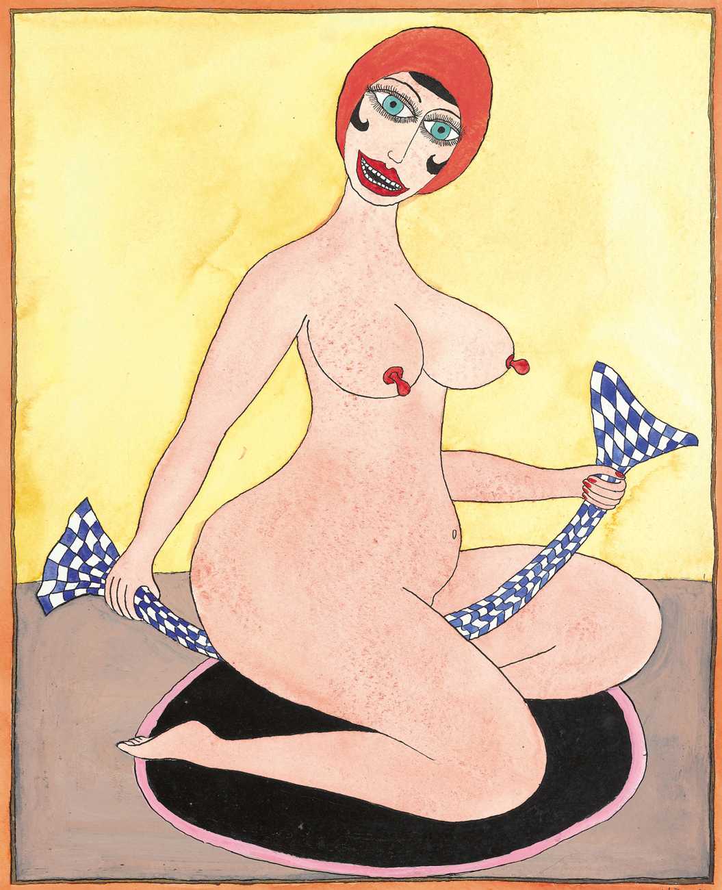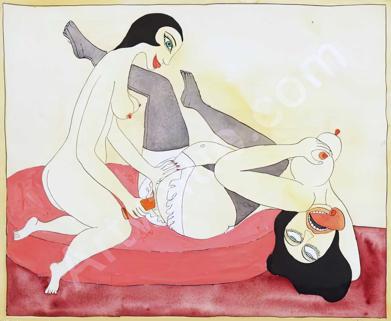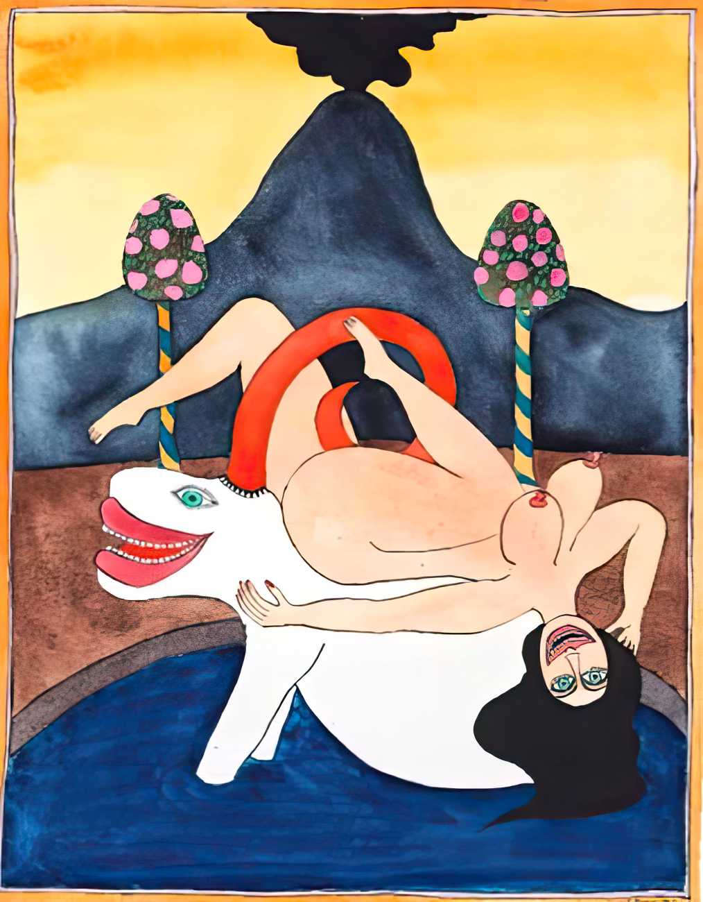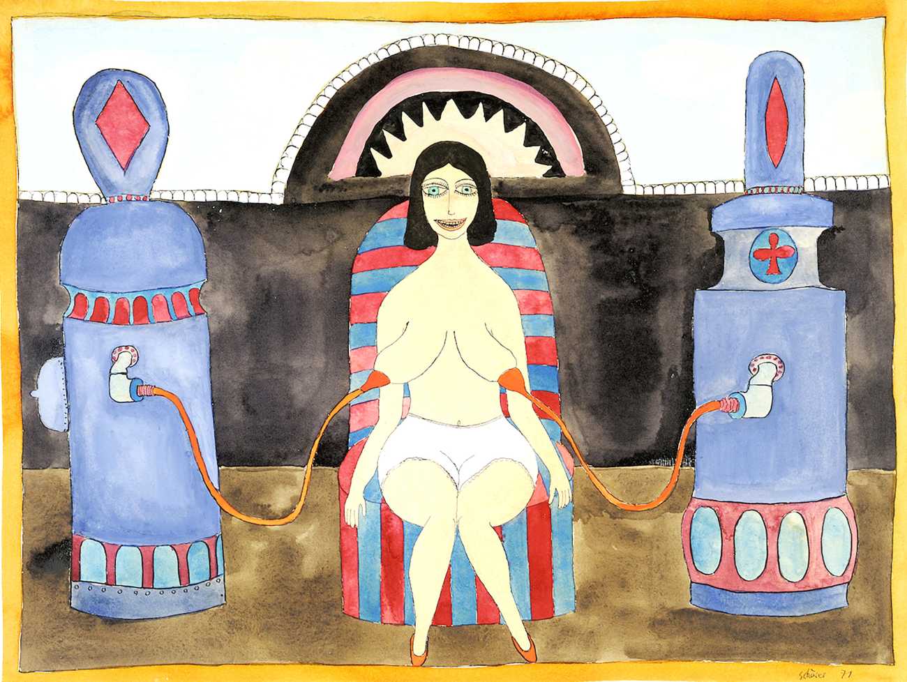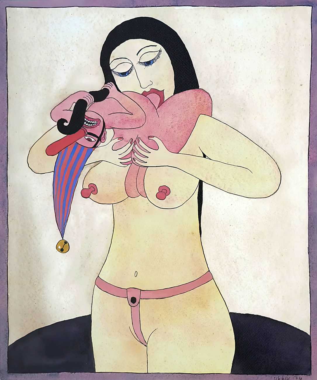 His women embrace phallic structures and receive pleasure from creepy grinning animals, bizarre contraptions, and the ubiquitous red-nosed little man. The women are commanding, taking charge, and Schärer almost always portrays them larger than the men. Dream-like, blatantly absurd, and thoroughly exhilarating, his watercolours not only celebrate sex, but they appear to do so from a female perspective, where no woman’s fantasies are off-limits.
