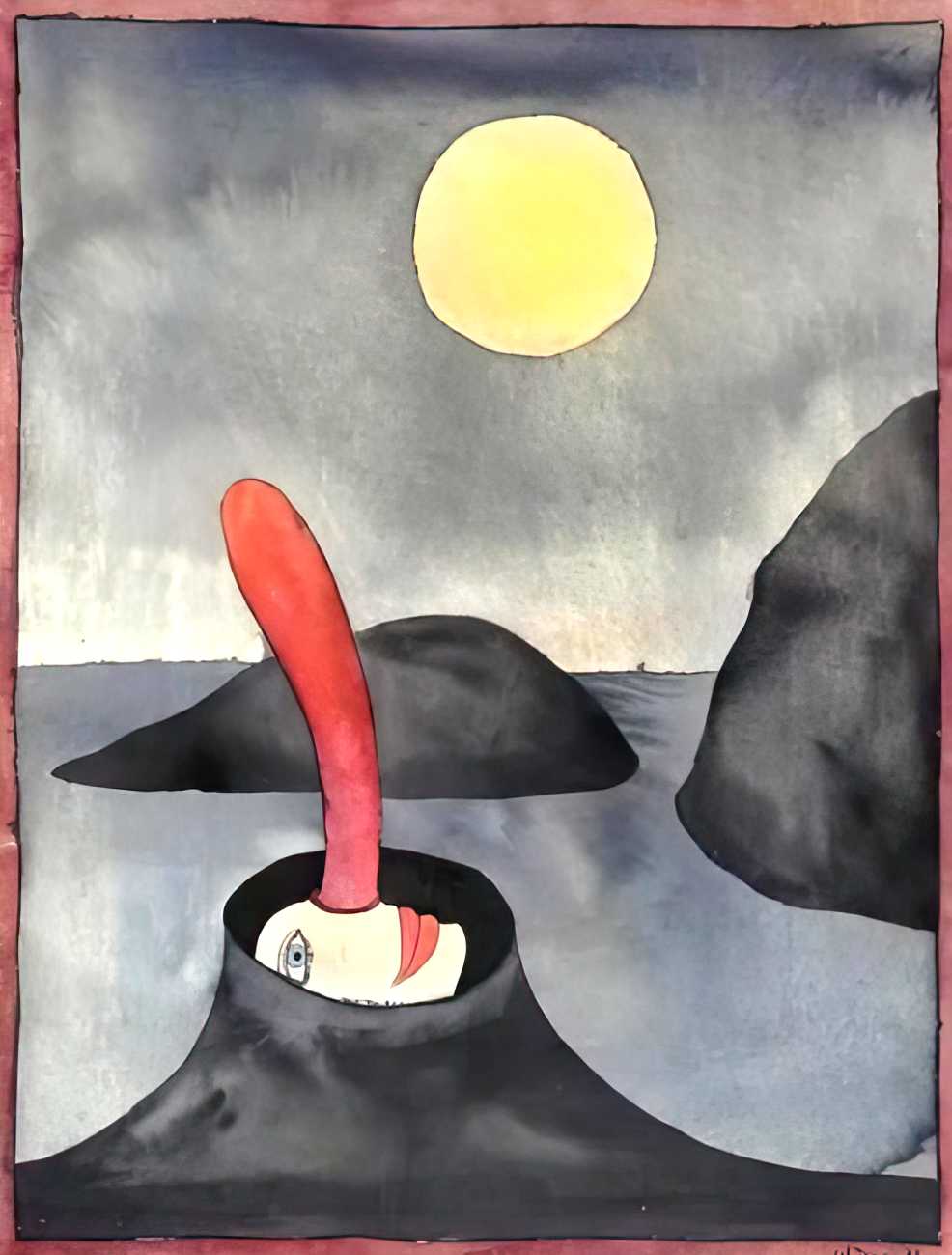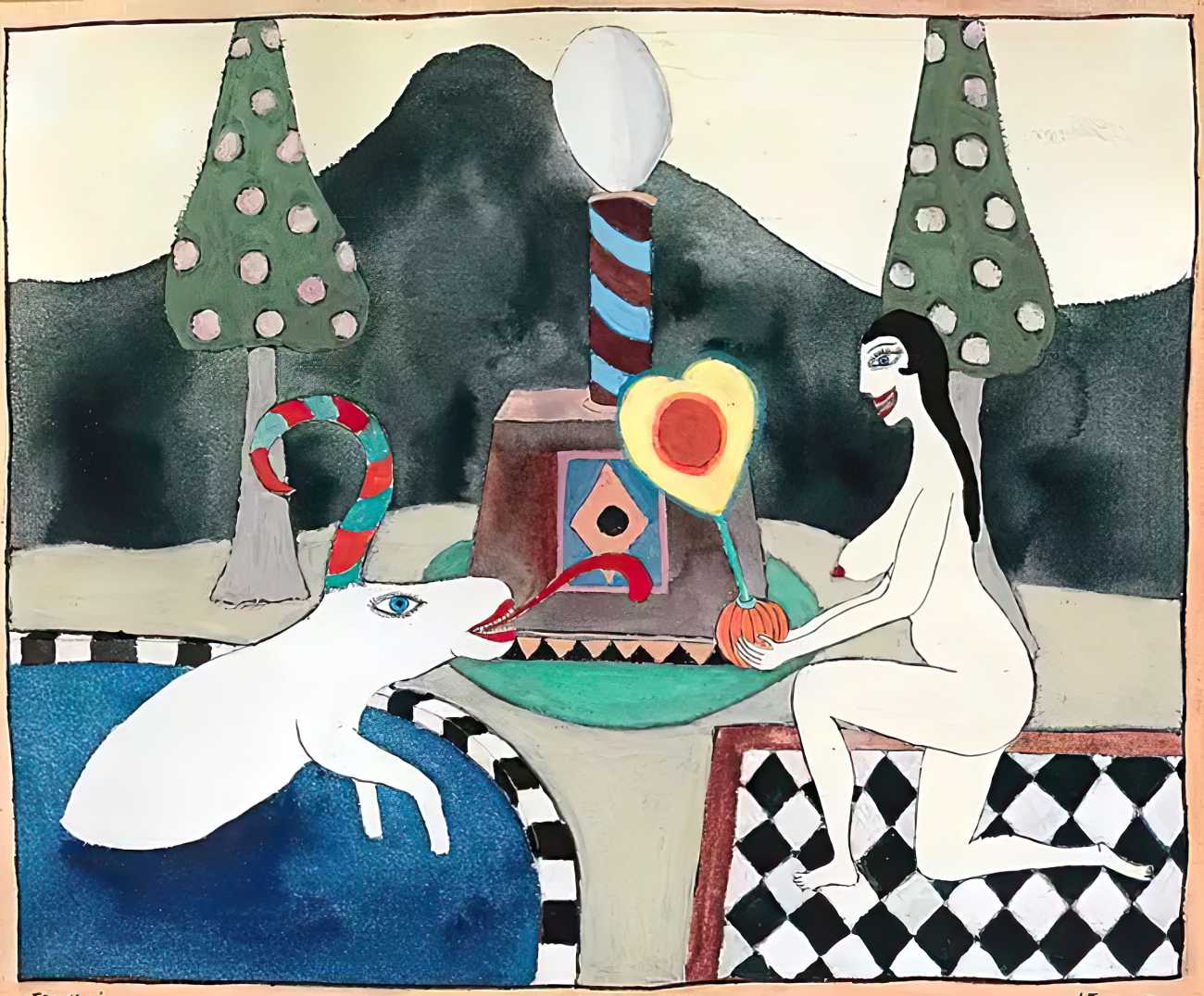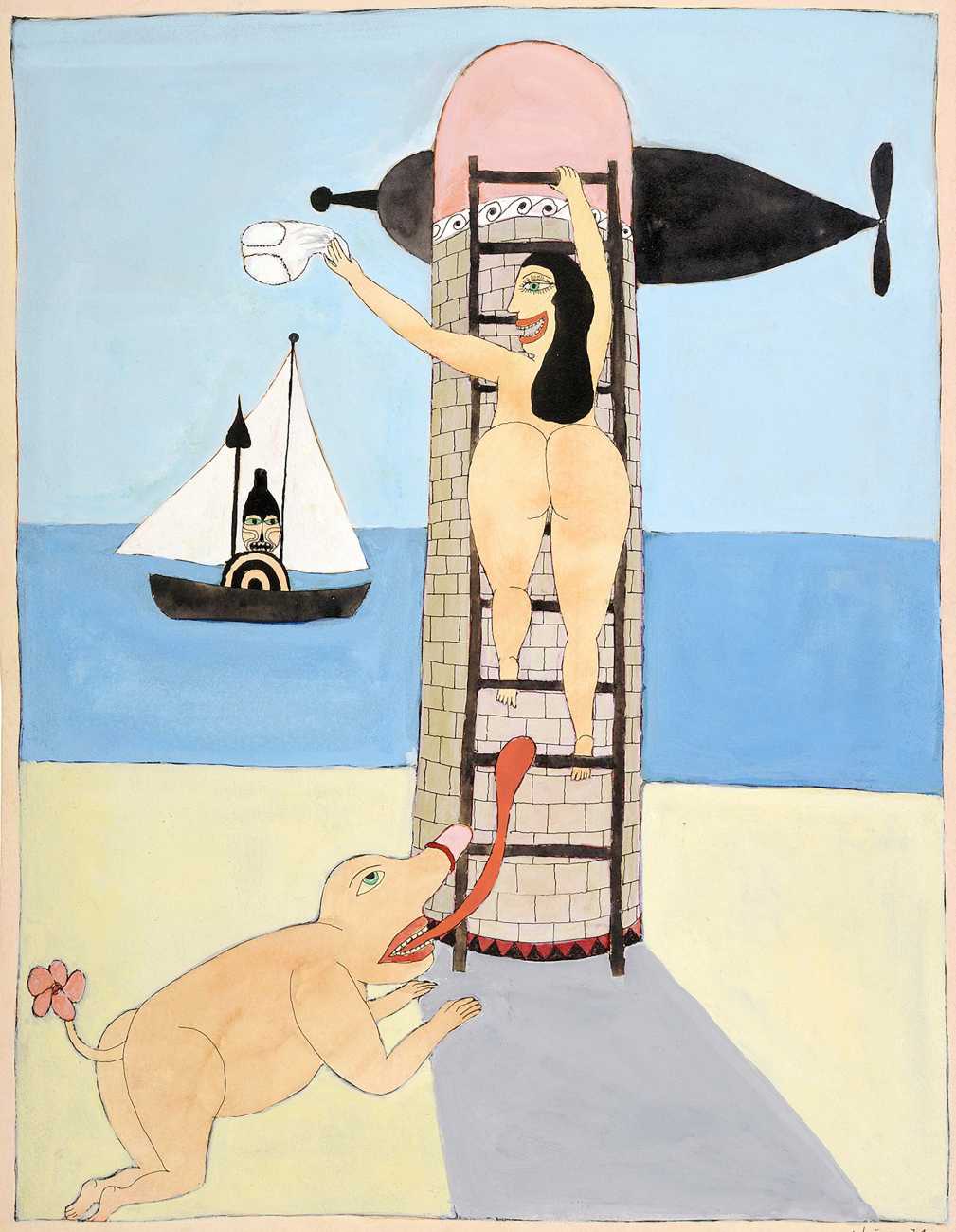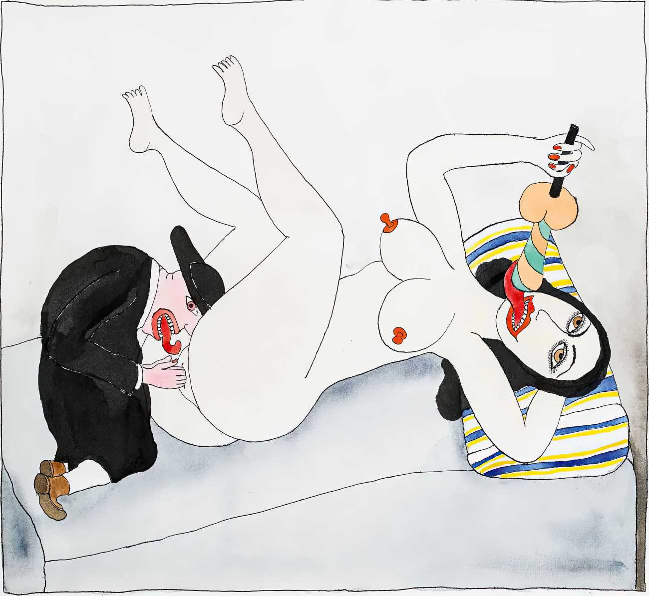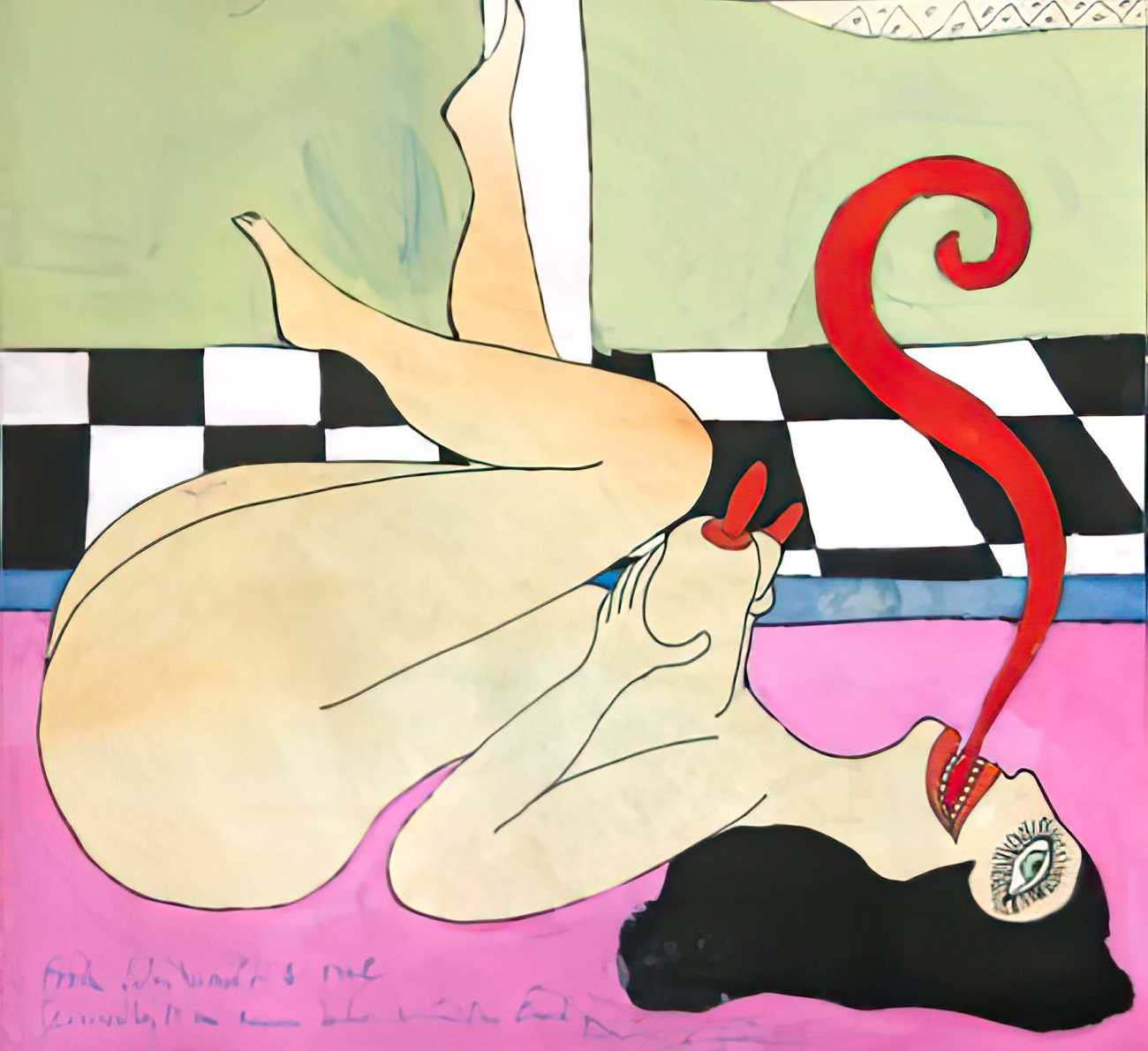 His women embrace phallic structures and receive pleasure from creepy grinning animals, bizarre contraptions, and the ubiquitous red-nosed little man. The women are commanding, taking charge, and Schärer almost always portrays them larger than the men. Dream-like, blatantly absurd, and thoroughly exhilarating, his watercolours not only celebrate sex, but they appear to do so from a female perspective, where no woman’s fantasies are off-limits.