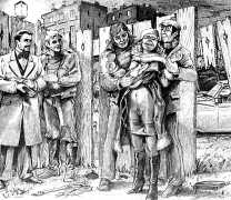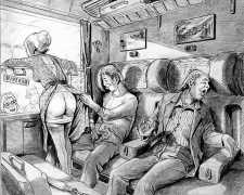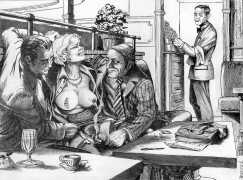 Farrel’s first wife in a short-lived marriage was a whore from Algiers. He accompanied his adoptive father, an engineer, to a construction site. Some of the workers took him to the brothel, which he remembers as being rather like a slaughterhouse. He goes upstairs. The prostitute spreads her thighs, says ‘So you haven’t come to fuck?’ Lying beside him, she waits in the humid heat. We can smell the sweaty odour, see the grey sheets, the water basin, the dirty towel, the tired body, the jaded gaze, the crude makeup. Farrel the illustrator could make a sordid illustration of it, except that at seventeen he doesn’t have the sadistic confidence of his male characters. He is terrified, runs away. Farrel concludes this memory asking, ‘Is this what love is?’ Awkwardly, I ask about his relationship with women, and he replies ‘What do you want to know? For me to tell you about my hatred of my mother?’