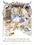 In this cycle of fourteen linked poems, ‘ardent Elodie’ and her friend Martine appear first very innocently on a swing in the orchard, but as their farmyard experience expands to an awareness of eligible farmhand Jean-Louis so the clothes gradually become detached from the nubile bodies. Carlègle’s pastel illustrations are a perfect match for Royer’s text.
