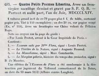 Louis Protat (1819–81) was a minor French poet whose main claim to fame was a verse collection entitled Examen de Flora, à l’effet d’obtenir son diplôme de putain (The Examination of Flora, for the Purpose of Obtaining Her Prostitute’s Diploma), which had the misfortune to be banned and condemned by judgement of the Tribunal Correctionnel de la Seine in 1852. That didn’t prevent it being clandestinely reissued in 1864 with a suitably ‘sacriligious’ frontispiece by Félicien Rops.