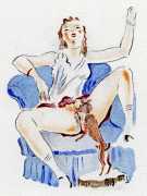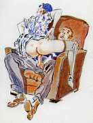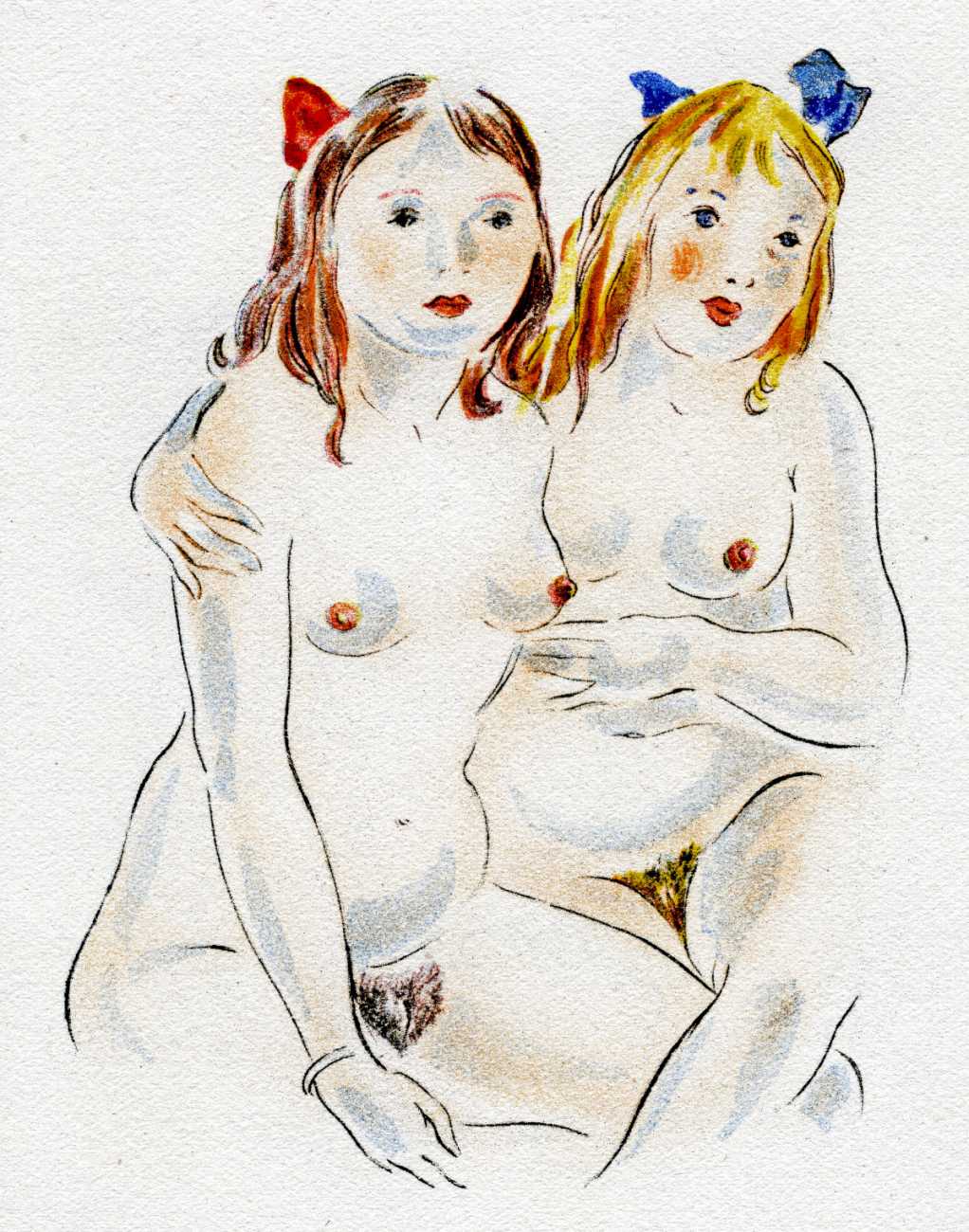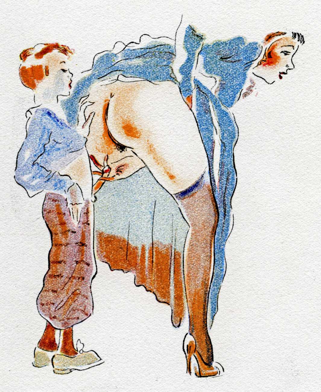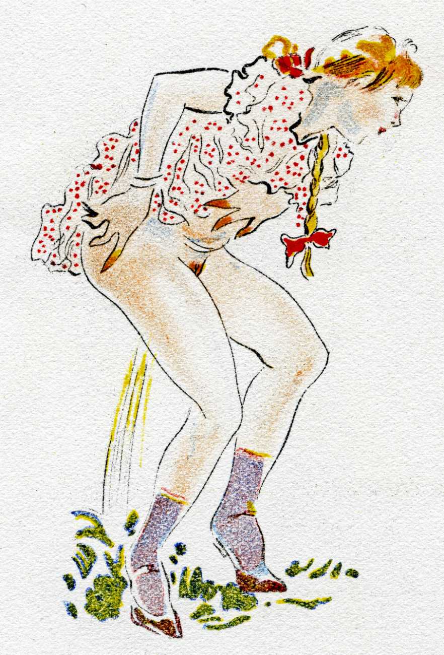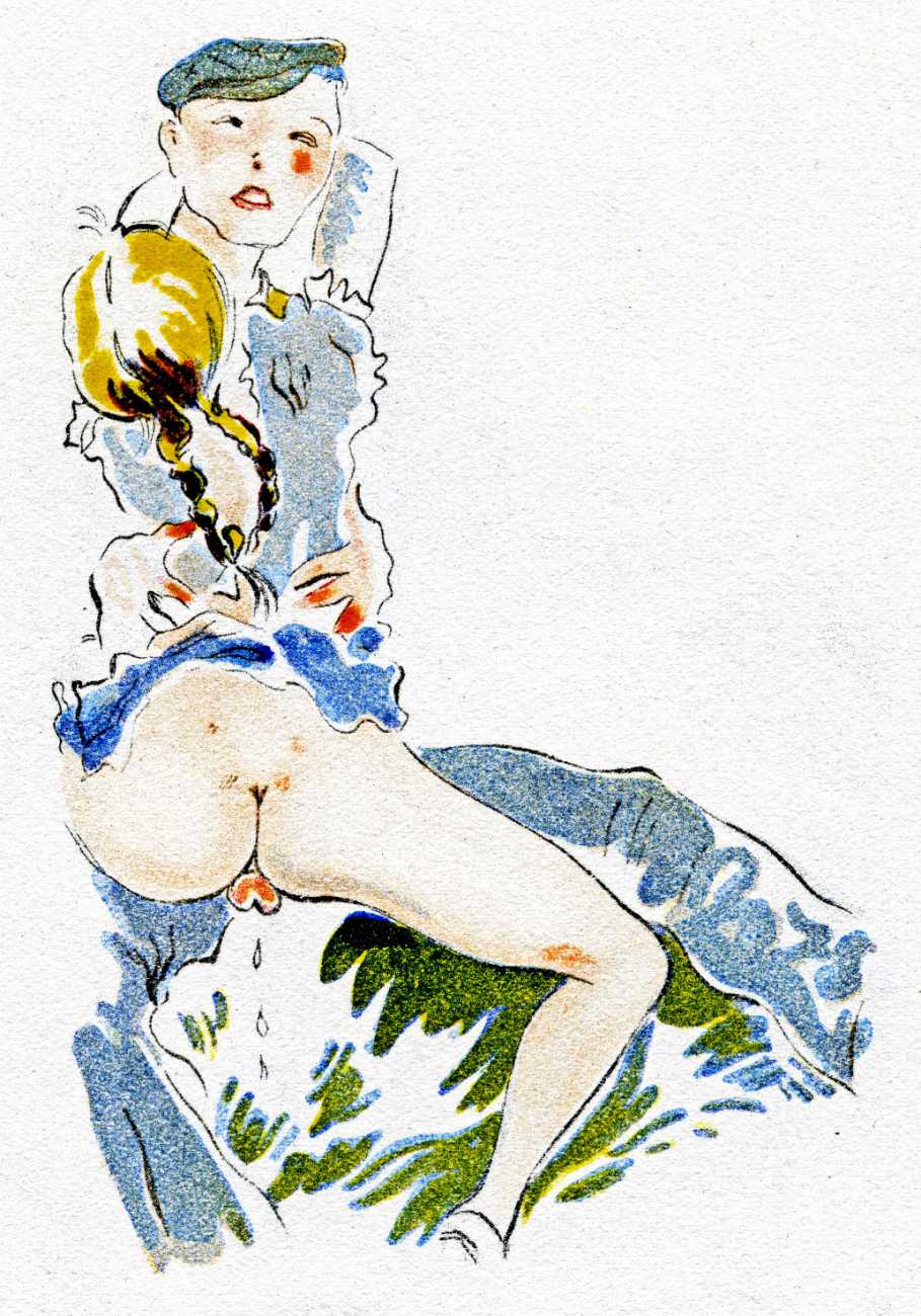Irving and Polly Allen, Feodor Rojankovsky’s biographers, believe that his illustrations for Dévergondages were produced at the time the novel was first published, rather than soon before his illustrated version appeared in 1948; it is hard to tell. They have a maturity about them where much of the earlier work has a freer quality, but maybe they do date from before Rojan sailed for America in 1941. We shall never know.