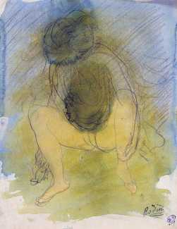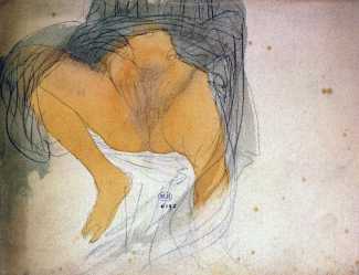 Some drawings lie at the far edge of eroticism and formalism. In one the immodest clarity of the genitals and spread thighs is emphasised by veiling the rest of the body with hatchings and a green wash. In another the strong contrast between the orange dress pulled up around the hips and the pale buttocks and legs, one form enclosing another, does not distract attention from the genitals, which are discreetly drawn in graphite but positioned in the centre of the image. The same is true of a third, where the woman’s presence is reduced to her genitals held open with both hands: the emphasis is triple – open dress, open legs, open genitals – but Rodin plays on the tension between the inverted forms of the thighs that spread upward and the dress that comes down over them, accentuating it by the contrast between grey and the colour of flesh.