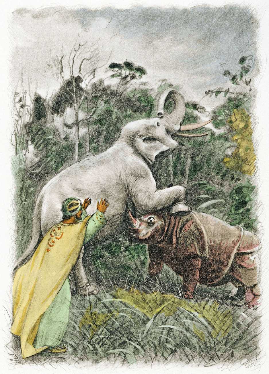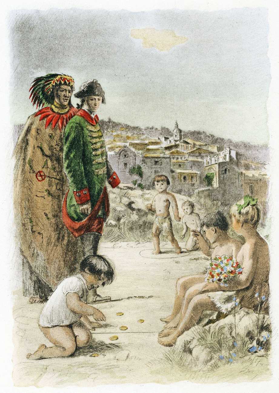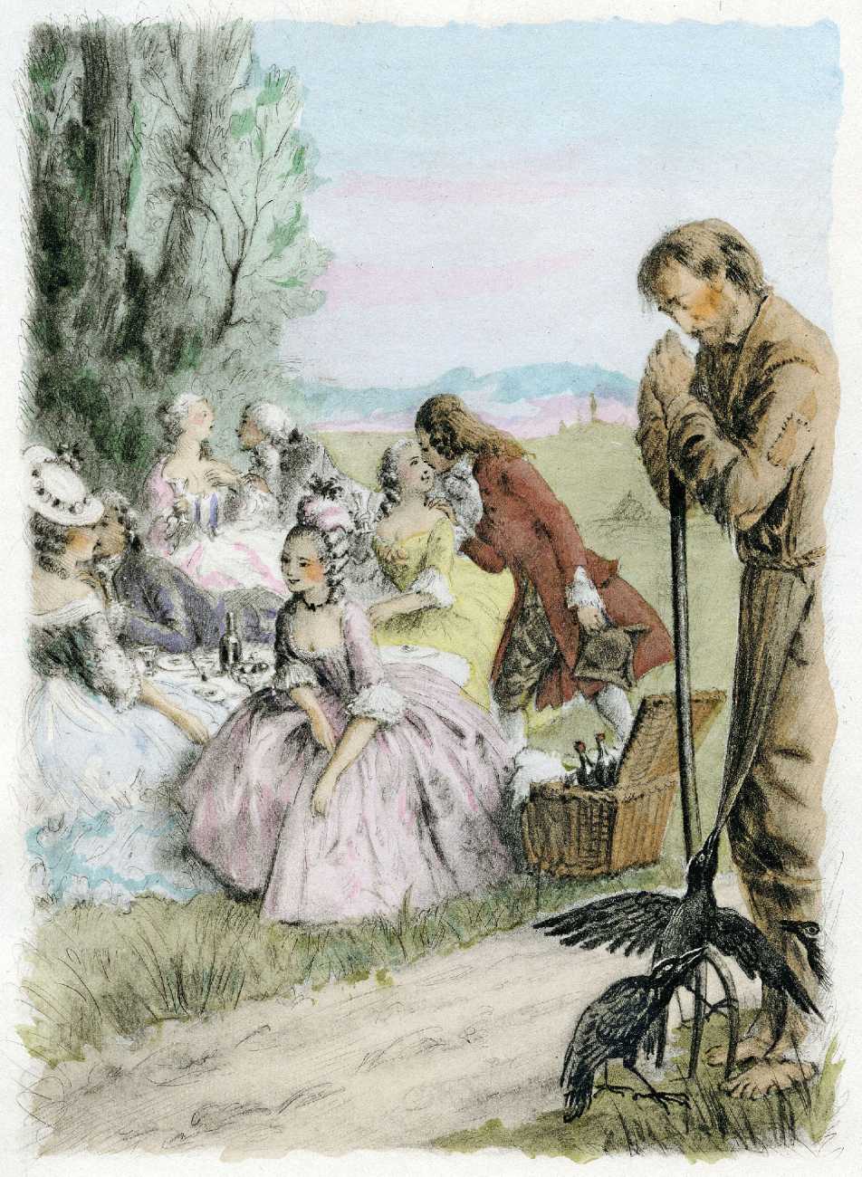 It was virtually inevitable that at some point Bécat would be commissioned to illustrate the best-known and widely-read French writer of the eighteenth century, and this five-volume collection of Voltaire’s works includes all of his most famous stories and novels – Candide (1759), Zadig (1747), Micromégas (1738), Le taureau blanc (1774), La princesse de Babylone (1768), Lettres d’Amabed (1769), L’ingenu (1767), Le blanc et le noir (1764), and L’homme aux quarante écus (1768).