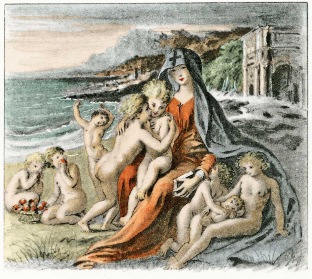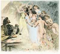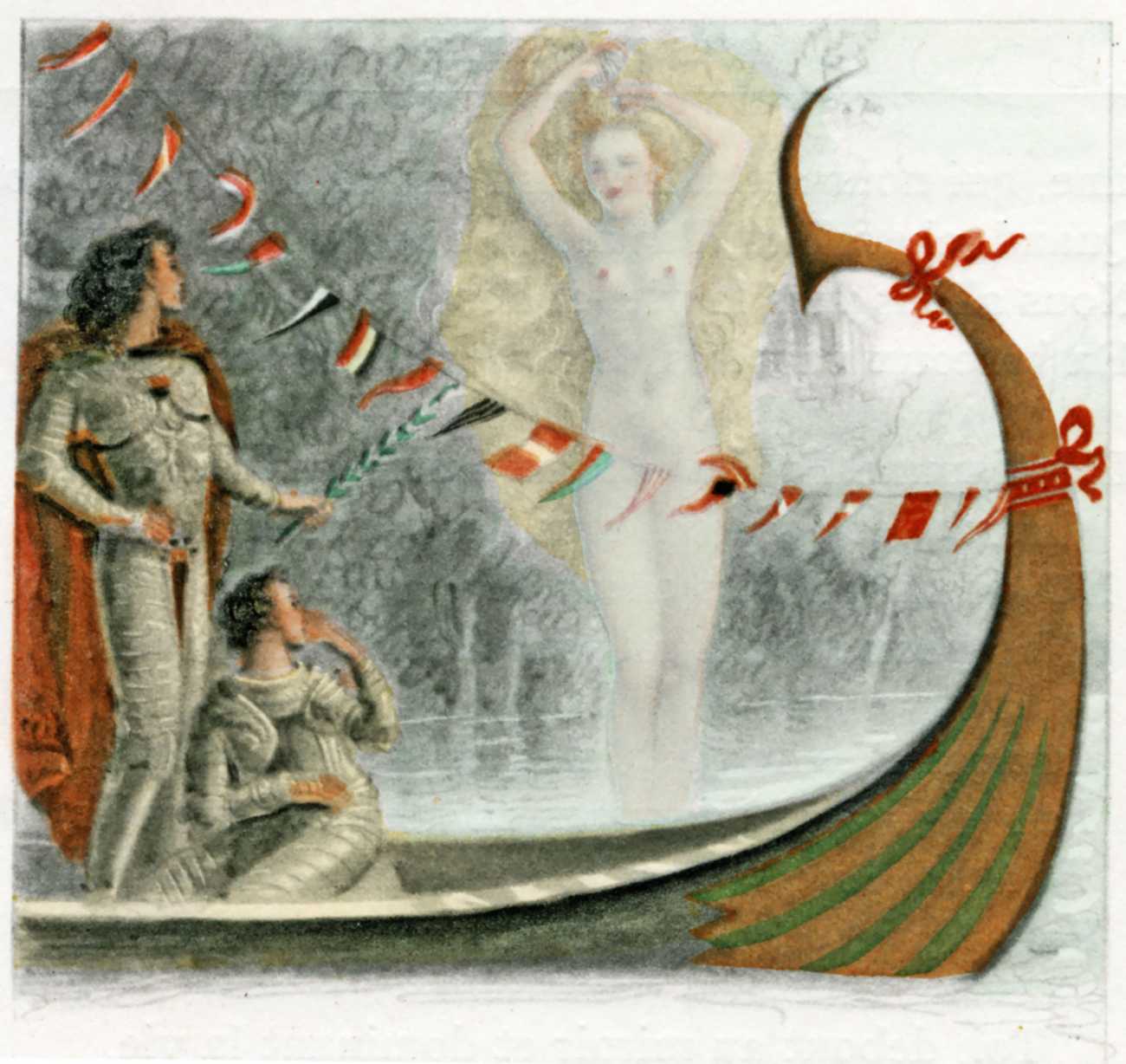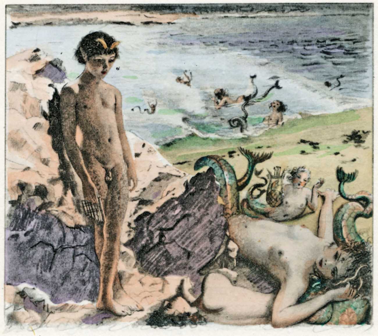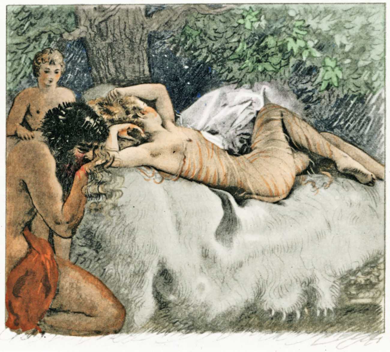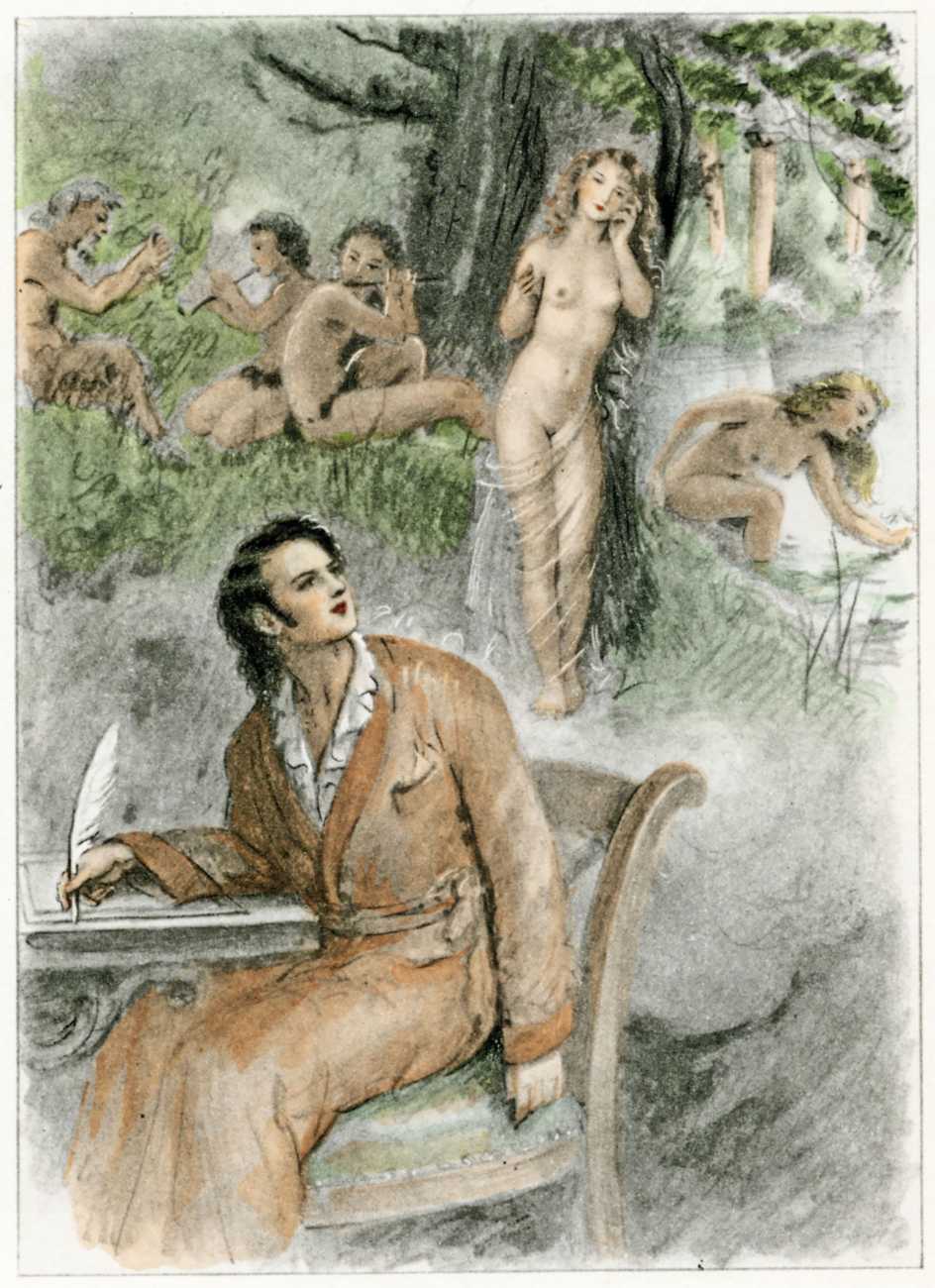 This illustrated three-volume set of Samain’s works is one of the most attractive, including the expanded Au jardin d’infante, Le chariot d’or (The Golden Chariot),Symphonie héroíque, Aux flanc du vase (On the Side of a Vase), Poèmes inachevés (Unfinished Poems), and the play Polyphème. Published by the prestigious Paris publisher H. Piazza, the elegant design and typography is somewhat let down by the poor colour reproduction of the sixty Bécat illustrations accompanying Samain’s text, but it still gives us a clear visual sense of the poet’s artistic sensuality, with every opportunity taken to introduce naked flesh into as many images as possible.