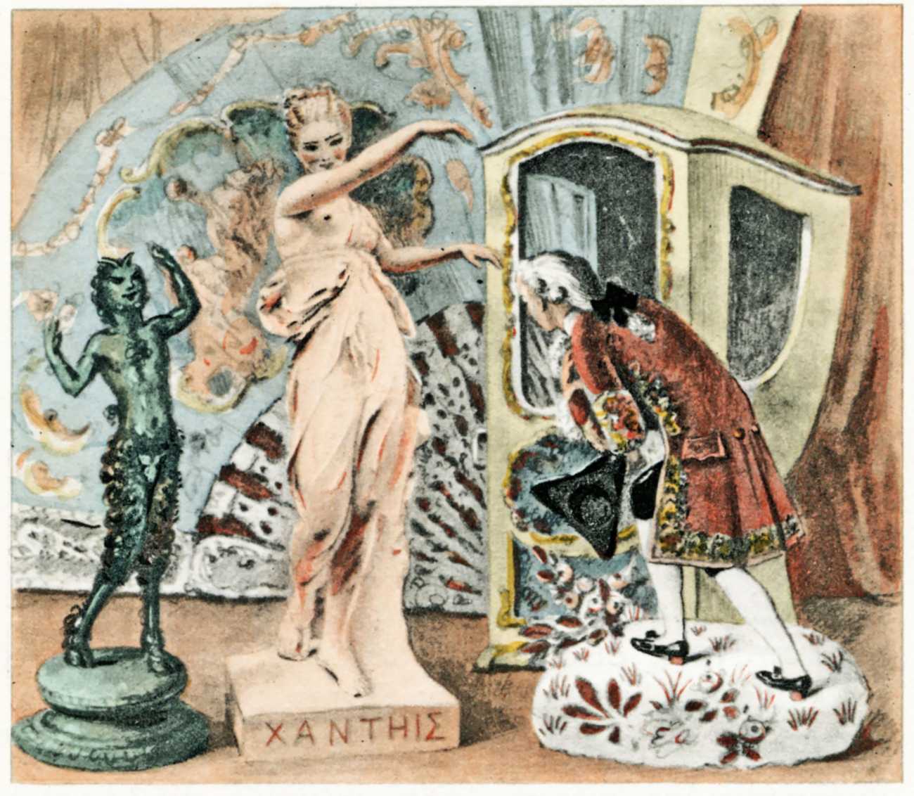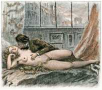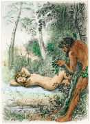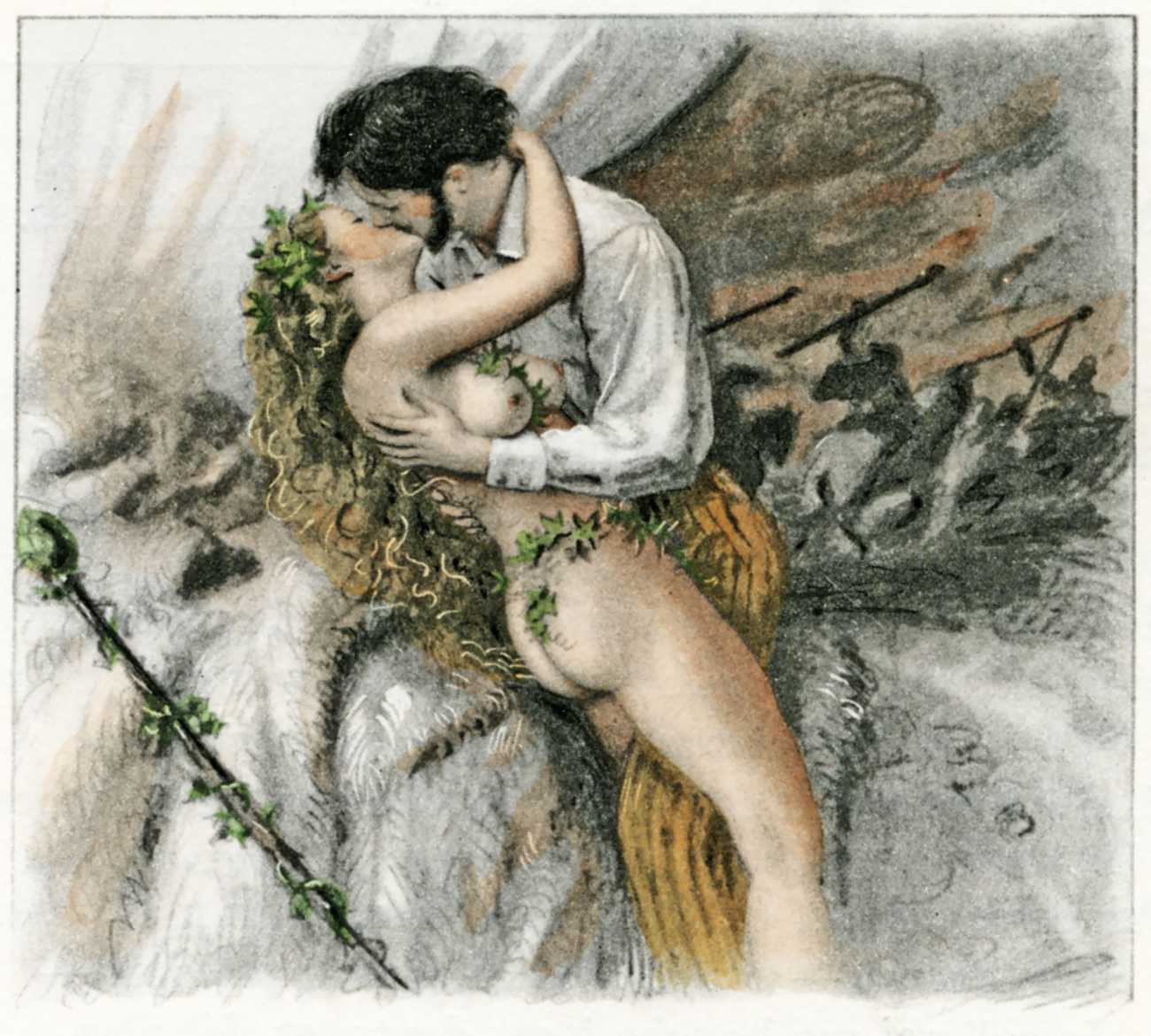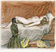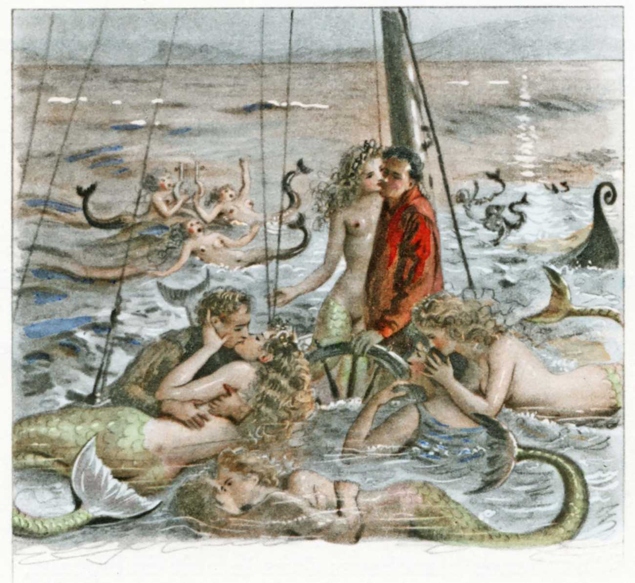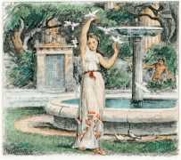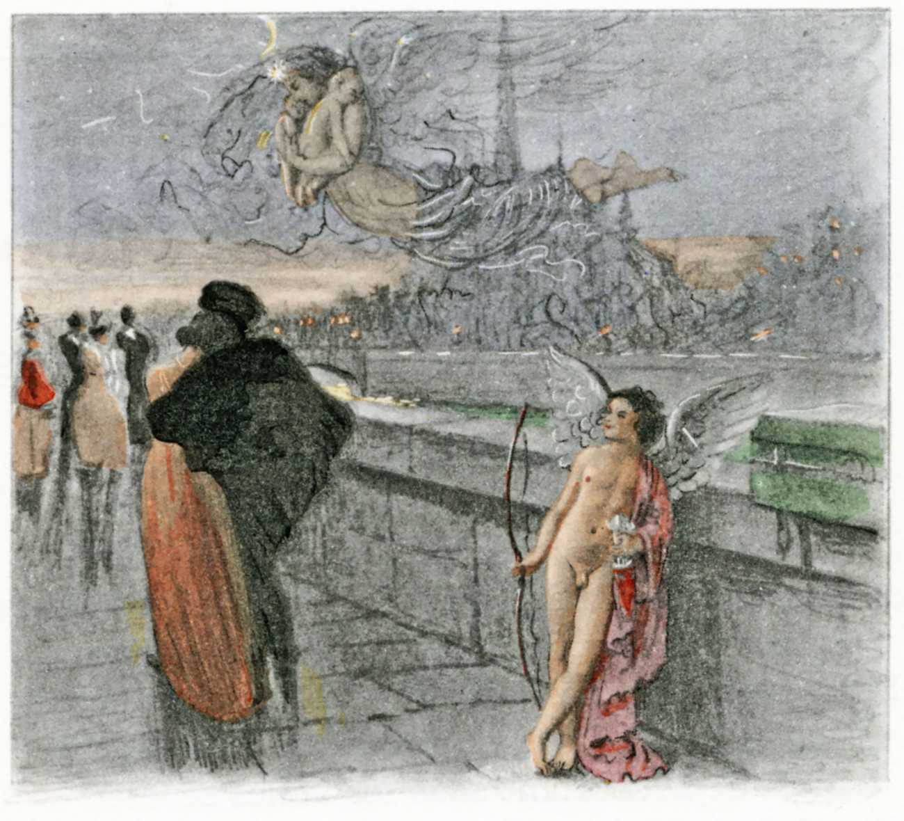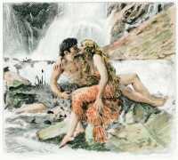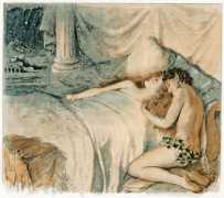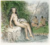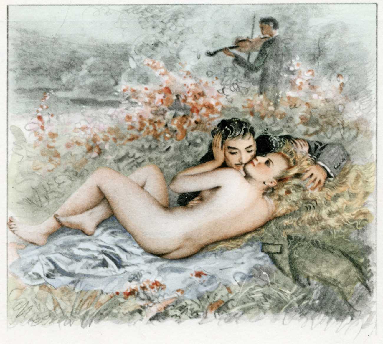 This illustrated three-volume set of Samain’s works is one of the most attractive, including the expanded Au jardin d’infante, Le chariot d’or (The Golden Chariot),Symphonie héroíque, Aux flanc du vase (On the Side of a Vase), Poèmes inachevés (Unfinished Poems), and the play Polyphème. Published by the prestigious Paris publisher H. Piazza, the elegant design and typography is somewhat let down by the poor colour reproduction of the sixty Bécat illustrations accompanying Samain’s text, but it still gives us a clear visual sense of the poet’s artistic sensuality, with every opportunity taken to introduce naked flesh into as many images as possible.