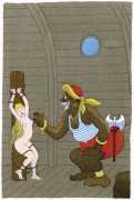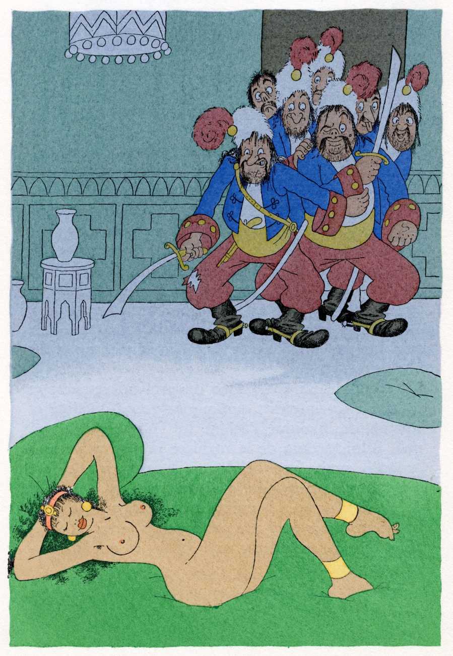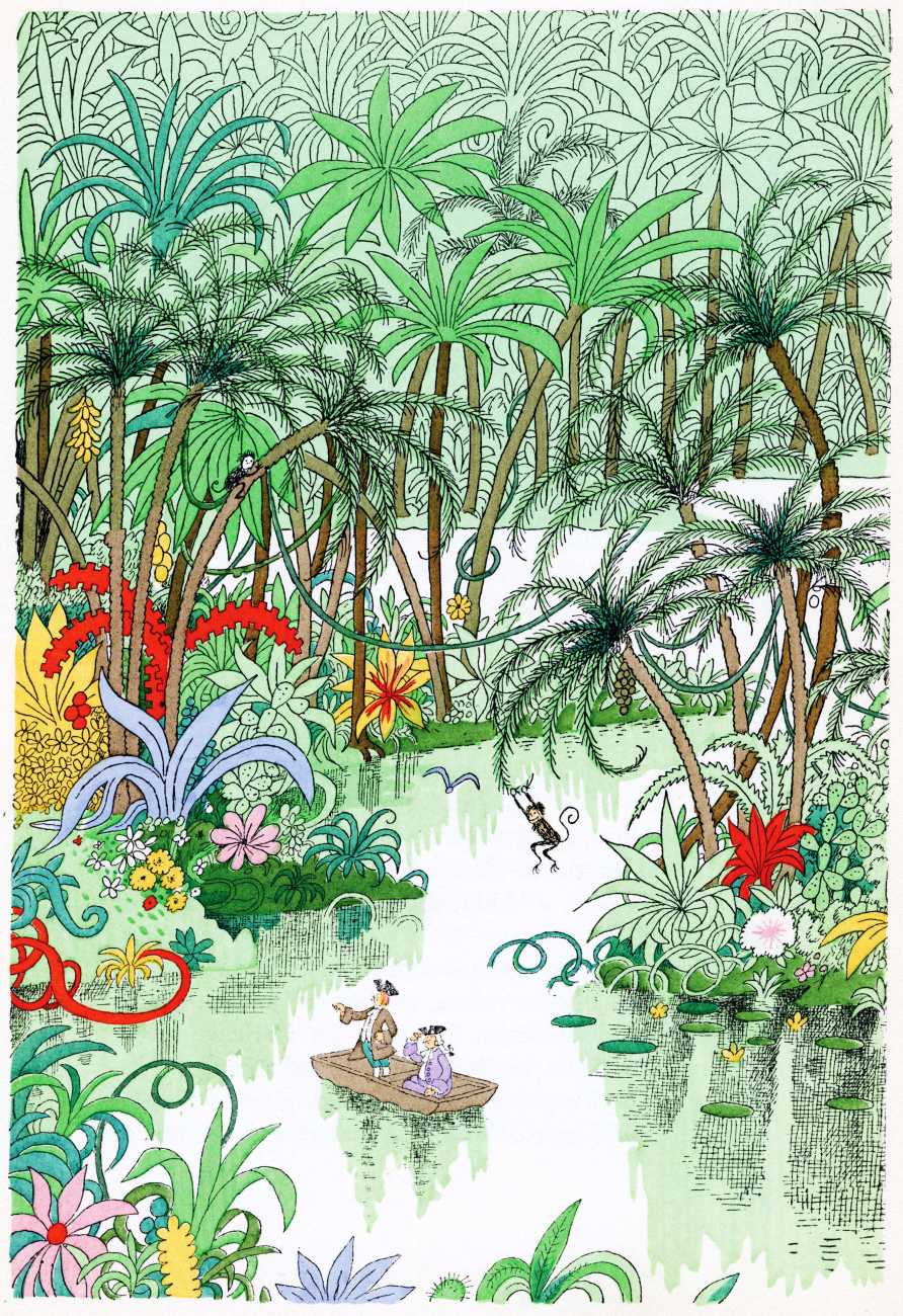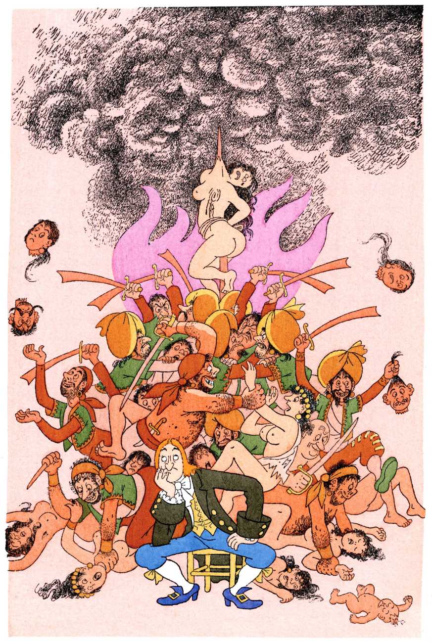 For this 1957 edition Albert Dubout’s illustration style is perfect, from the frontispiece of the beautiful Cunégond, through the Madrid earthquake and the jungle of South America, to memorable scenes of dismembering and buttock-eating. They bring a colourful text to appropriately witty life.