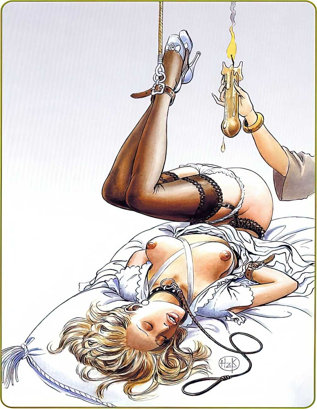 After Hilda and Diane de Grand Lieu, the full-colour Kovacq album Beautés dociles (Docile Beauties), published a year after Bernard Dufossé’s death, is rather a disappointment. It is really just a compilation of the titillating full-colour cover illustrations from his more experimental work, and the introduction – which though ostensibly by him is almost certainly not – excuses the ‘pin-ups’ as ‘what pleases all his readers’.