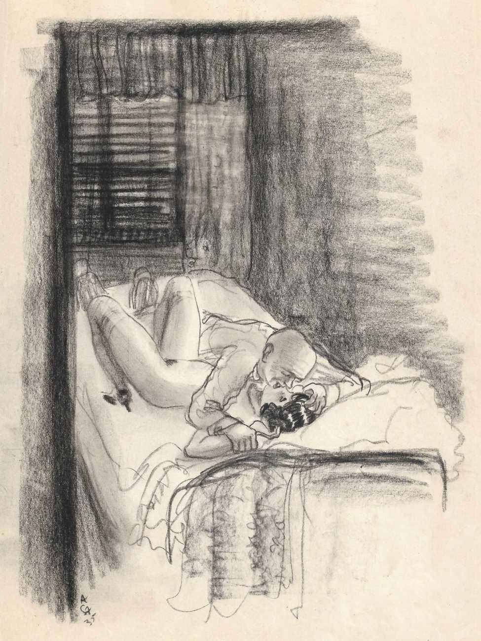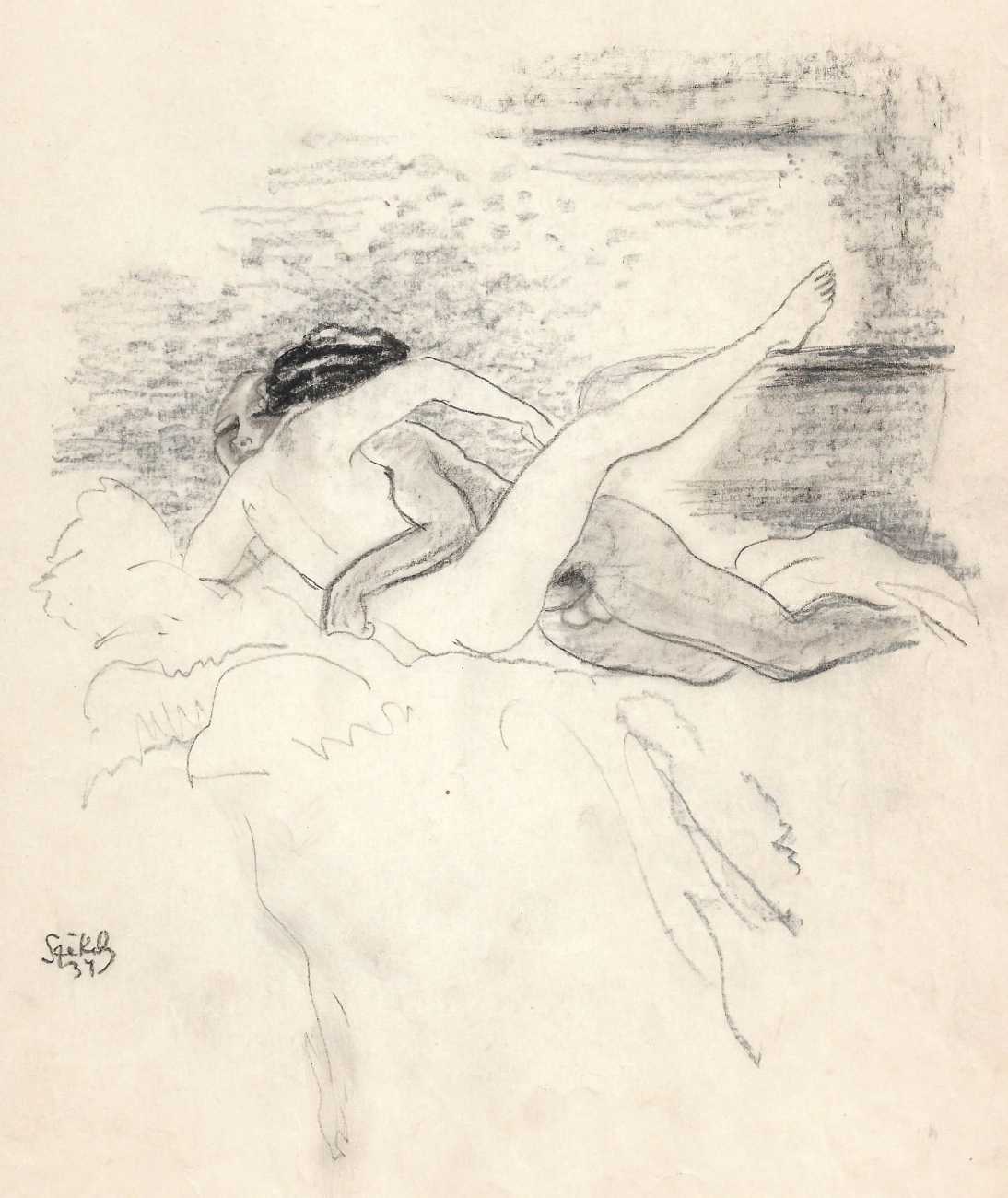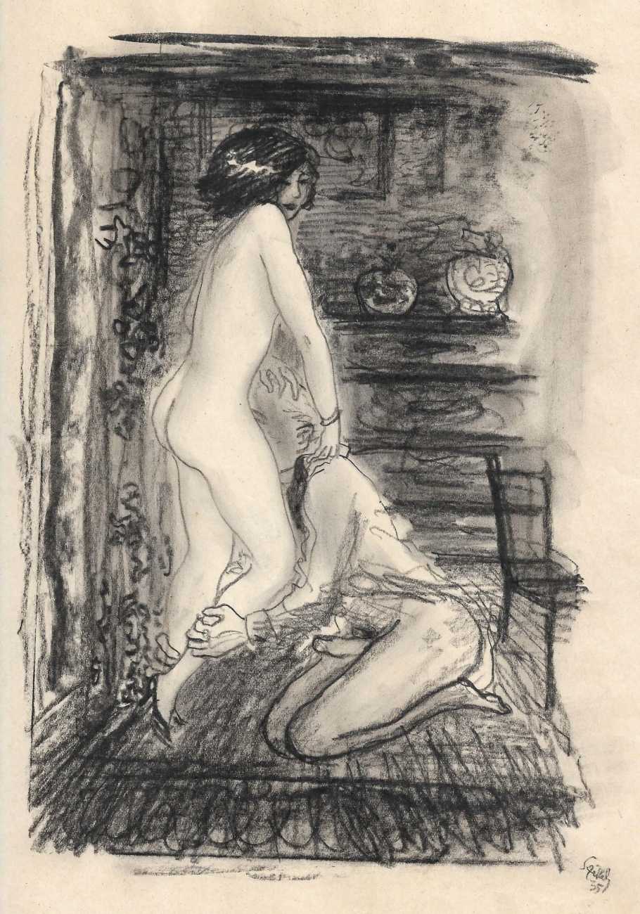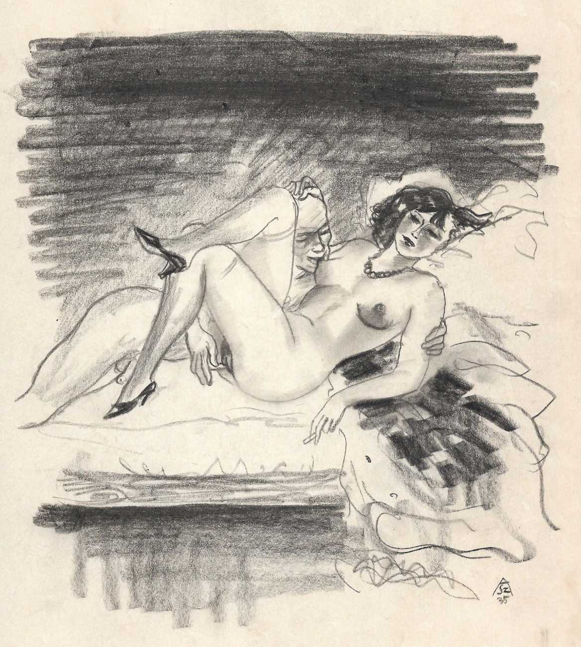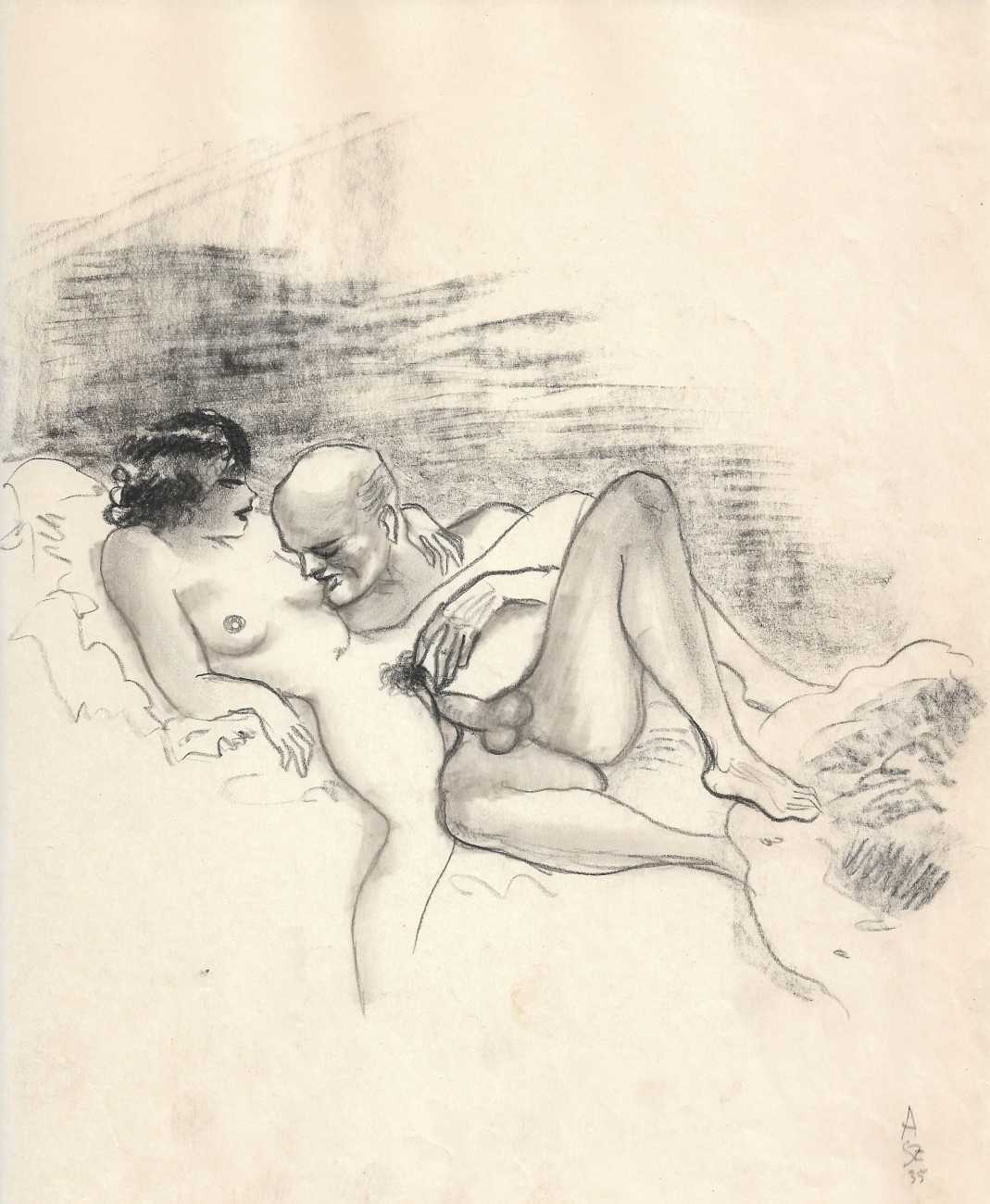 The story is familiar, repeated by Szekely in Ein Pariser Abenteuer (1941) and by Rojan in Idylle printanière (1936) – an unexpected but rather delicious encounter with a young women who, to the artist’s surprised delight, is more than willing to explore the depths and breadths of shared intimacy. To what extent the narrative is in any way autobiographical is left to the viewer’s imagination.