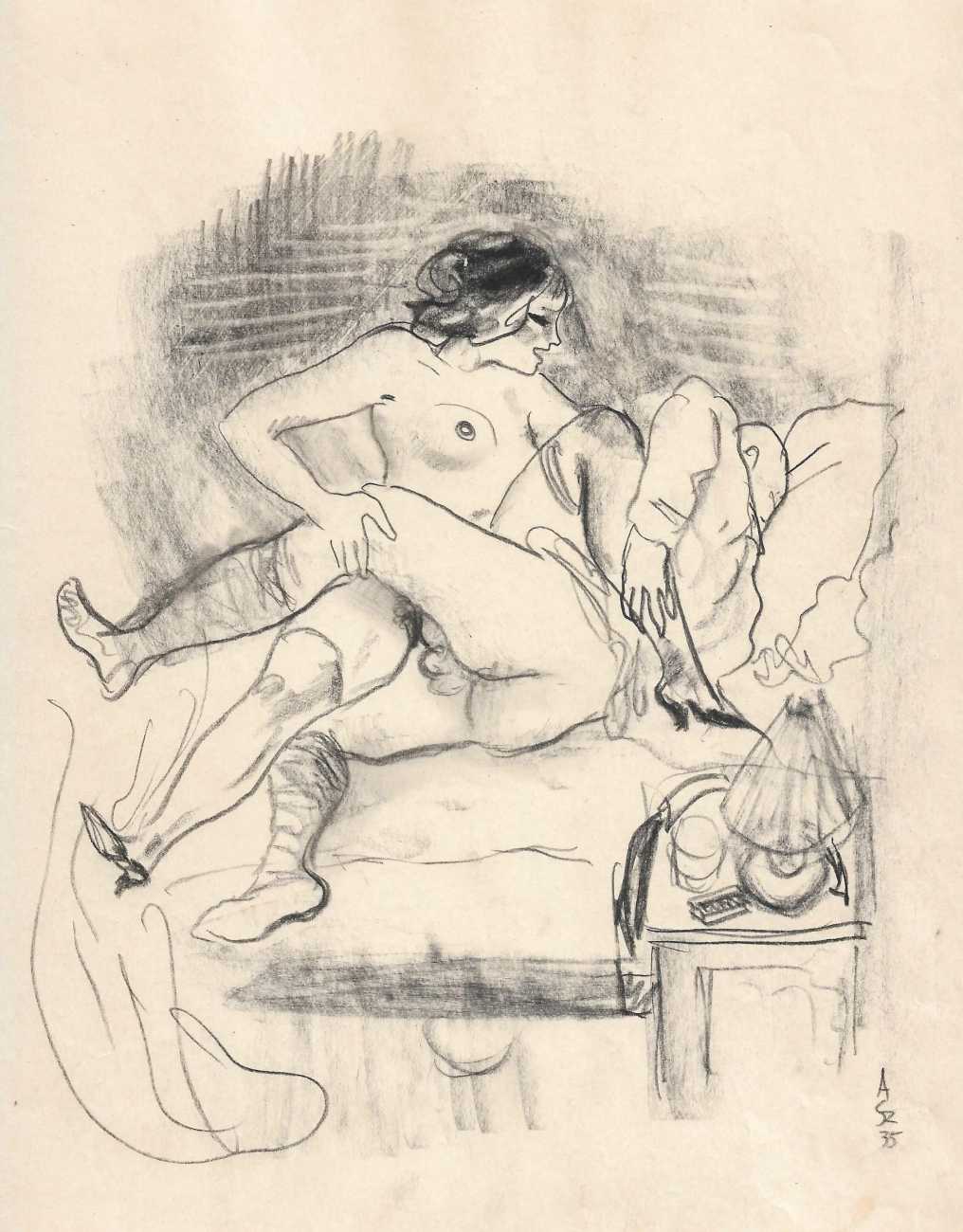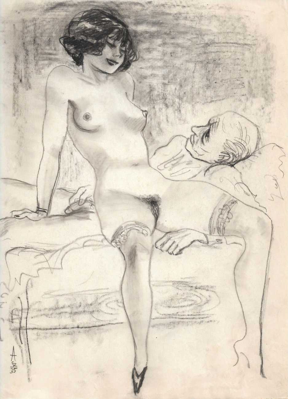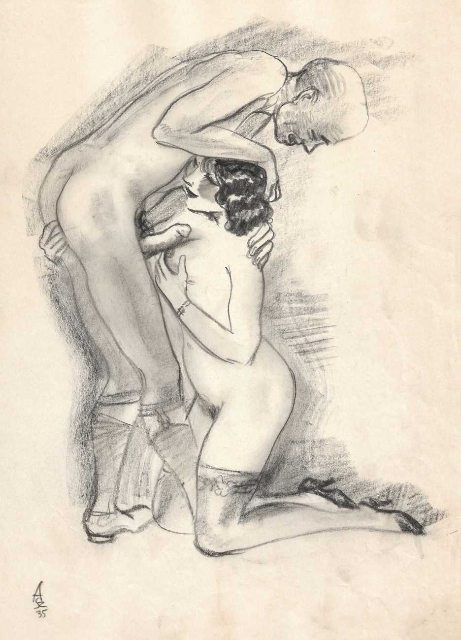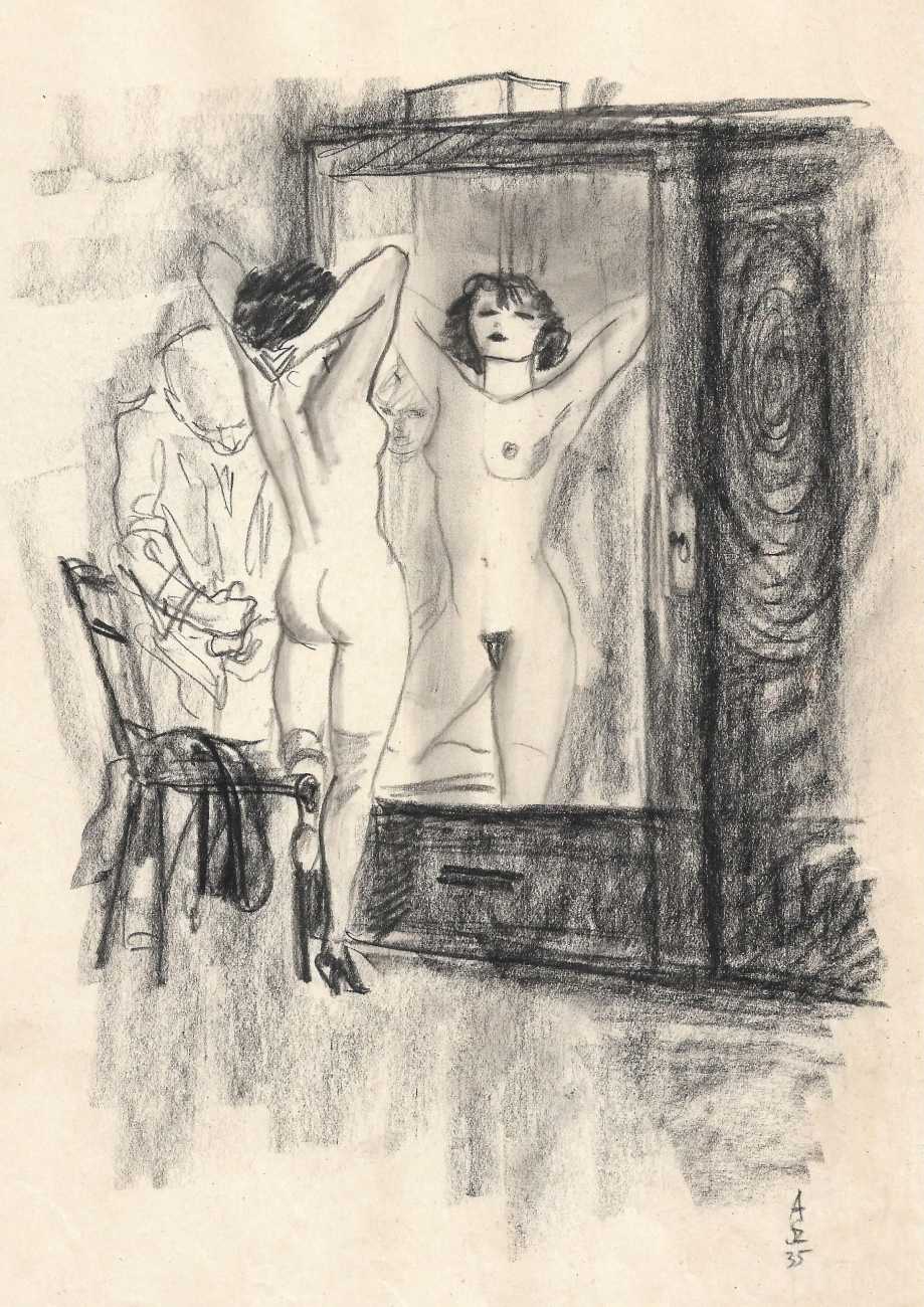 The story is familiar, repeated by Szekely in Ein Pariser Abenteuer (1941) and by Rojan in Idylle printanière (1936) – an unexpected but rather delicious encounter with a young women who, to the artist’s surprised delight, is more than willing to explore the depths and breadths of shared intimacy. To what extent the narrative is in any way autobiographical is left to the viewer’s imagination.
