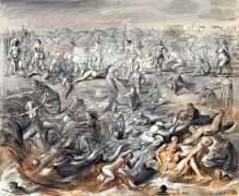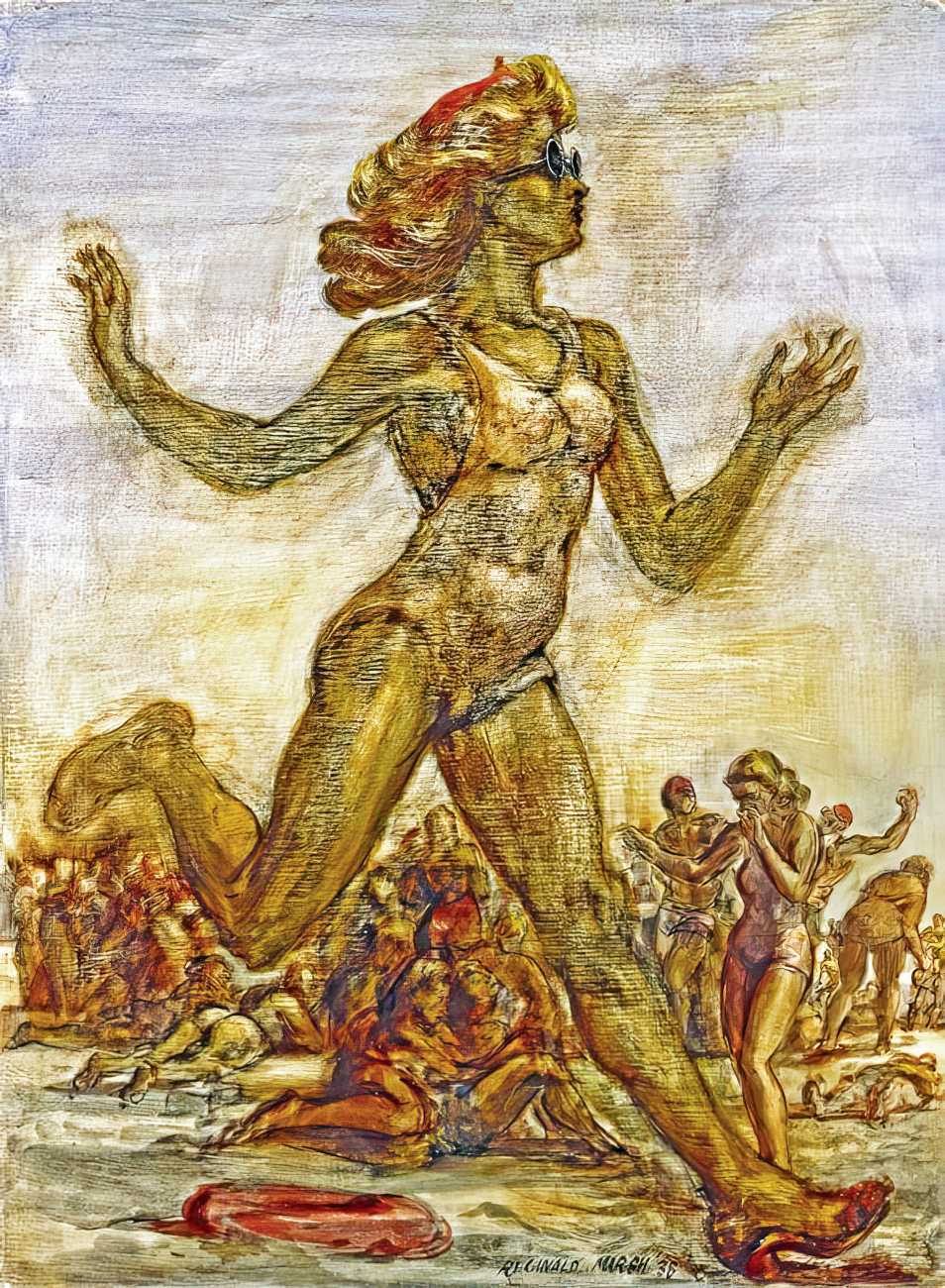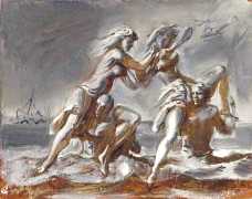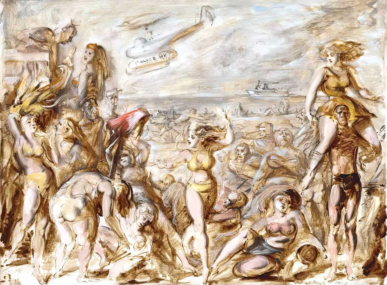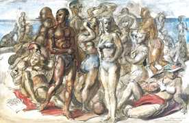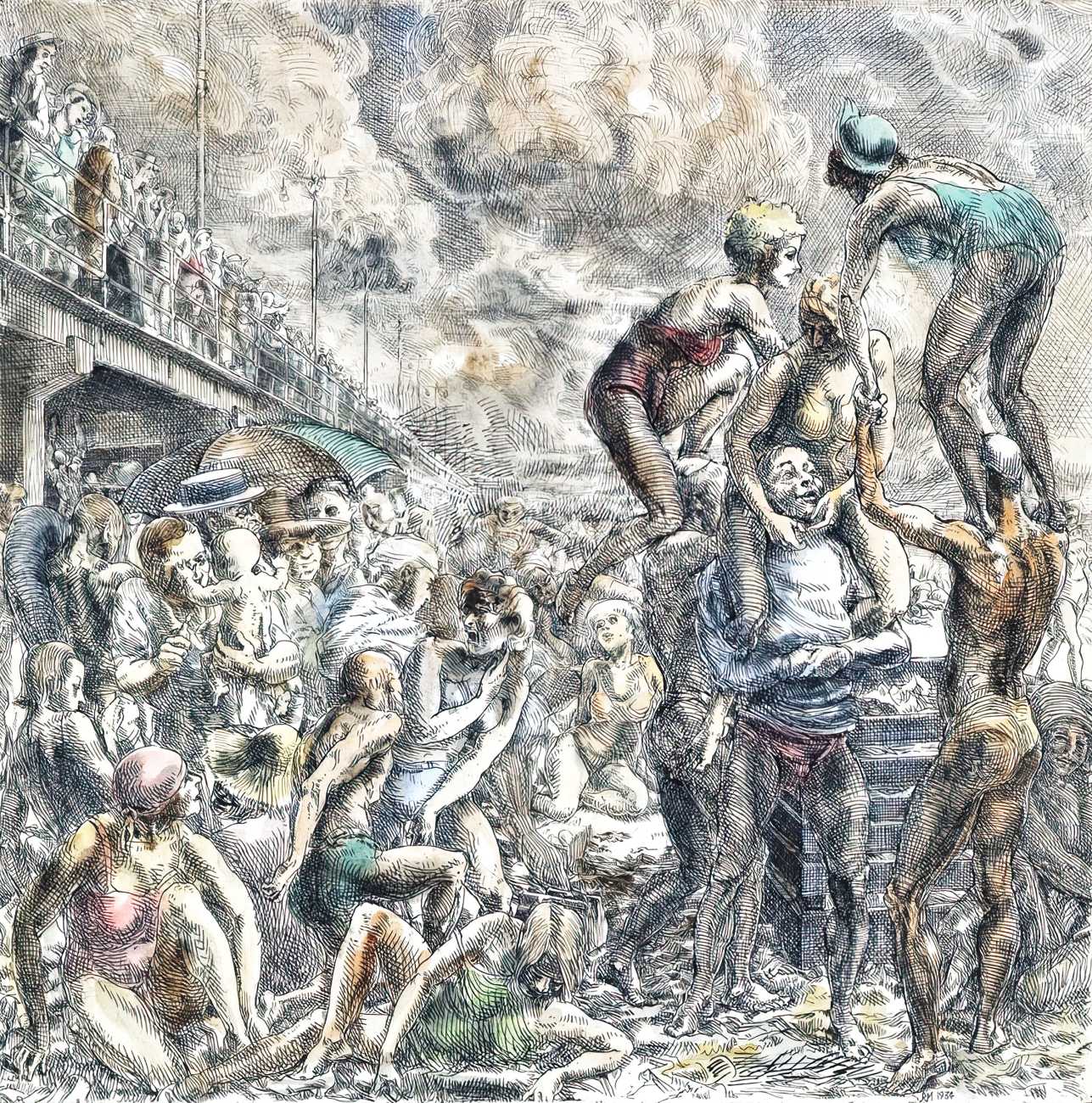 Marsh loved to venture to the popular New York beach resort of Coney Island to draw and paint, especially in the summer. There he began to create works depicting massed beached bodies, emphasising the bold muscles and build of his characters, emulating the heroic scale of the older European paintings. As he explained, ‘I like to go to Coney Island because of the sea, the open air, and the crowds – crowds of people in all directions, in all positions, with and without clothing, moving, like the great compositions of Michelangelo and Rubens.’
