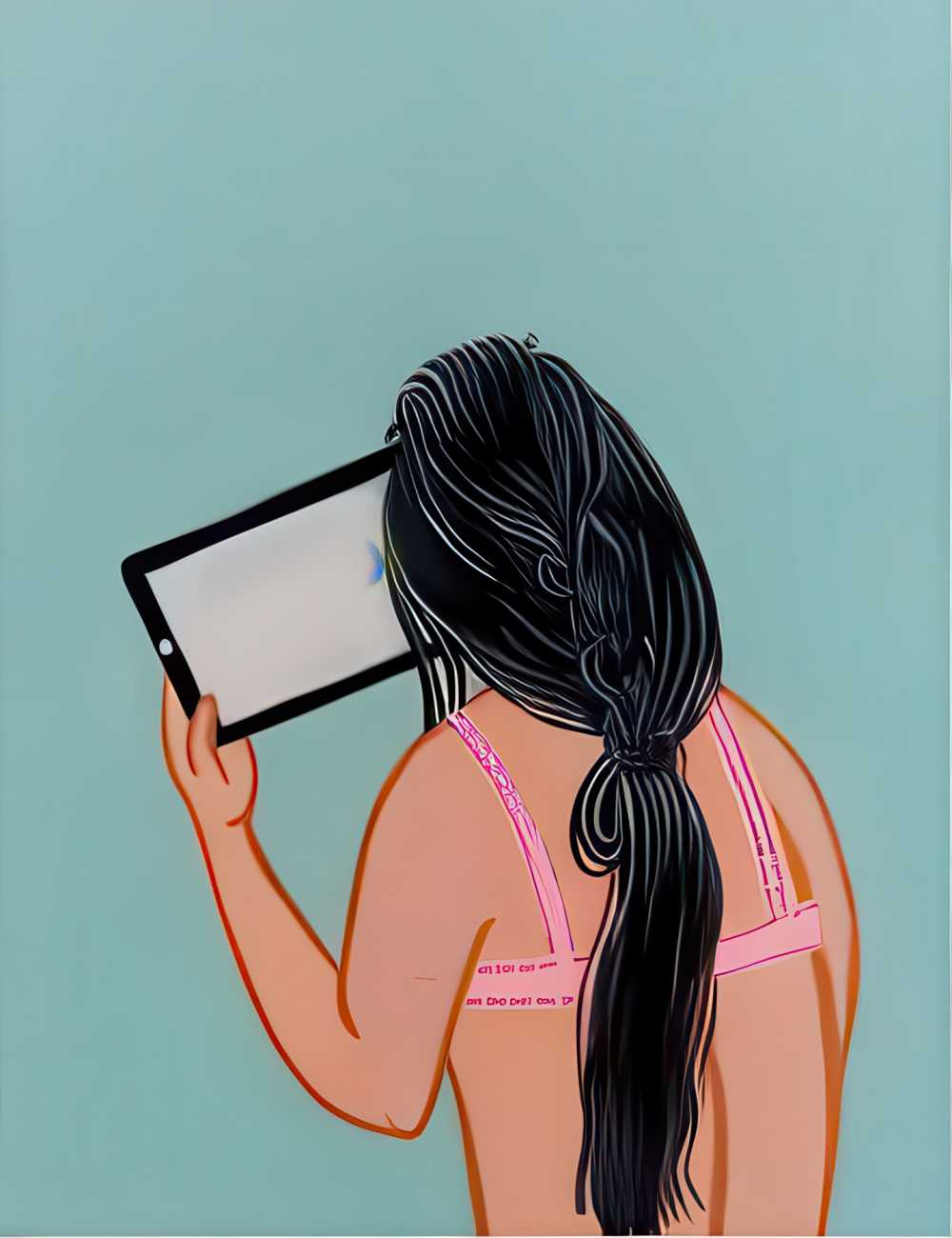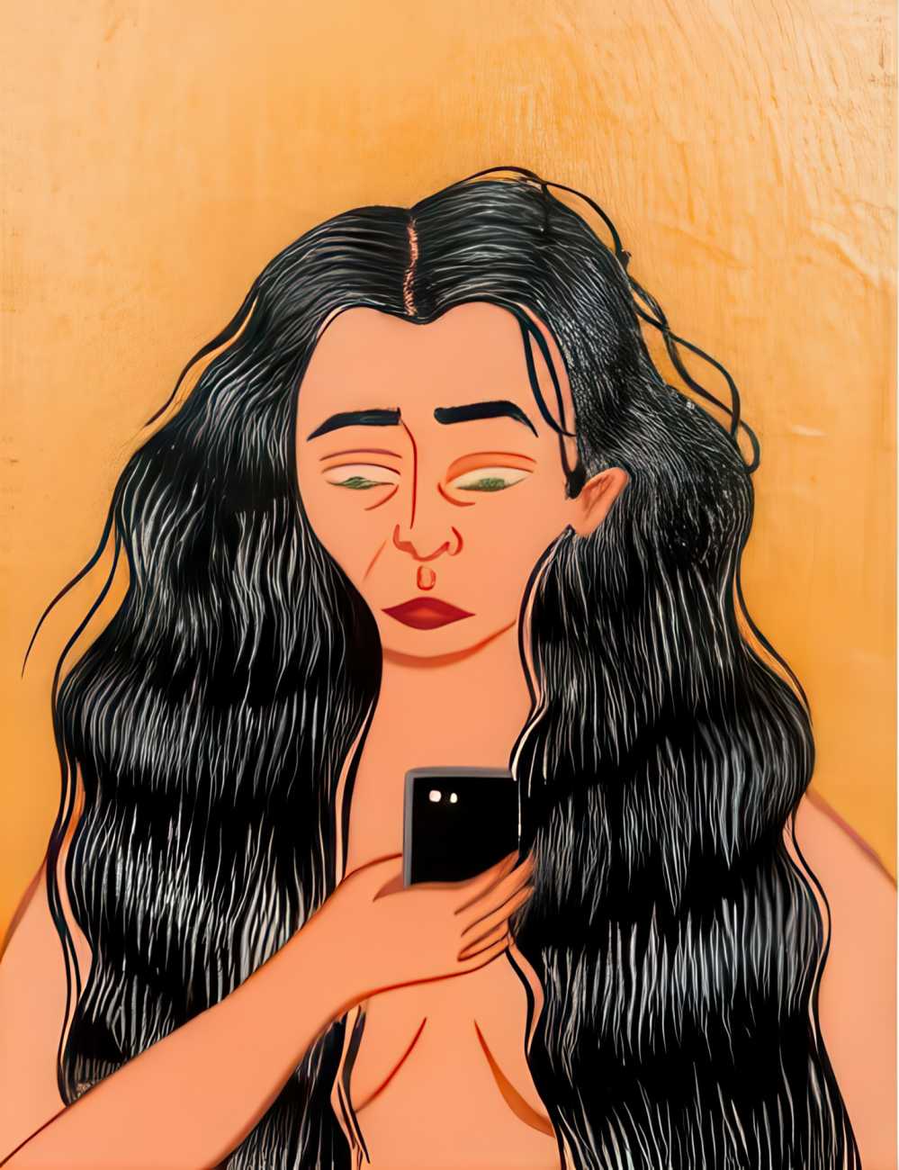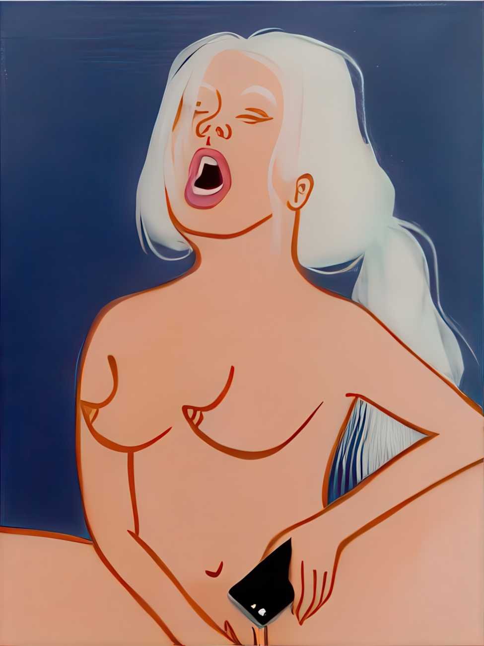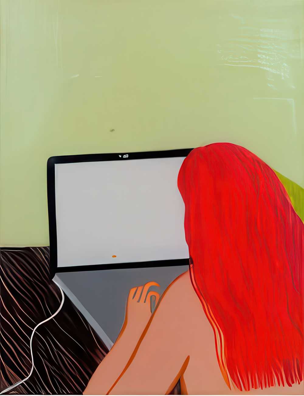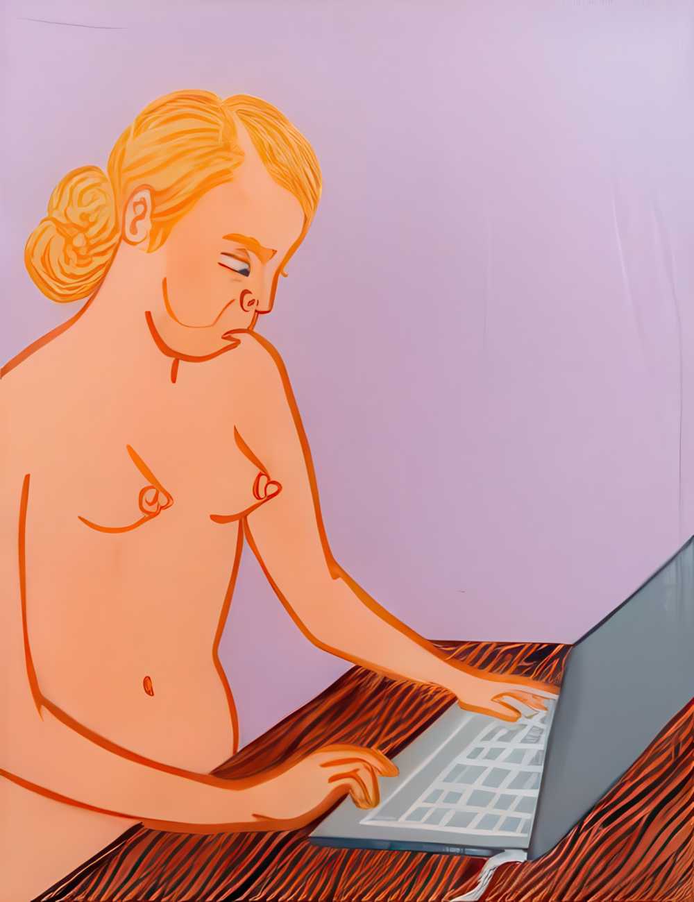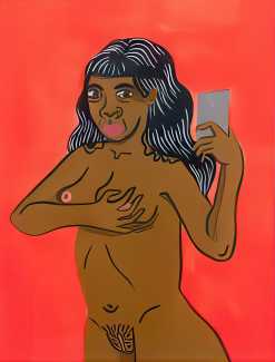 Sylvia Rehbein of the Thomas Rehbein Gallery in Köln (which presented a major exhibition of Dubois’s work in 2020) writes, ‘With a wink, Joëlle Dubois transfers the digital revolution and the resulting role of humans in our modern society into her works. She is especially interested in the voyeuristic aspect of digitalisation. Social media platforms like Instagram, Snapchat and YouTube, television programs like Big Brother, fulfil our desire to observe others anonymously in their suffering – their love life, their successes and failures. Digitalisation has made communication faster, more purposeful and interactive, but it means that less and less privacy is possible, and we present ourselves more openly and more naked to everyone else. Communication becomes increasingly superficial, impersonal and anonymous. Dubois devotes herself with passion to this complex of topics in an ironic and comical way. She depicts her protagonists in an exposed and unadorned manner, steeped in a drastic realism that often turns out distorted in the digital world. By showing hairy chubby women and men in compromising positions, she emphasises her own role as an independent and emancipated woman and artist. Dubois is a silent observer, watching the world in her own display of idiosyncratic perfectionism.’