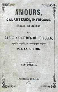 The full title of this late eighteenth century erotic anticlerical diatribe is Amours, galanteries, intrigues, ruses et crimes des Capucins et des religieuses, depuis les temps les plus reculés jusqu’à nos jours (Love affairs, Gallantries, Intrigues, Ruses and Crimes of Capuchin Friars and Nuns, from the Earliest Times to the Present Day). Attributed ‘par un R. Père’ (by a Reverend Father), it presents tales of members of the order of the Capuchin friars and nuns engaging in a wide variety of sexual activities.