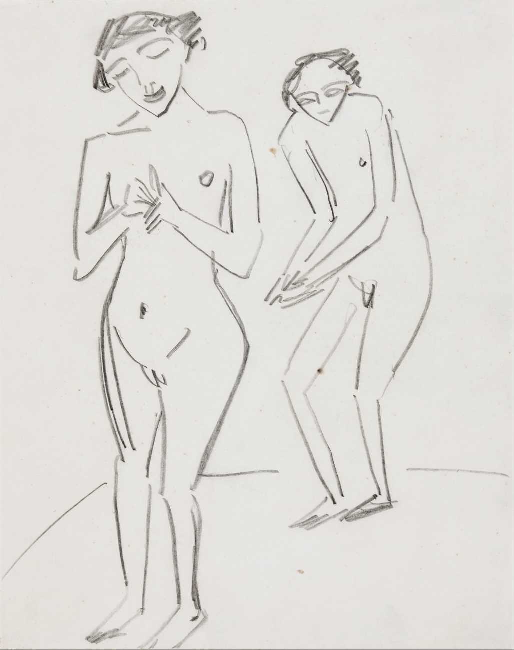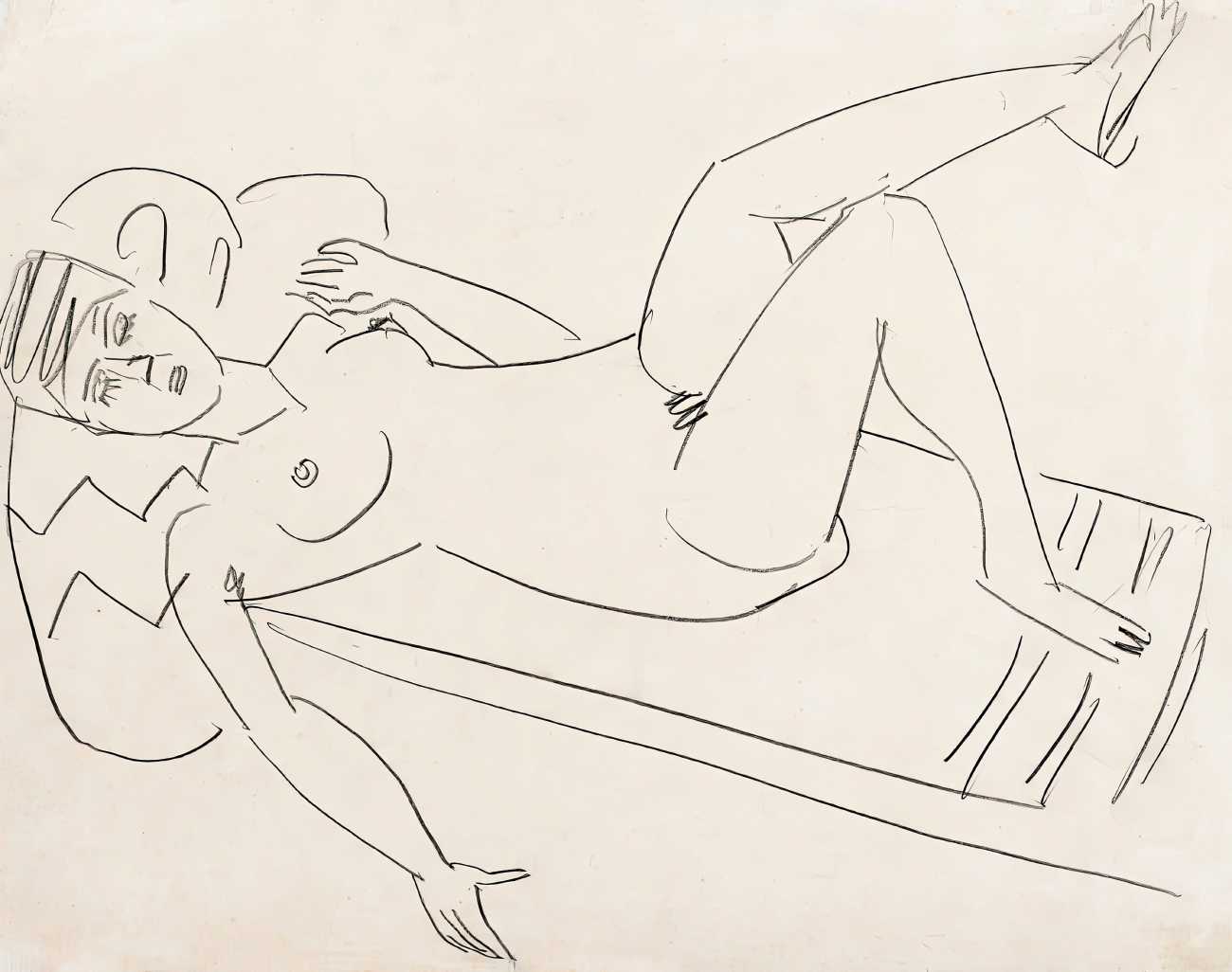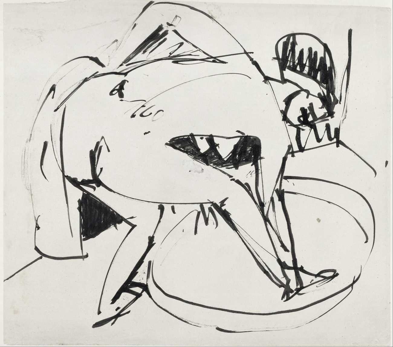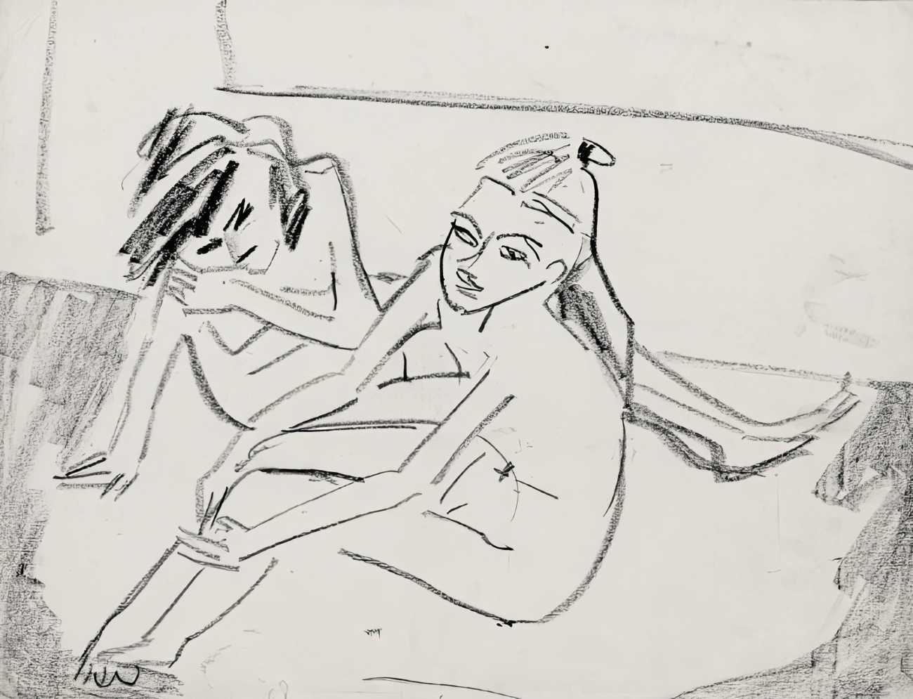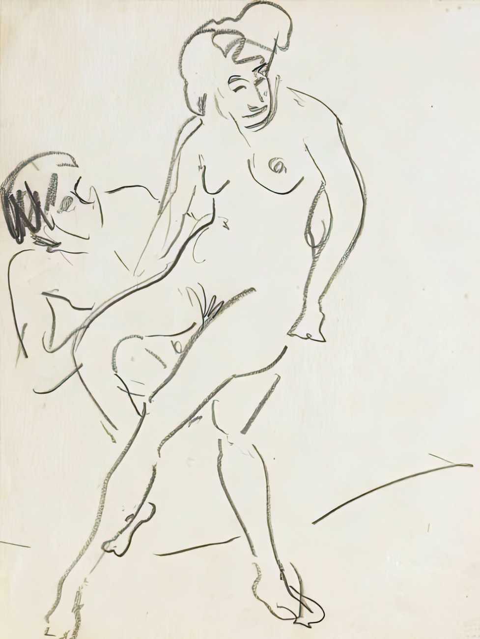 In Kirchner’s drawings the erotic appears with a directness and immediacy distinct from the more theatrically charged sensuality of his paintings. Working quickly with charcoal, ink or pencil, Kirchner used drawing as a laboratory for exploring bodily presence stripped of narrative context or painterly drama. The line became the primary expressive agent, recording desire as a kinetic impulse rather than as a composed scene. His naked subjects often seem caught in a moment of transition – stretching, reclining, dressing, bathing – captured with an economy of line suggesting spontaneity and intimacy.